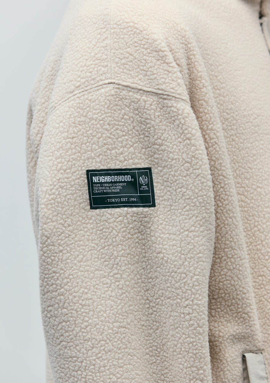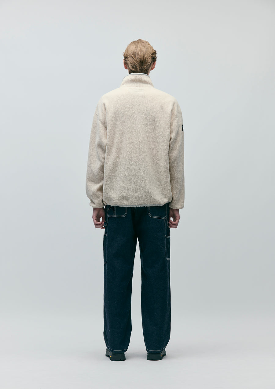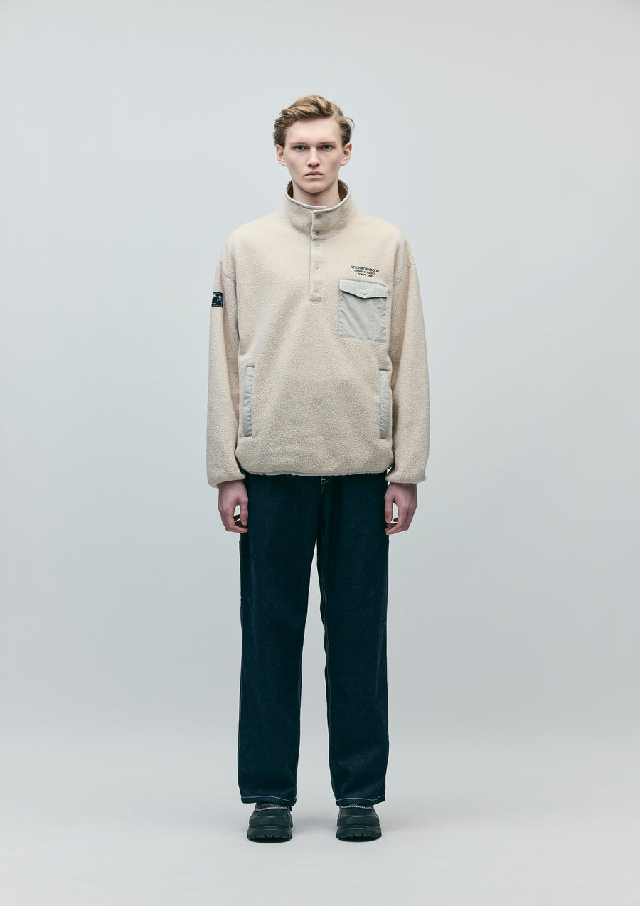 A stand collar pullover made of lightweight boa fabric with excellent heat retention, using POLARTEC Thermal Pro® (100% recycled polyester). Features a patch pocket on the left chest and zippered pockets on both sides. An adjustable elastic spindle is built into the hem. Includes an embroidered logo on the left chest and a brand tag on the side seam.