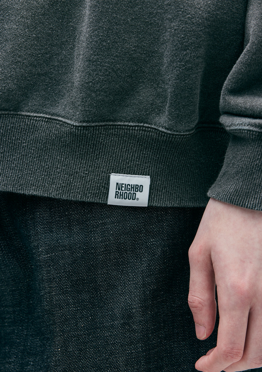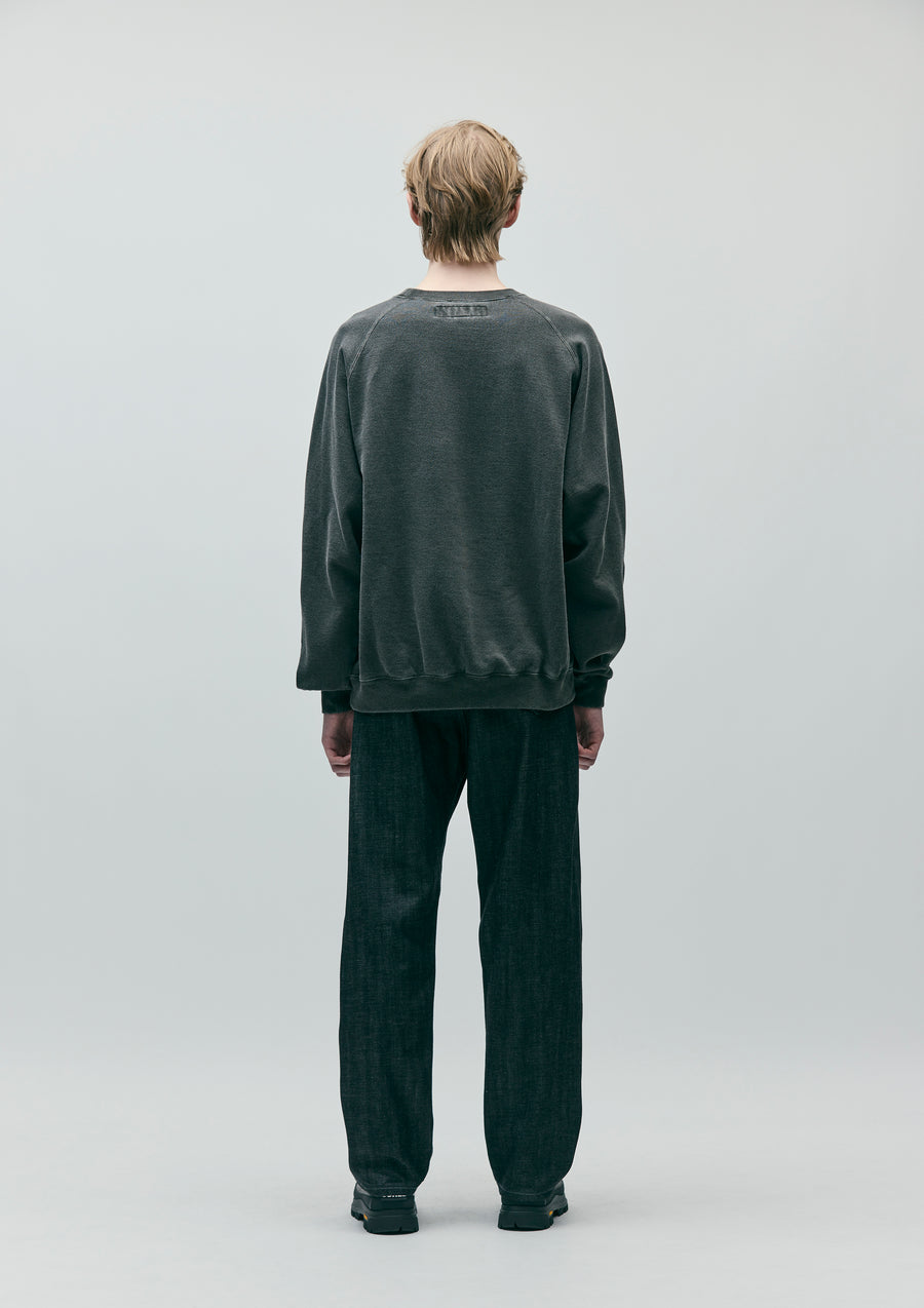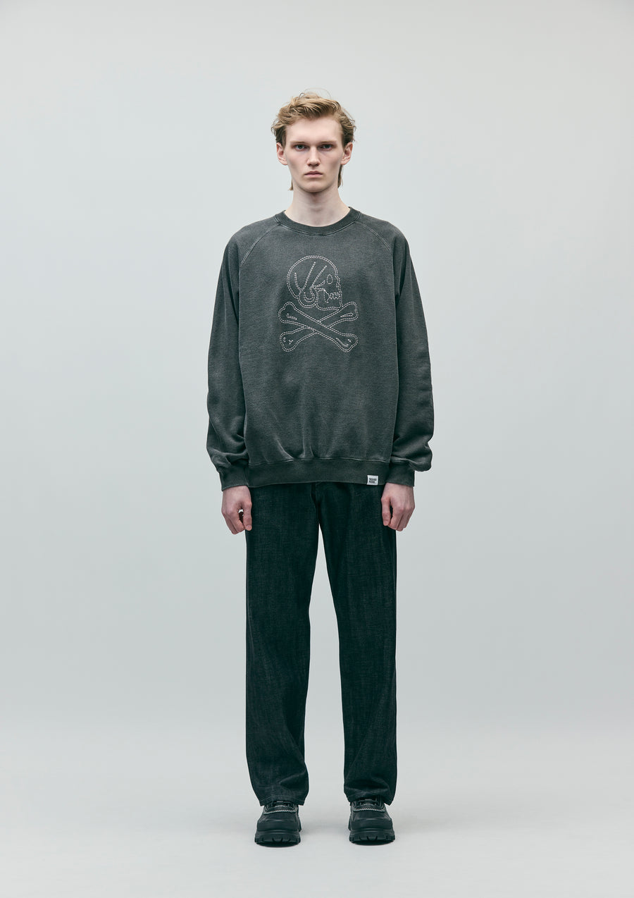 A crewneck pullover made from loopback fabric, pigment-dyed in its finished state. Designed with raglan sleeves, it features bonded stitch embroidery of a skull motif on the front. A brand tag is attached to the side seam.