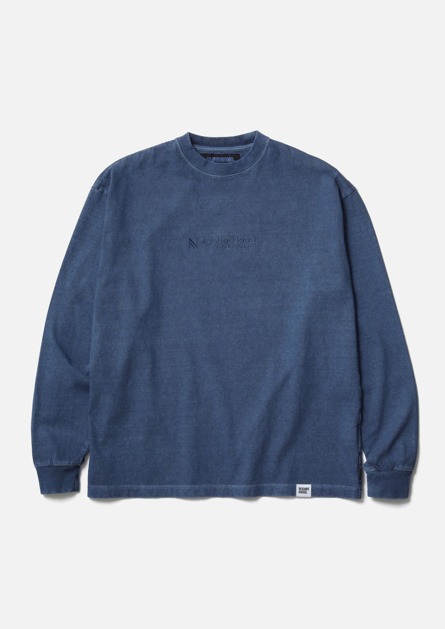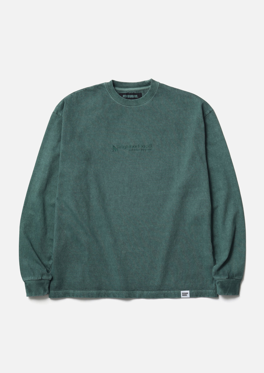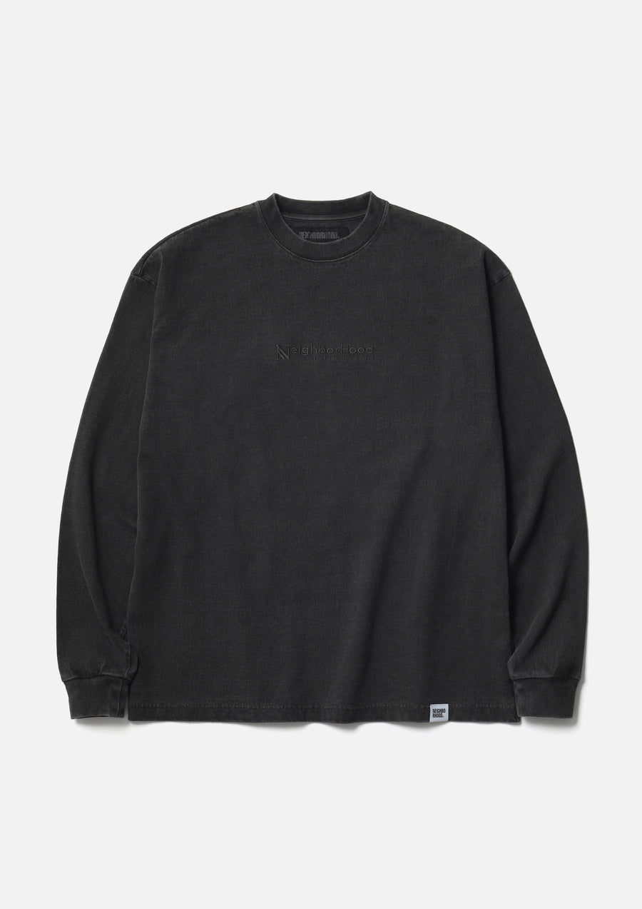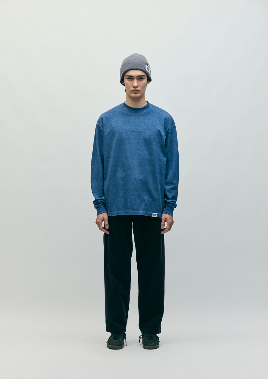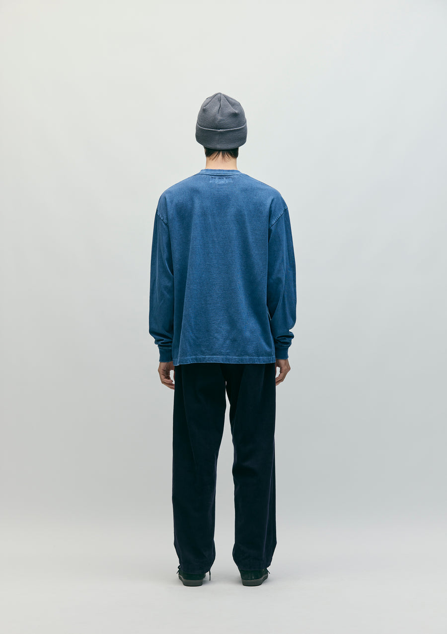 A crew neck cut-and-sew made of cotton jersey, pigment-dyed in its finished state. Features an embroidered logo on the front. Includes a brand tag on the side seam.