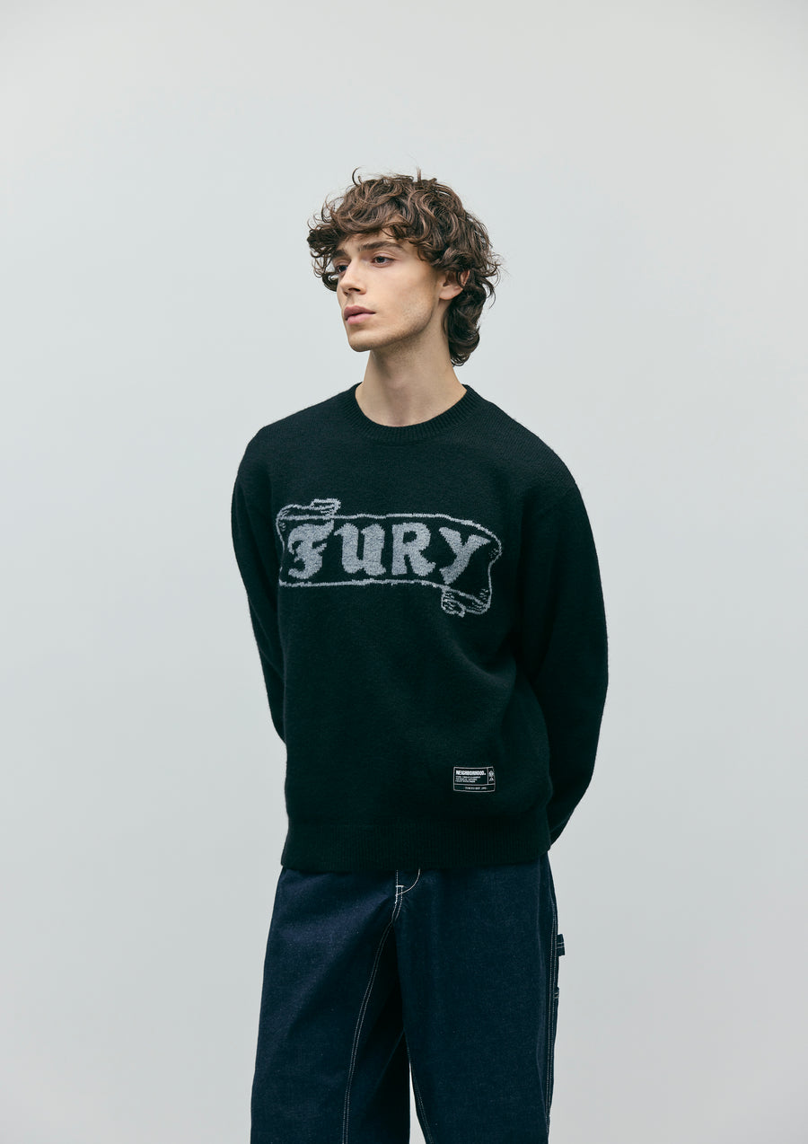 A crewneck knit featuring an intarsia-knit pattern, made from merino wool in 5-gauge jersey knitting. Brand tag on the left hem.