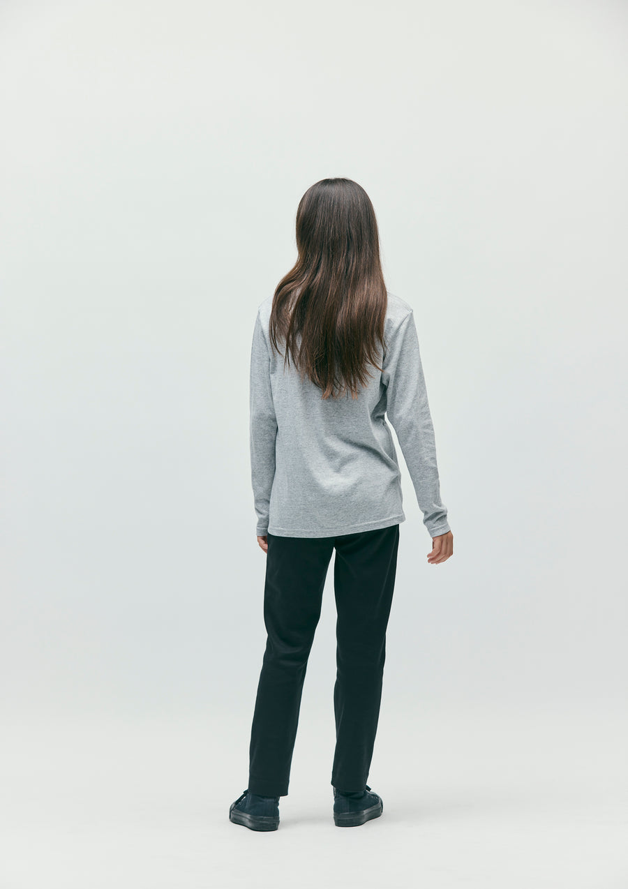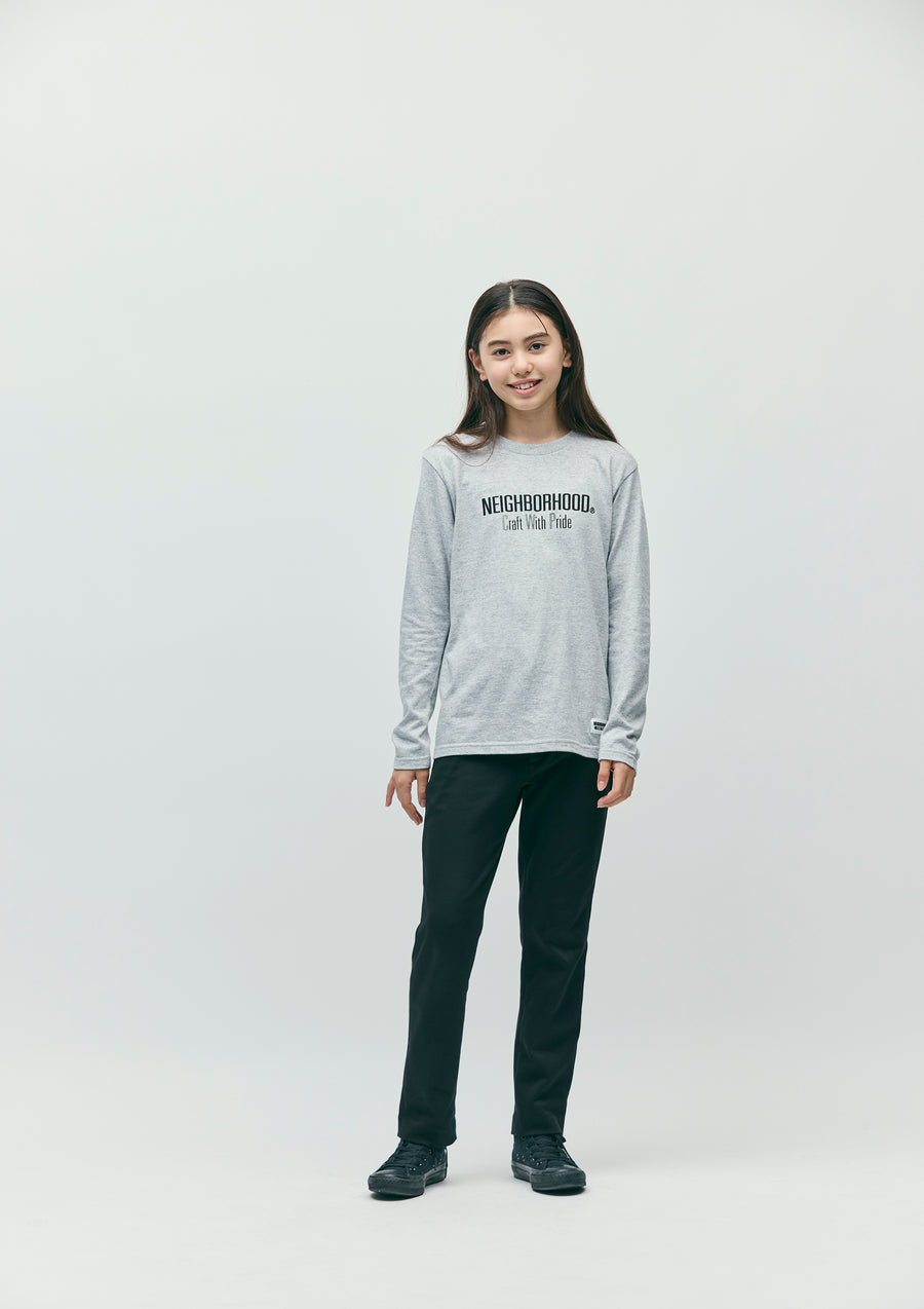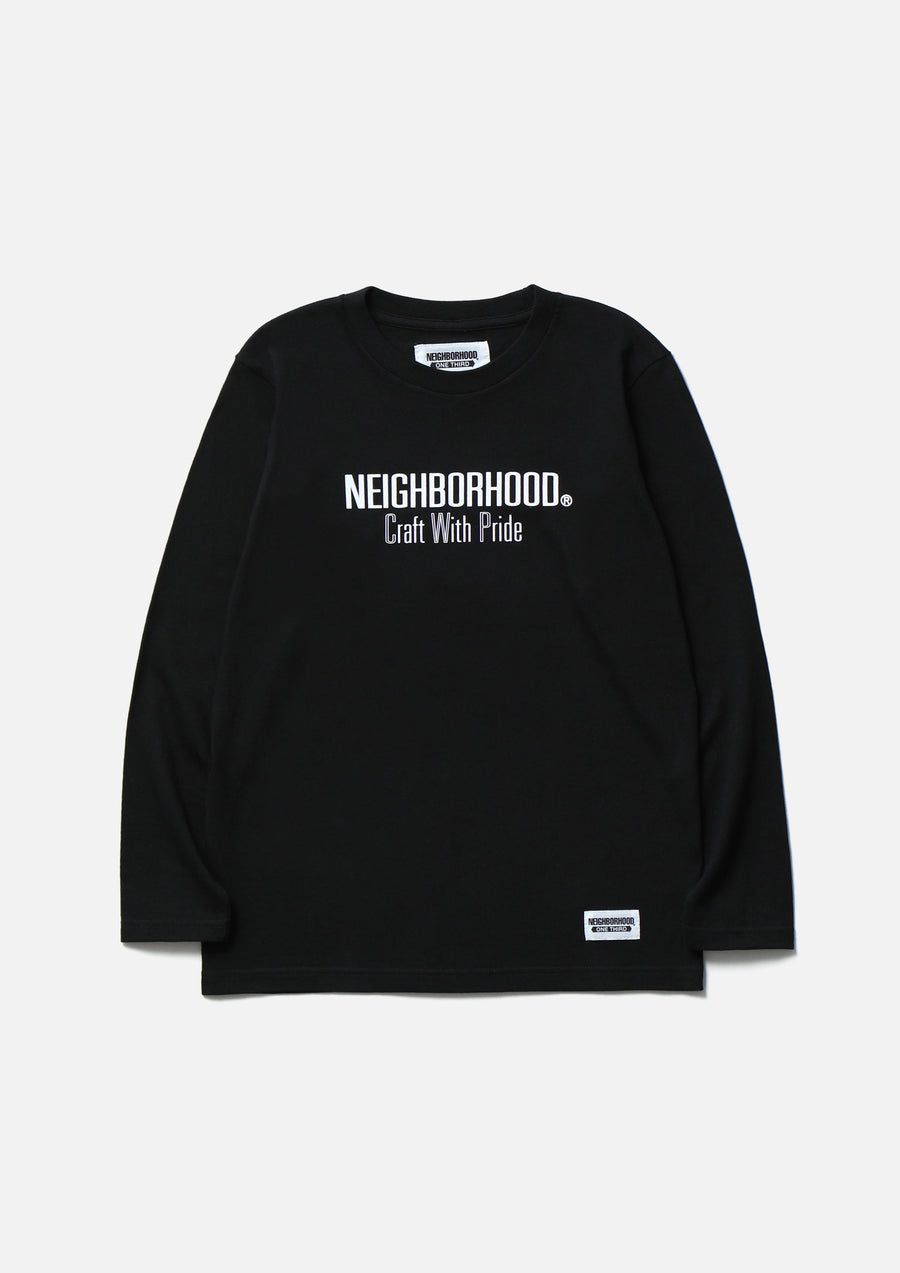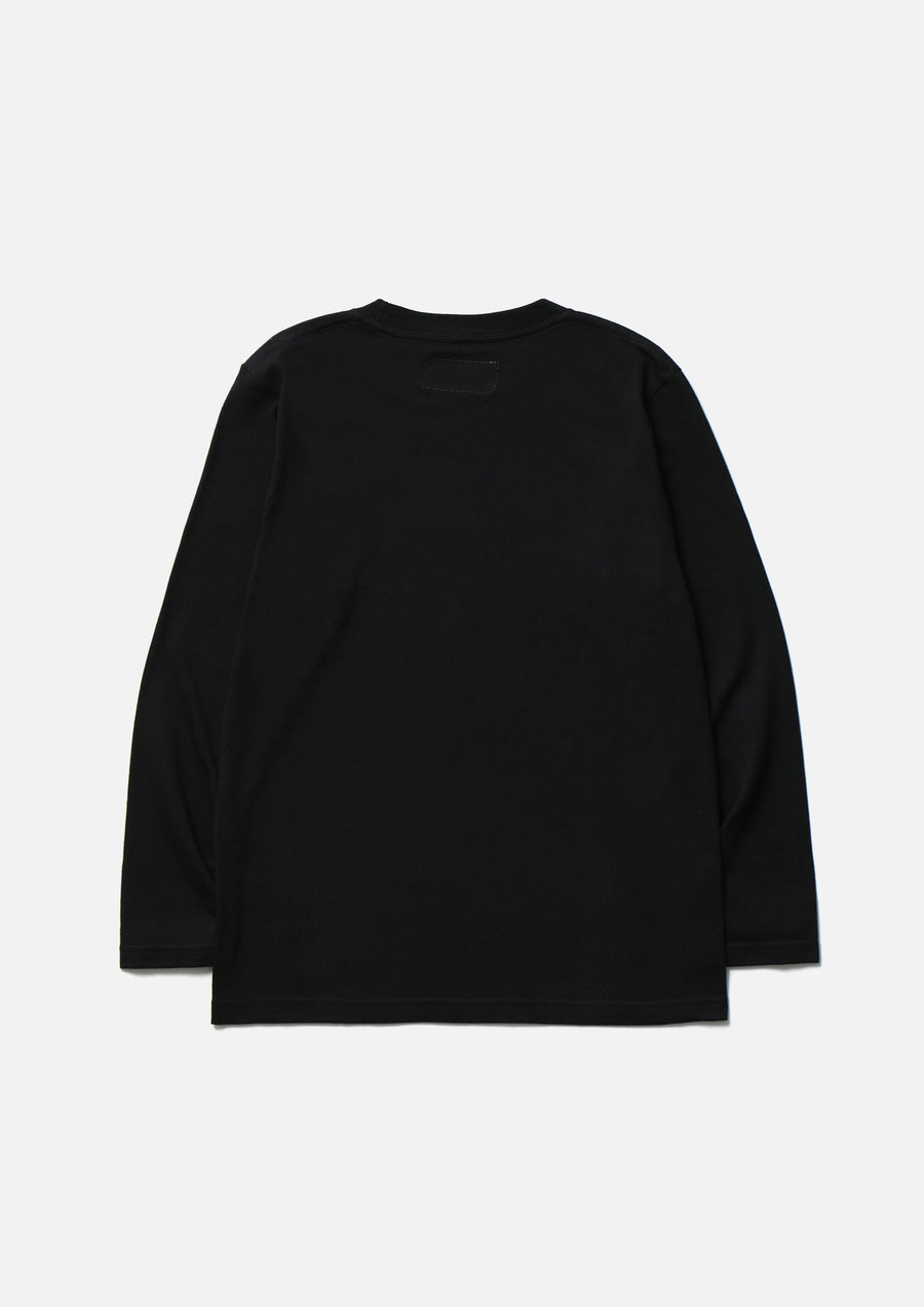 A long-sleeve T-shirt made of a 5.6oz heavyweight body. Printed logo on the front. A name tag is placed on the left hem.