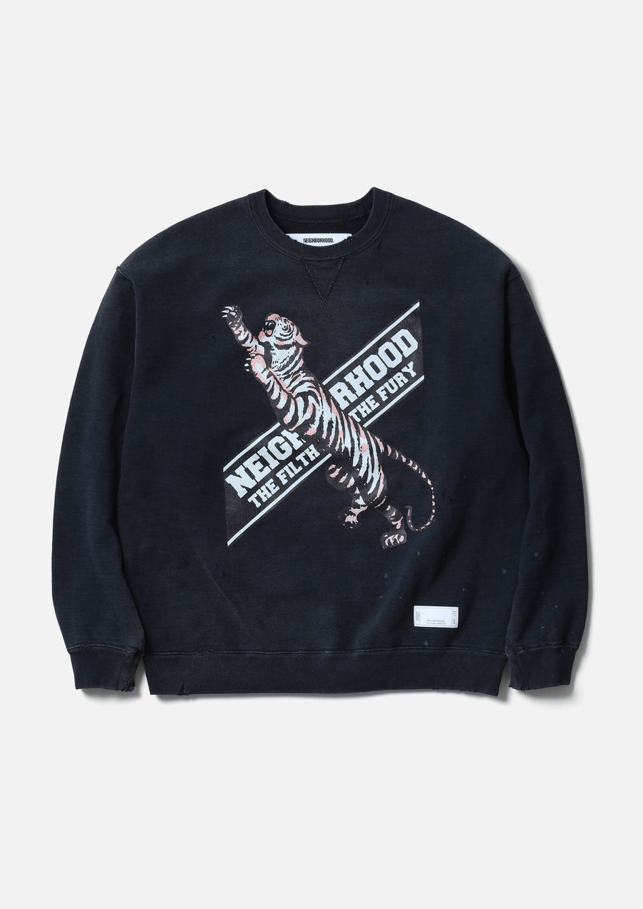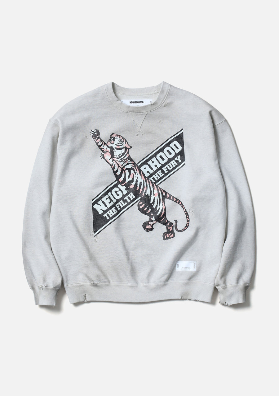 A crew neck pullover made of tightly knit fleece-backed fabric with a faded look, enhanced with a savage treatment. Realistic aging effects are created through a combination of fading, paint drips, distressing, and damage processing. Features a tiger motif graphic print on the front. Includes a brand tag on the side seam.