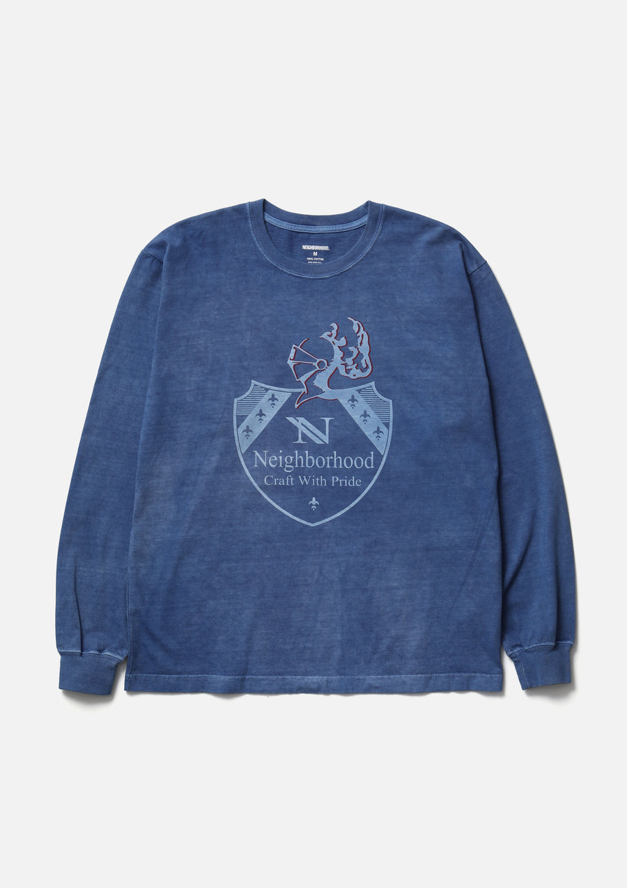 A long-sleeve T-shirt made of an original cotton jersey body, pigment-dyed for a unique finish. Printed graphic on the front. One-wash finish.