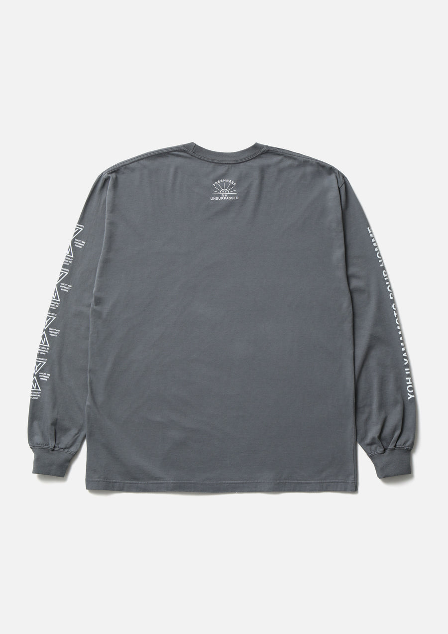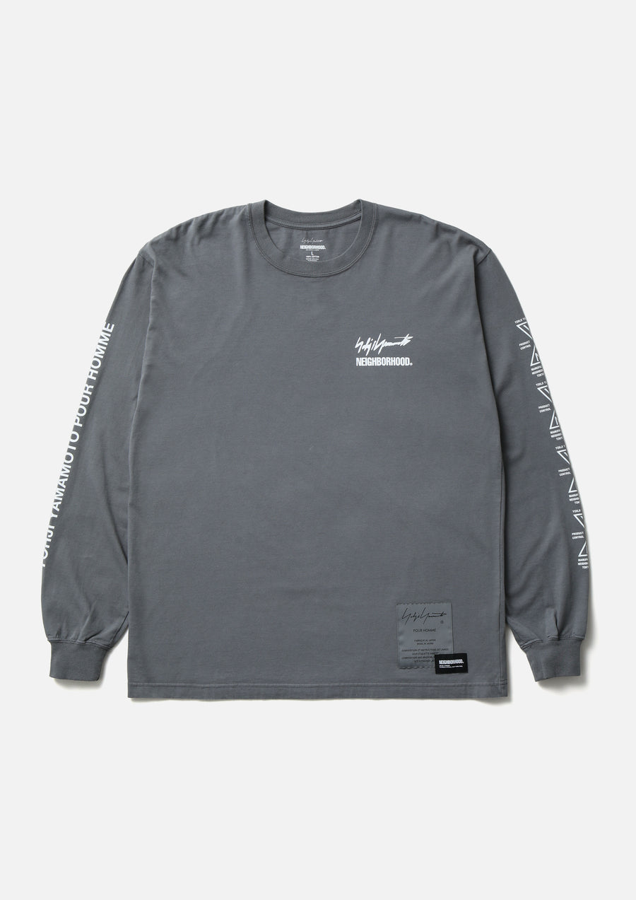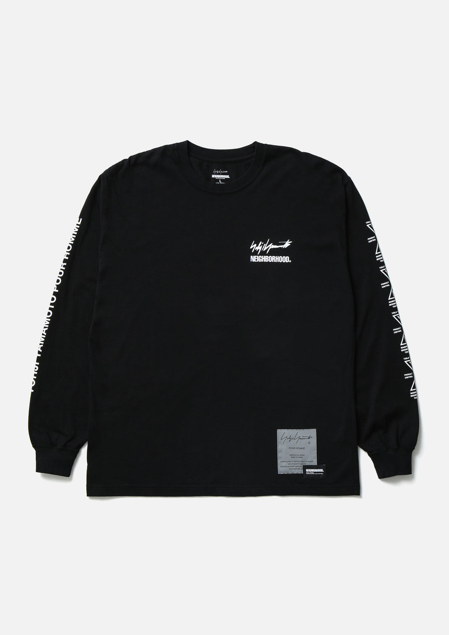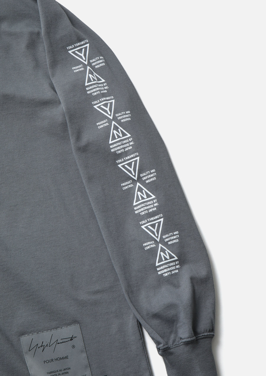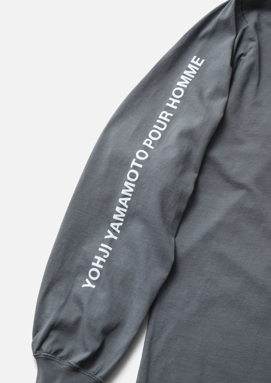 Long-sleeve T-shirt using an original cotton-jersey body. Logo and graphic printed. Finished with a brand tag at the left hem. One-wash finish. A collaboration with Yohji Yamamoto POUR HOMME.
