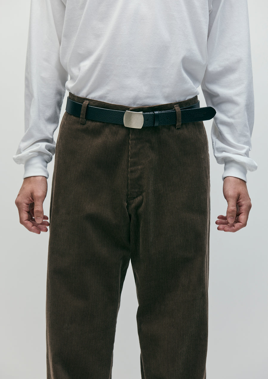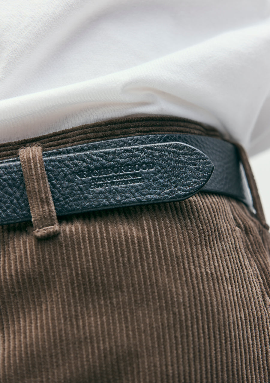 A wide leather belt made from Italian shoulder leather, characterized by natural color variations and a unique grain texture, achieved using dye-only finishing. Features an original molded 33mm buckle with an engraved logo. Logo engraved on the belt tip. Belt width: 32mm. Available in 32-inch and 36-inch sizes.