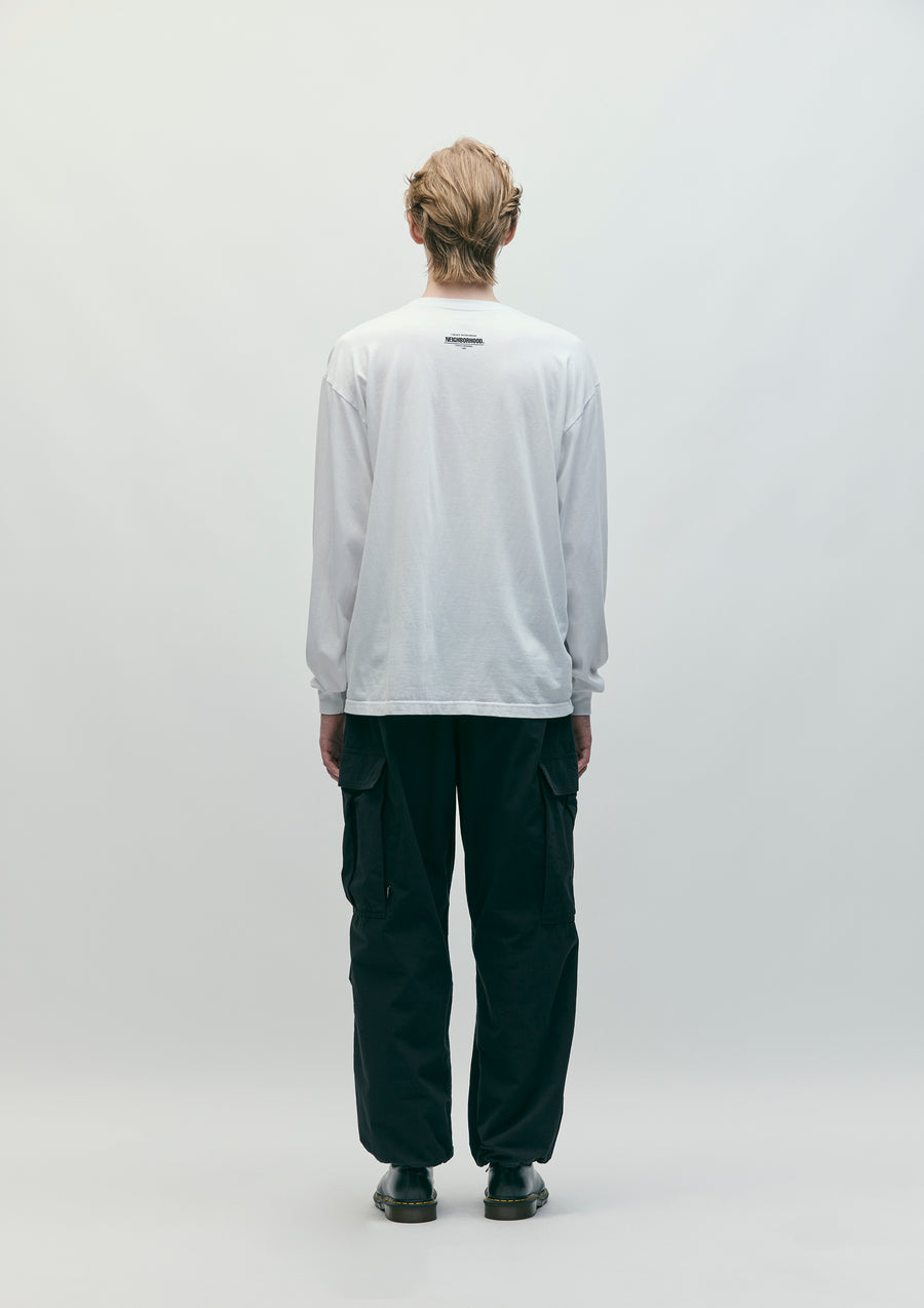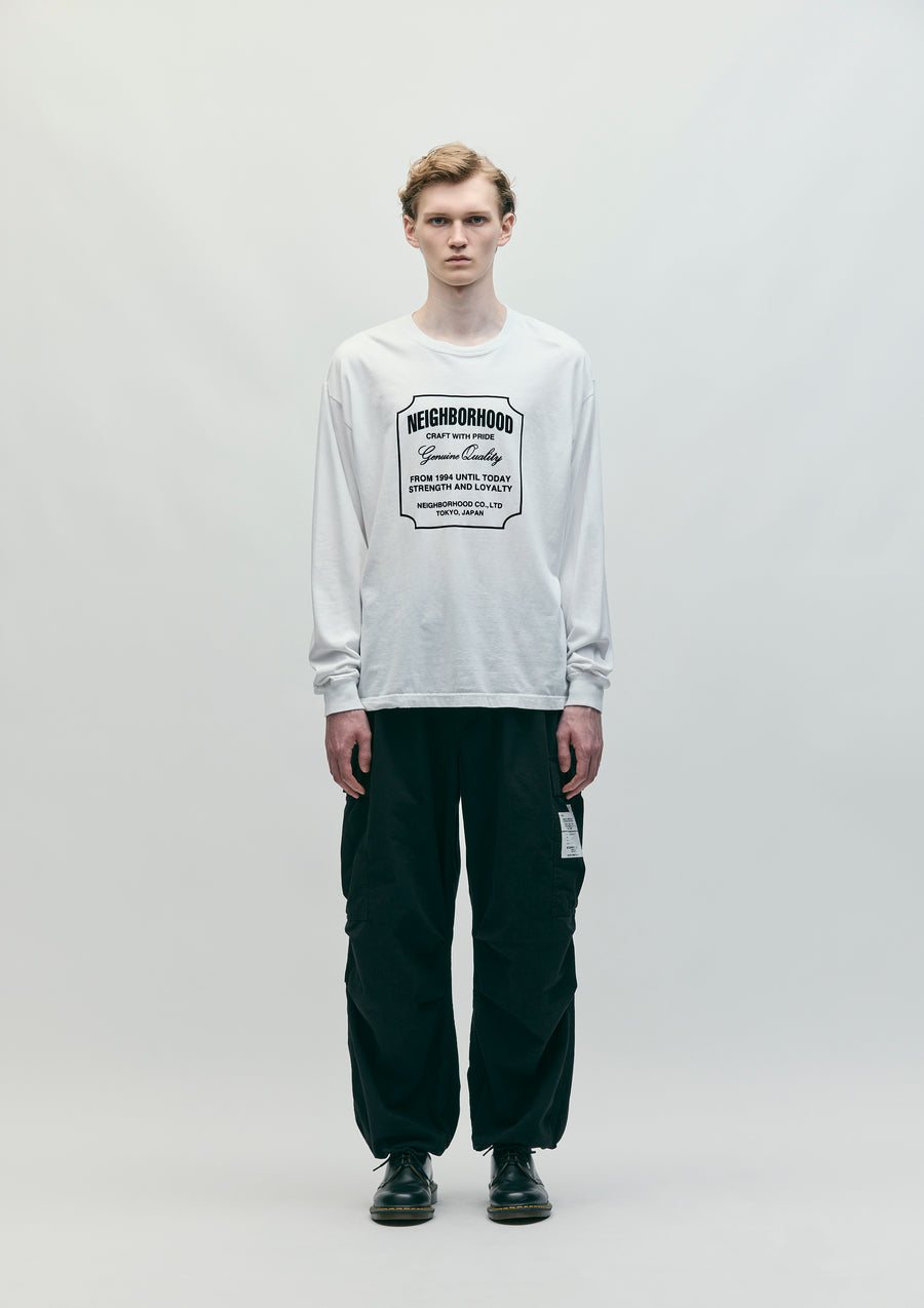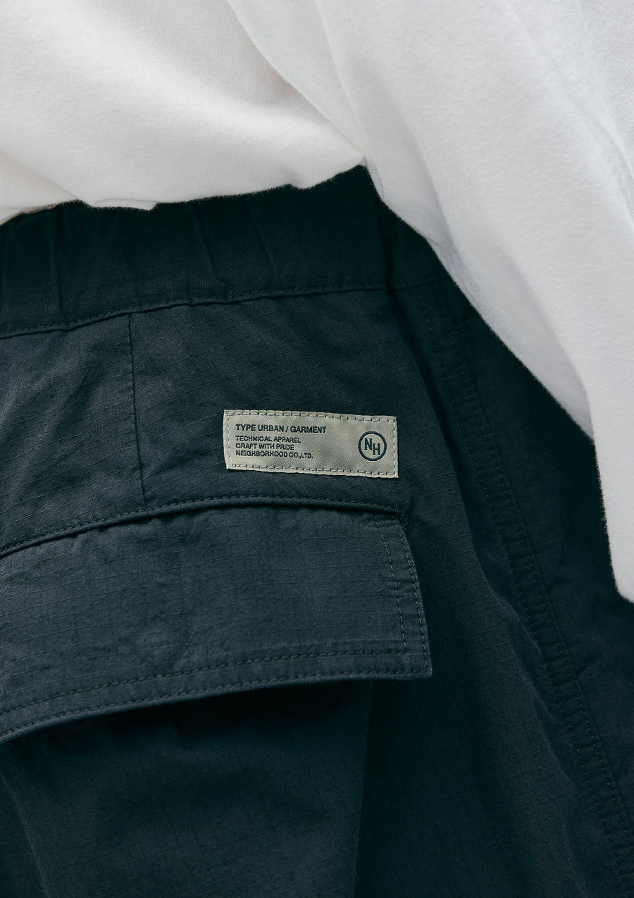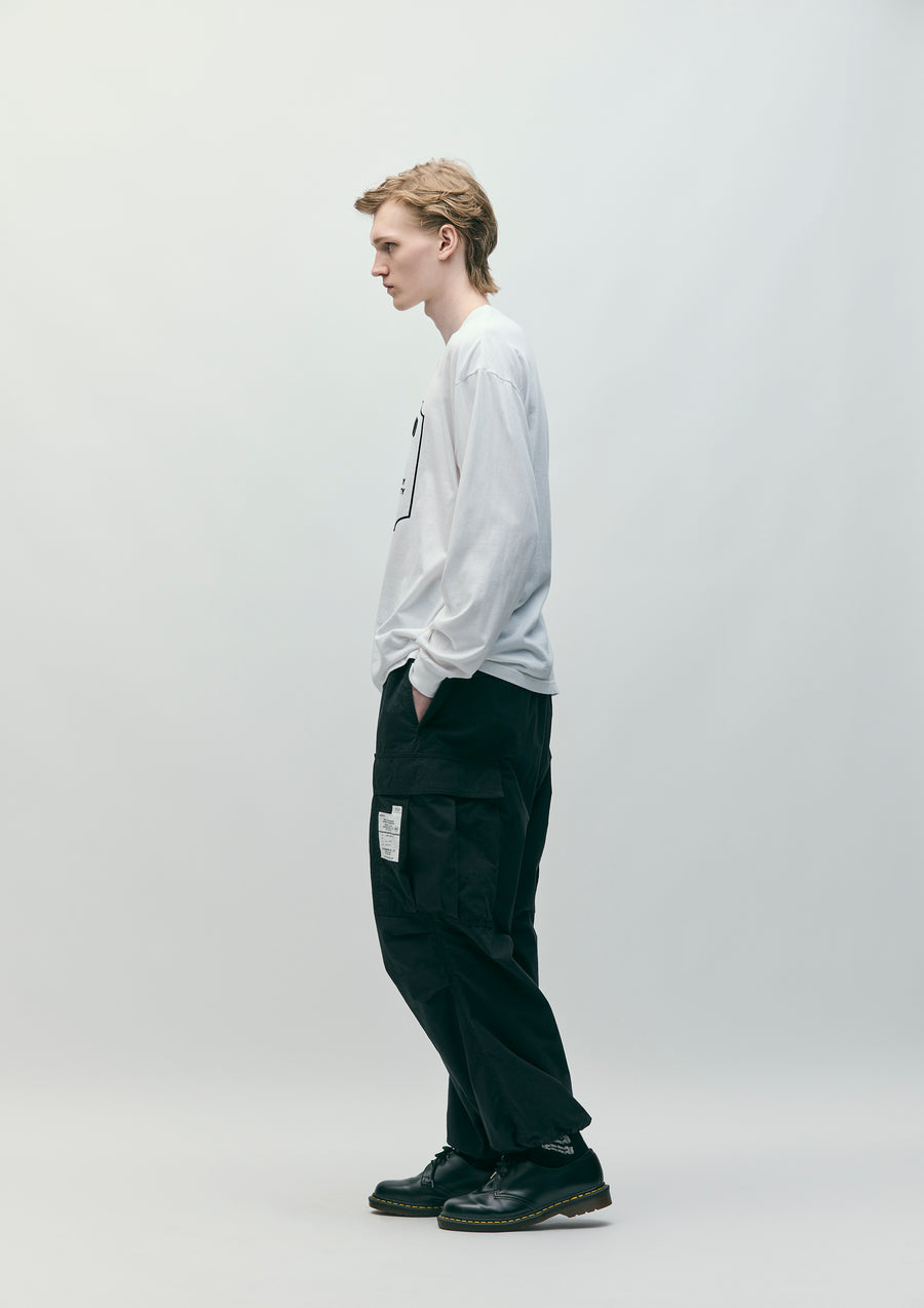 A pair of wide cargo pants made from high-density cotton-nylon ripstop fabric with a washer finish for a natural texture. Features an elastic waistband with an internal drawstring for an easy fit. Flap cargo pockets and hip pockets with hidden snap closures. Adjustable drawstring at the hem. Equipped with an original front zipper, and signature tape. Includes a brand tag on the pocket side. Relaxed silhouette with pleats at the knees.