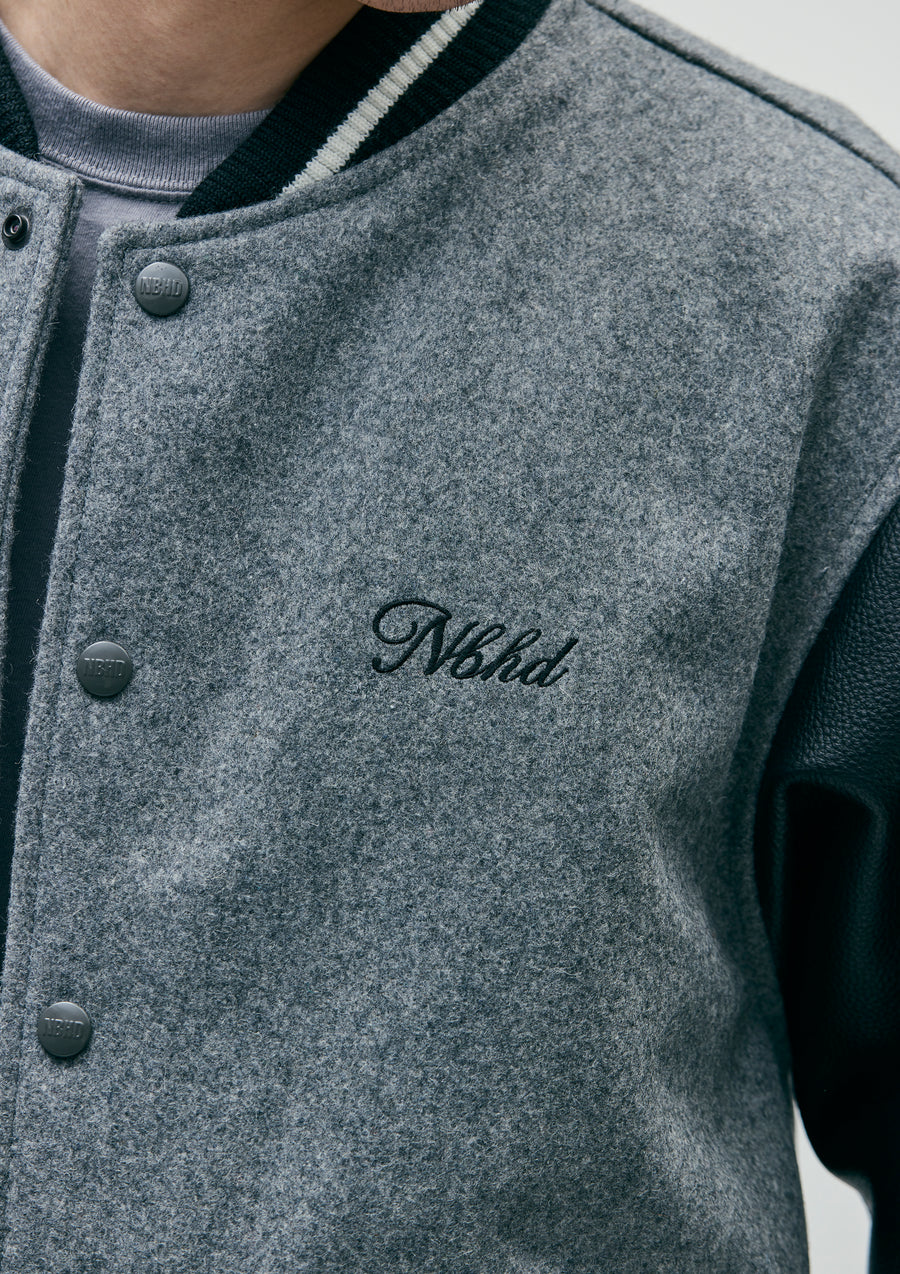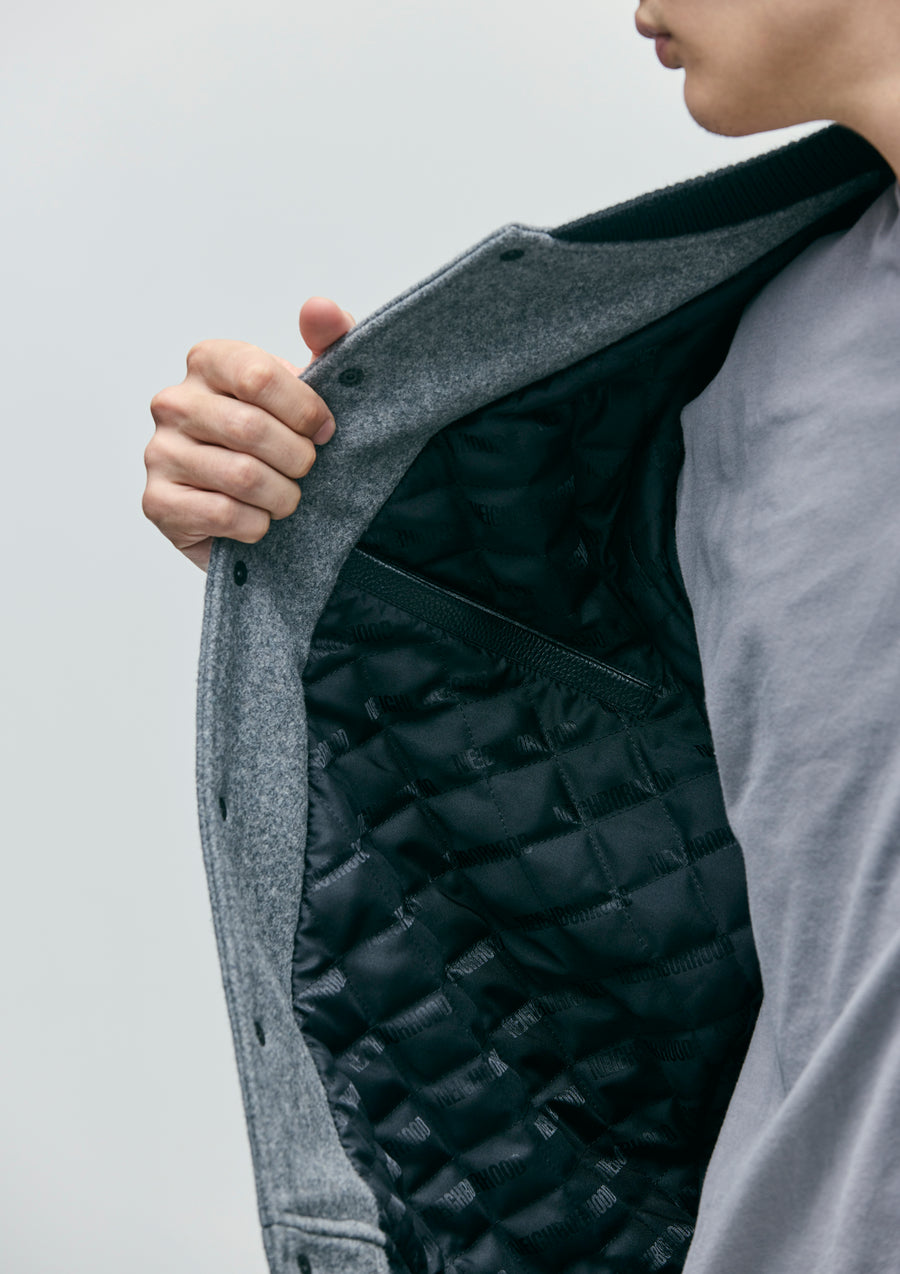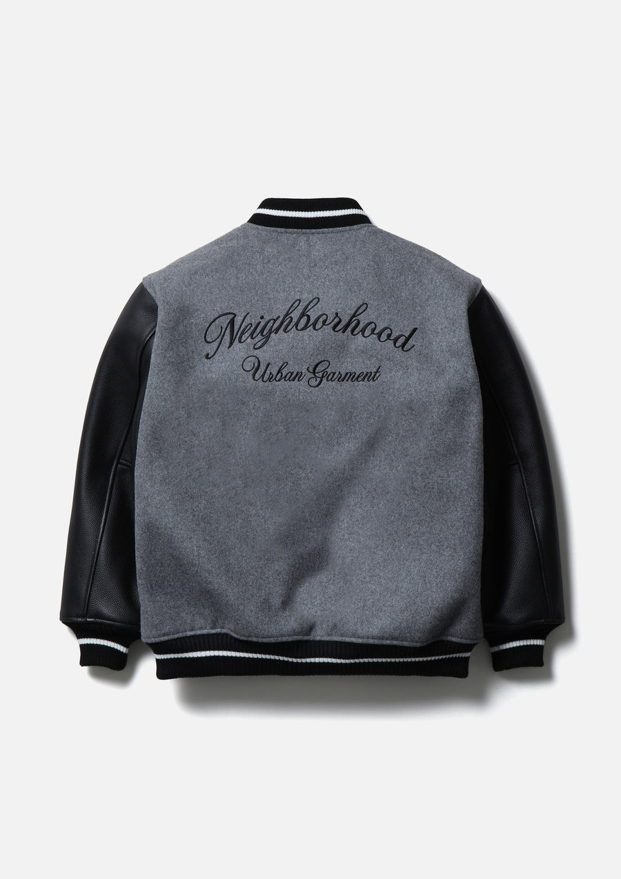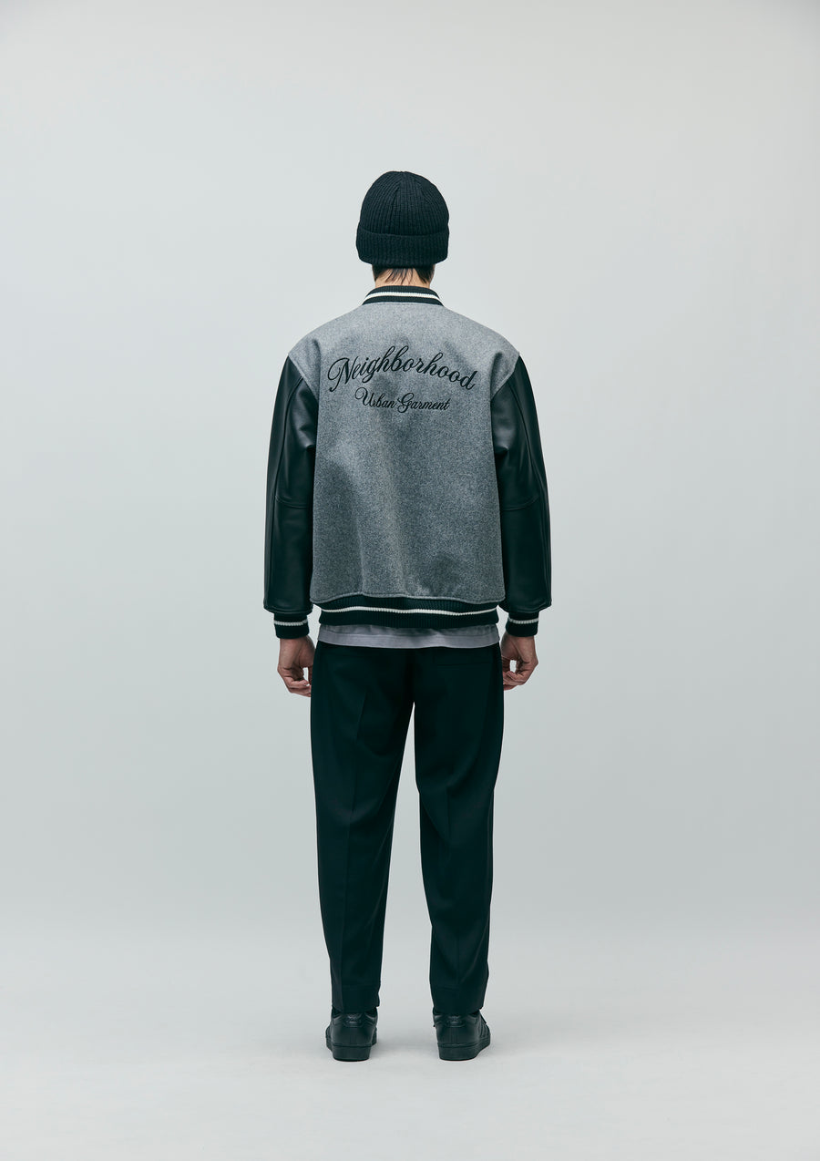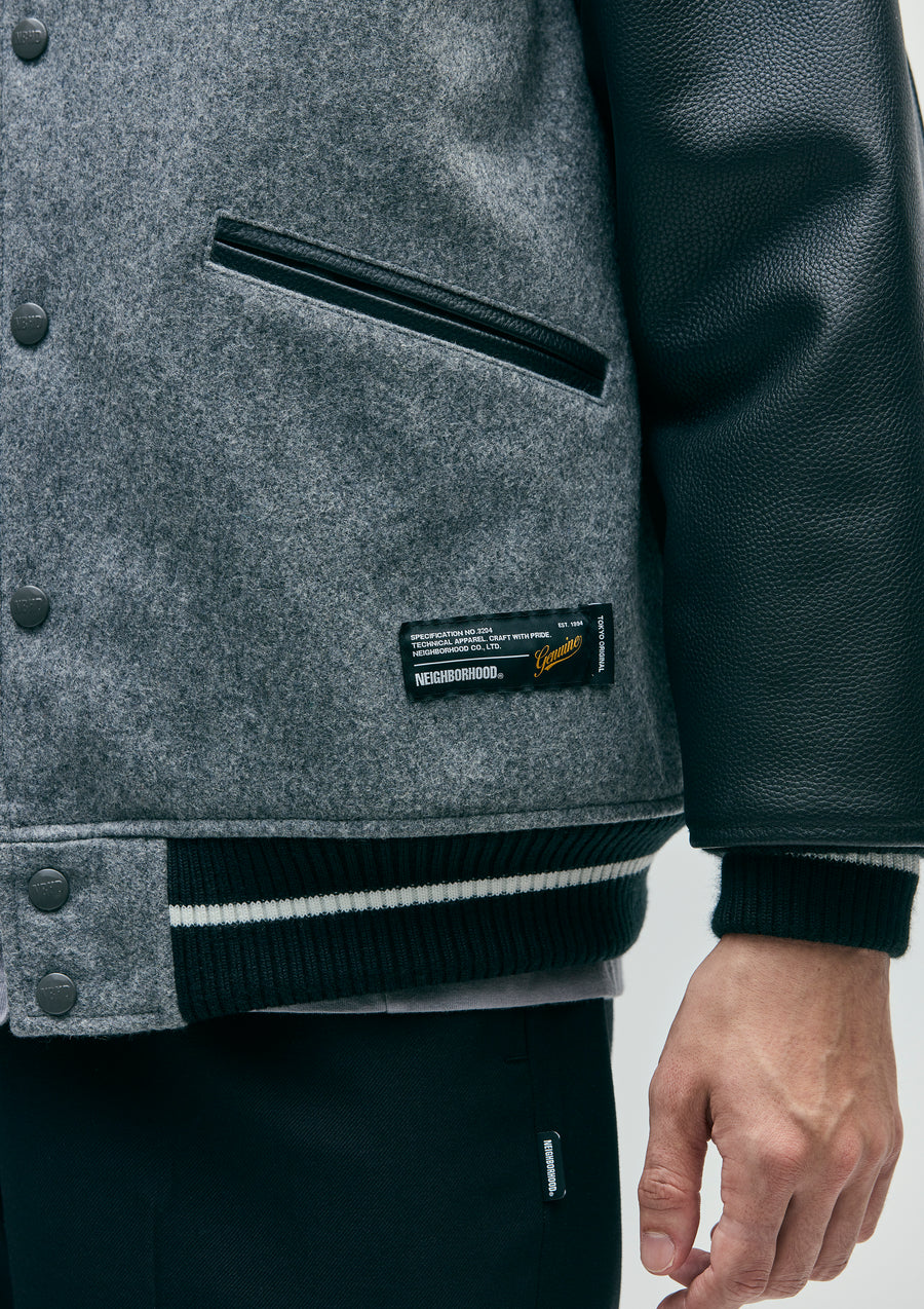 A stadium jacket combining thick, heavy melton fabric with cow leather. Embroidered logo on the left chest and back. Quilted lining with a jacquard logo. Equipped with original snap buttons, a brand tag on the left hem, and on the side seam.