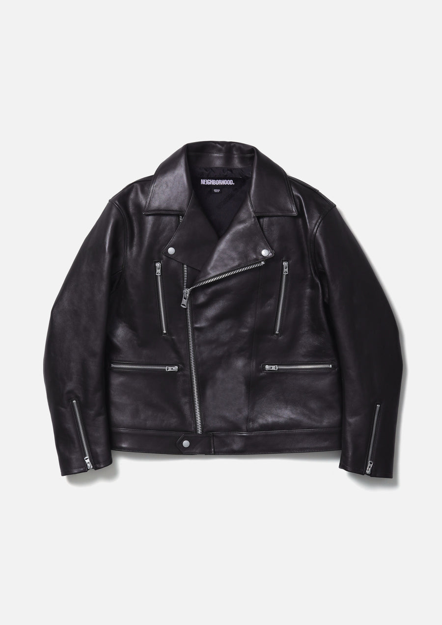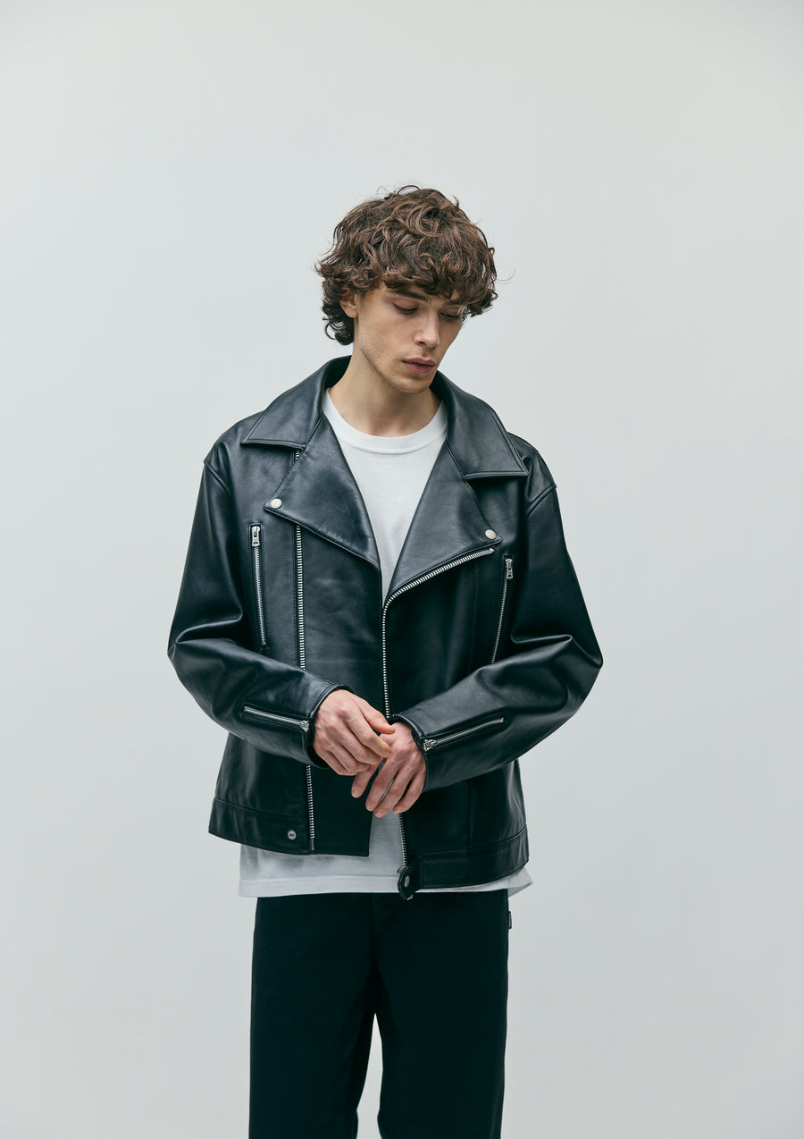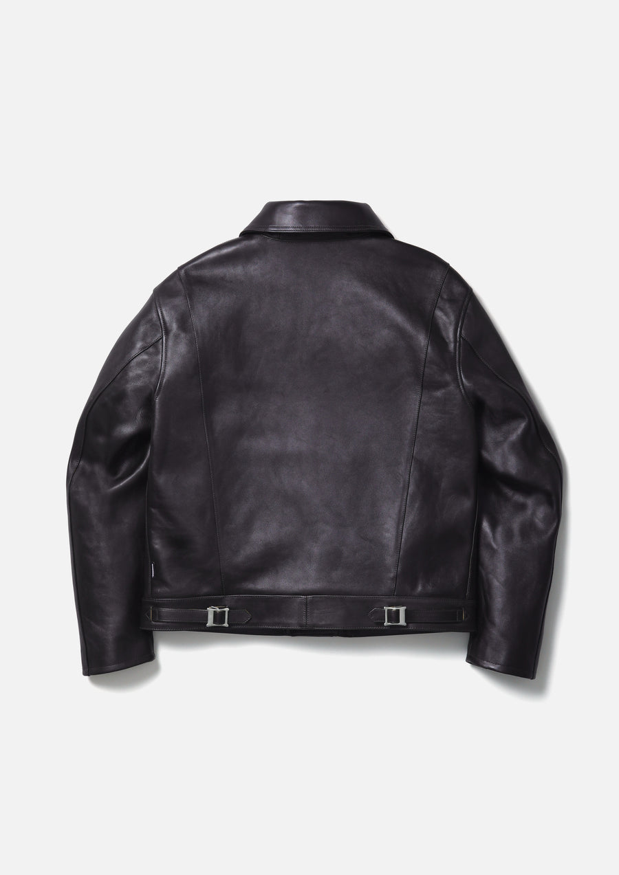 A double riders jacket made from tea-core cow leather, which is heavy yet conforms to the body over time. The front, pockets, and cuffs feature original engraved zipper pulls. The hem is equipped with an adjustable belt. The interior is lined with jacquard logo fabric. A brand tag is attached to the side seam.