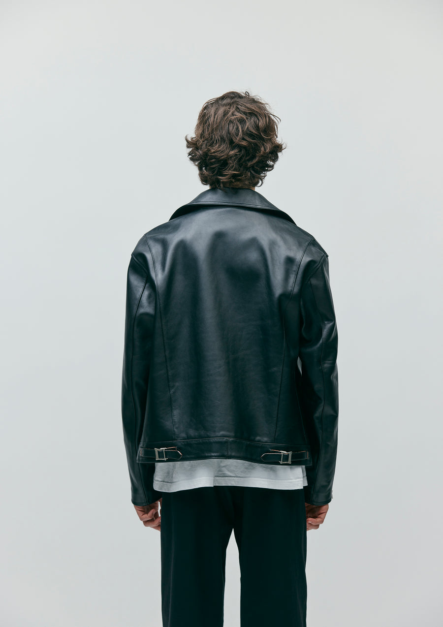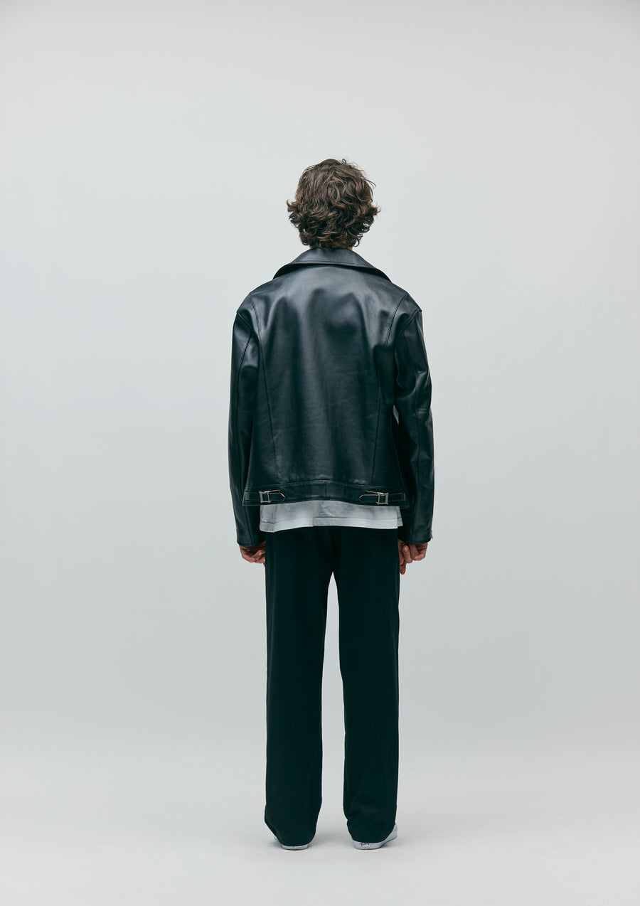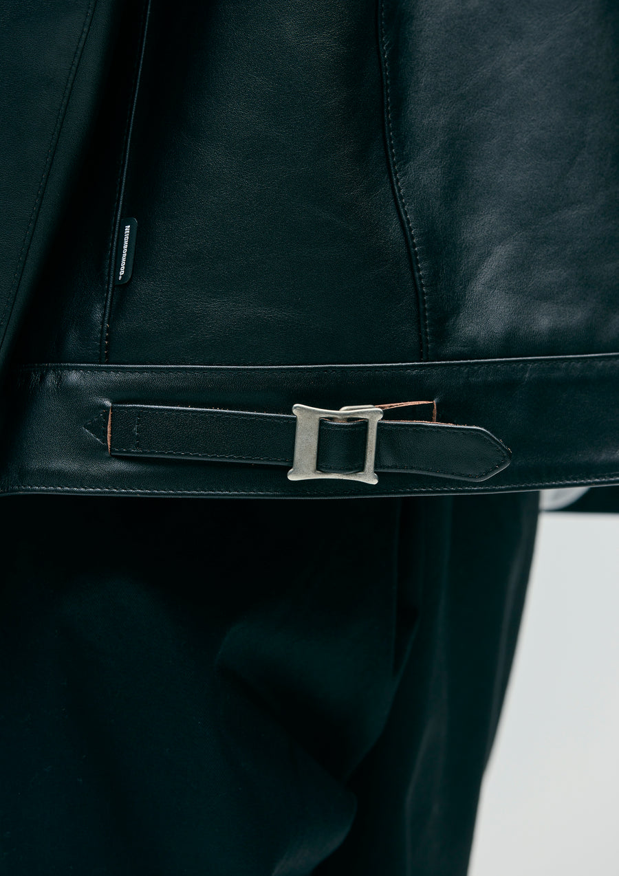 A double riders jacket made from tea-core cow leather, which is heavy yet conforms to the body over time. The front, pockets, and cuffs feature original engraved zipper pulls. The hem is equipped with an adjustable belt. The interior is lined with jacquard logo fabric. A brand tag is attached to the side seam.