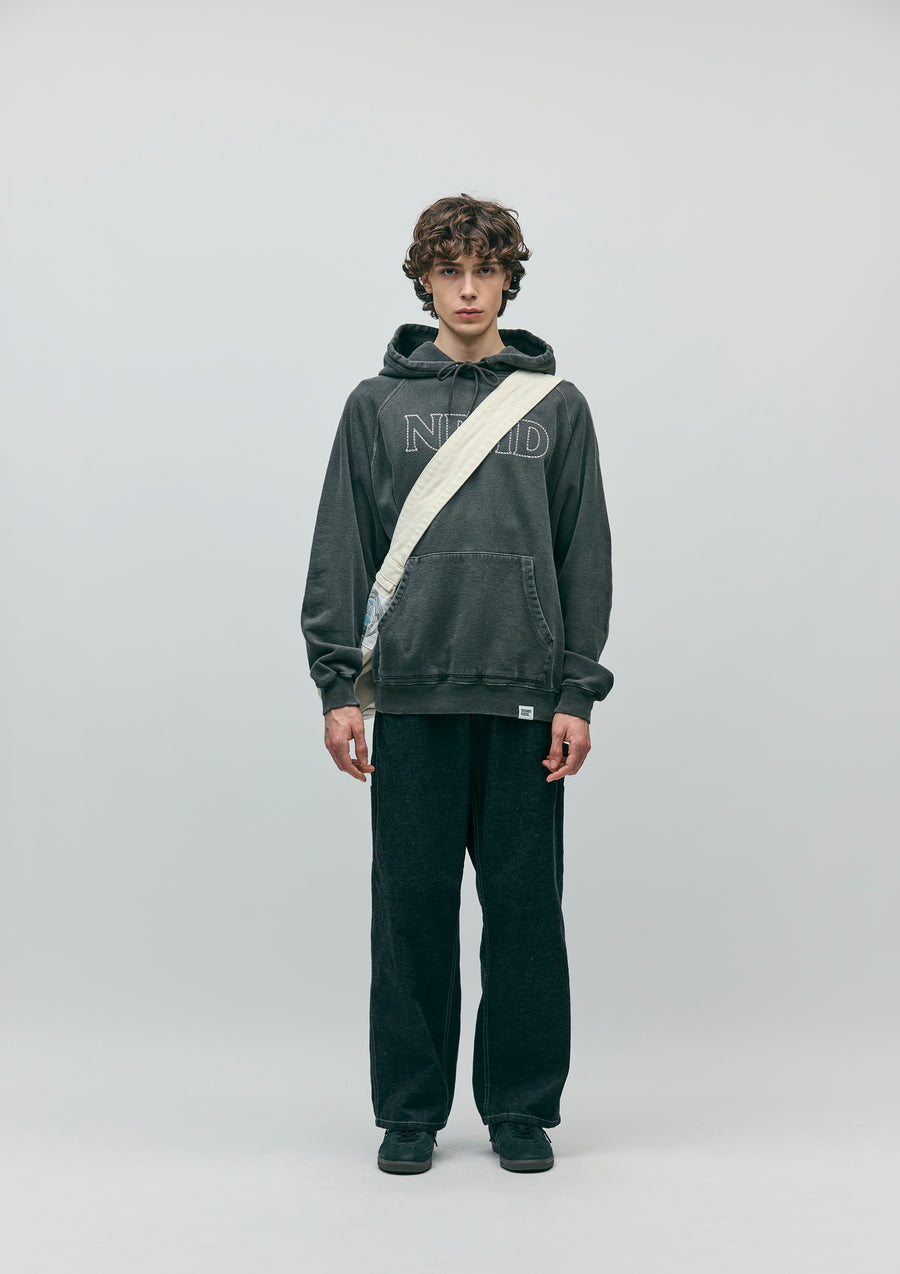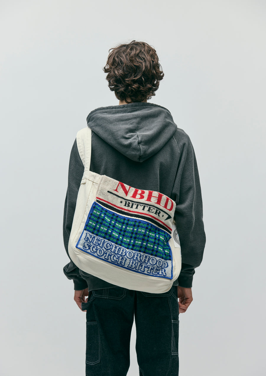 A newspaper bag made from No. 8 canvas with high durability, treated with bio-stone wash processing. One side is decorated with an original pub towel, and a scooter motif patch is placed on the side. Comes with a dedicated name tag for custom-crafted items.