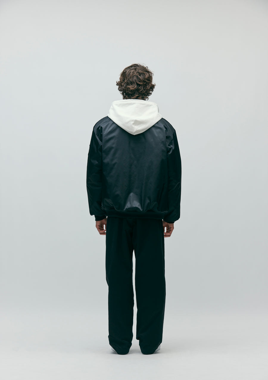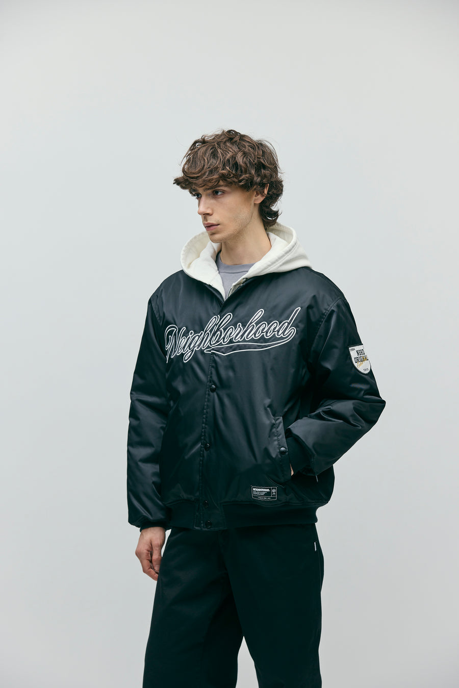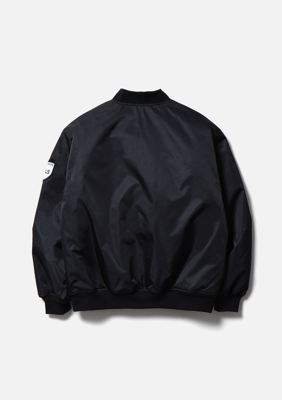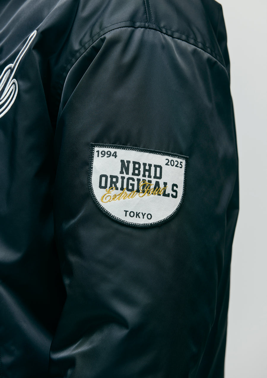 A baseball jacket made from tough nylon twill fabric with moderate thickness and firmness. Features a large embroidered satin patch logo across the front and a combination of printed and embroidered patches on the left sleeve. Equipped with original snap buttons. A brand tag on the left hem and on the side seam.