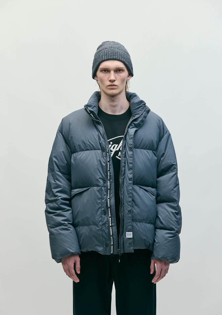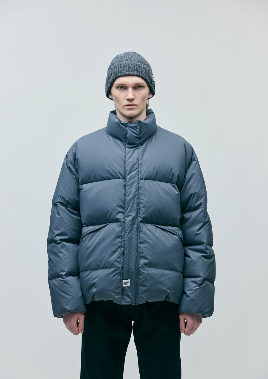A down jacket made from lightweight nylon taslan taffeta fabric with a matte texture. A large front placket enhances heat retention. Flap pockets on both sides. The hem includes an adjustable elastic spindle. Embroidered logo on the back. A brand tag on the placket and side seam.