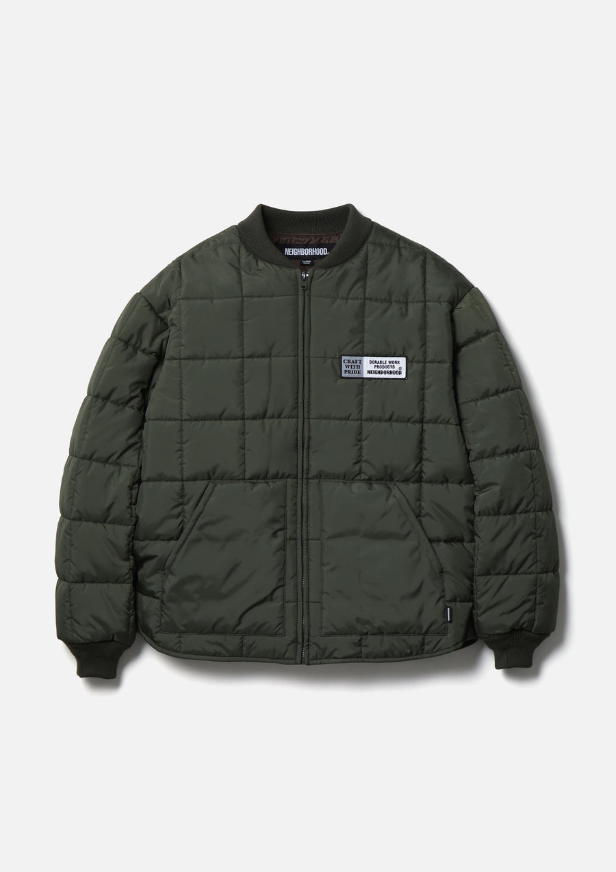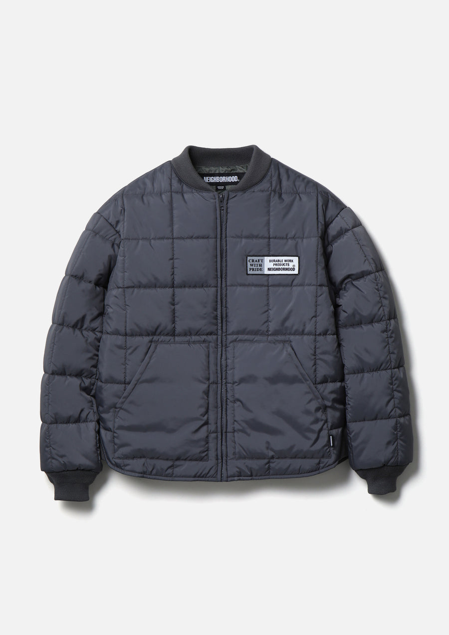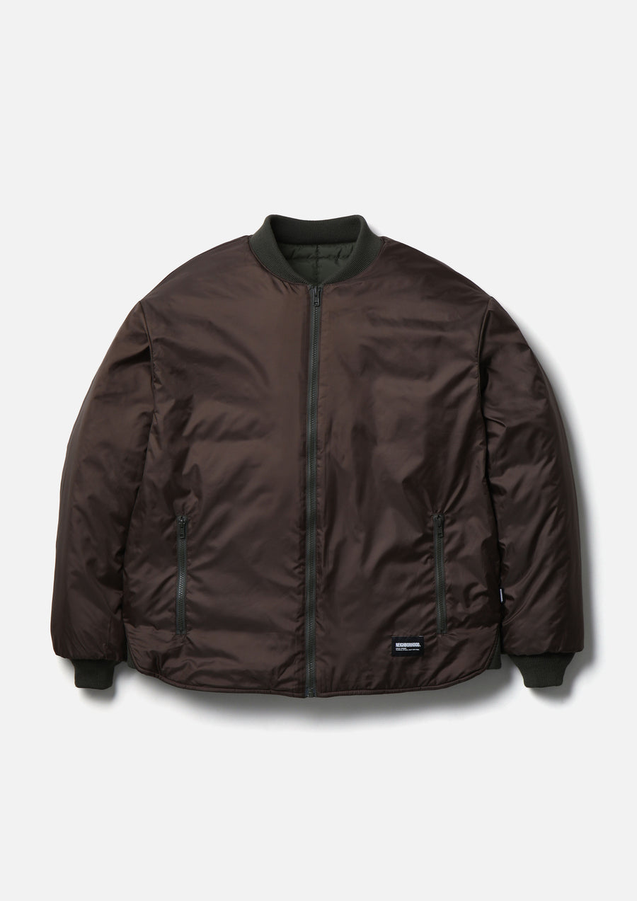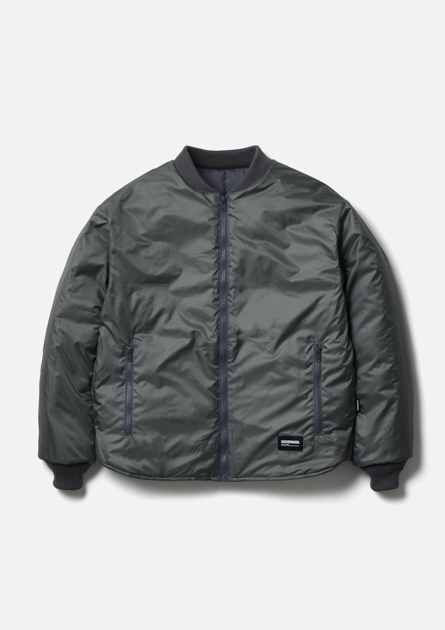 A reversible padded jacket made from water-resistant polyester taffeta fabric on both sides. The outer side uses recycled polyester with fluorine-free water-repellent processing and quilted polyester taffeta fabric. The inner side features anti-static and water-resistant polyester taffeta fabric. Logo print and logo patches on both sides. A brand tag is attached.