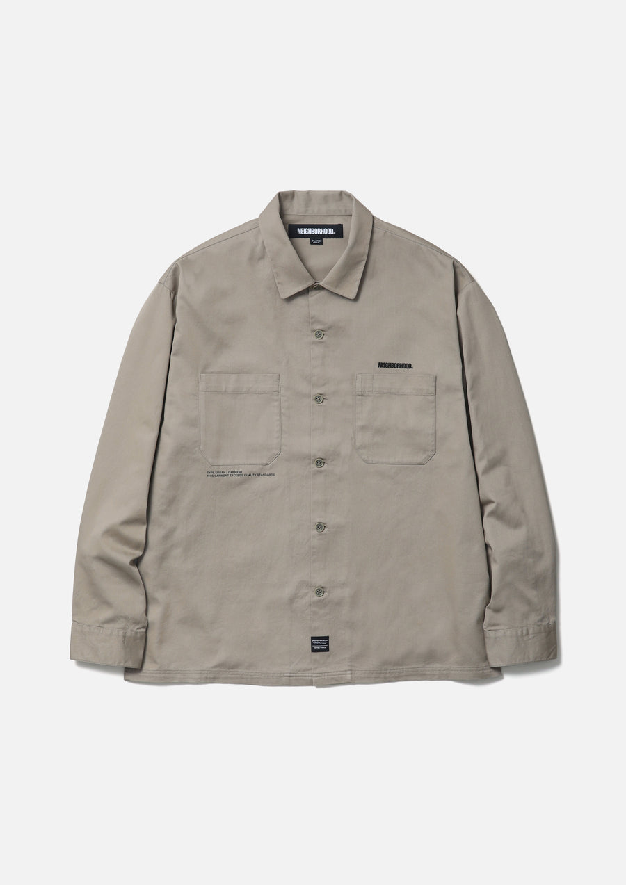 A work shirt made from mid-weight katsuragi fabric with a natural touch. Maintains a classic work shirt design with standard patch pockets. The left pocket includes a pen holder. Embroidered logo on the left chest and printed text below the right pocket. Equipped with original four-hole buttons, a brand tag on the placket and side seam. One-wash finish.