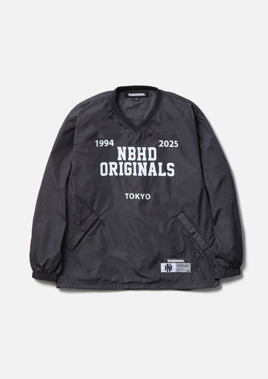A pullover shirt made from plain-weave taffeta fabric, densely woven with highly abrasion-resistant nylon yarn. V-neck ribbed design. The hem includes an adjustable elastic spindle. Graphic print on the front. Equipped with a brand tag on the left hem and side seam.