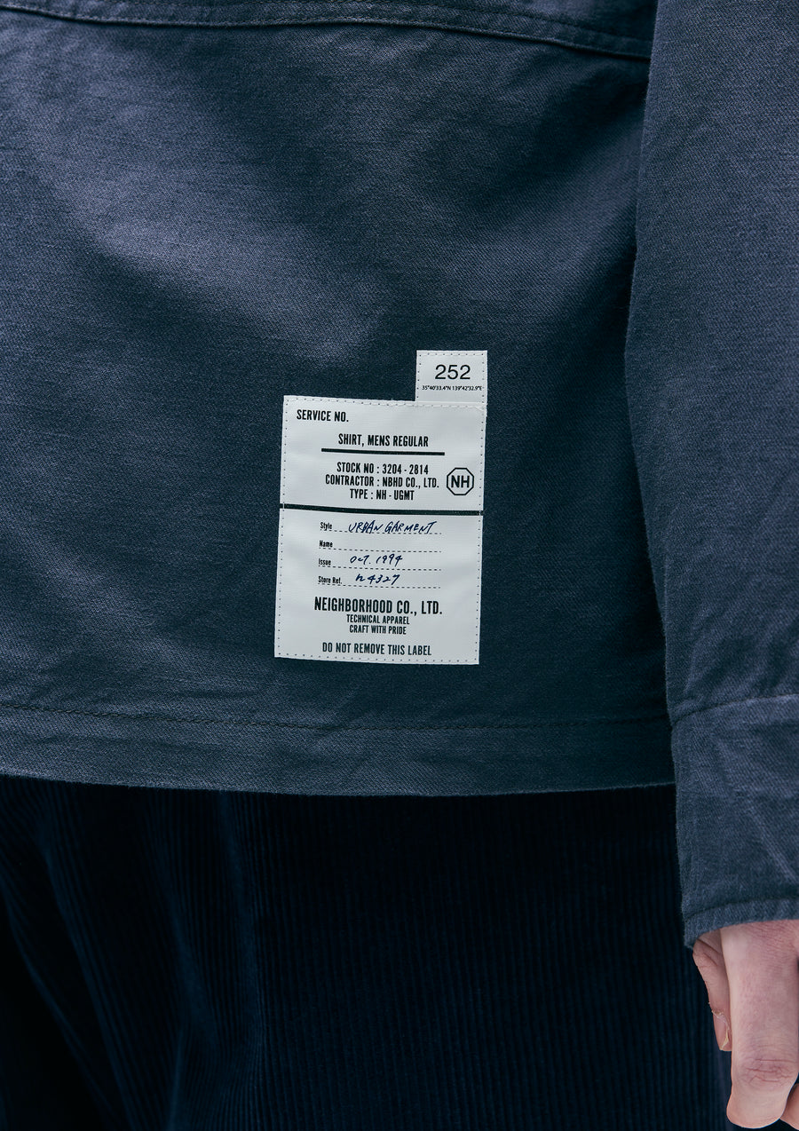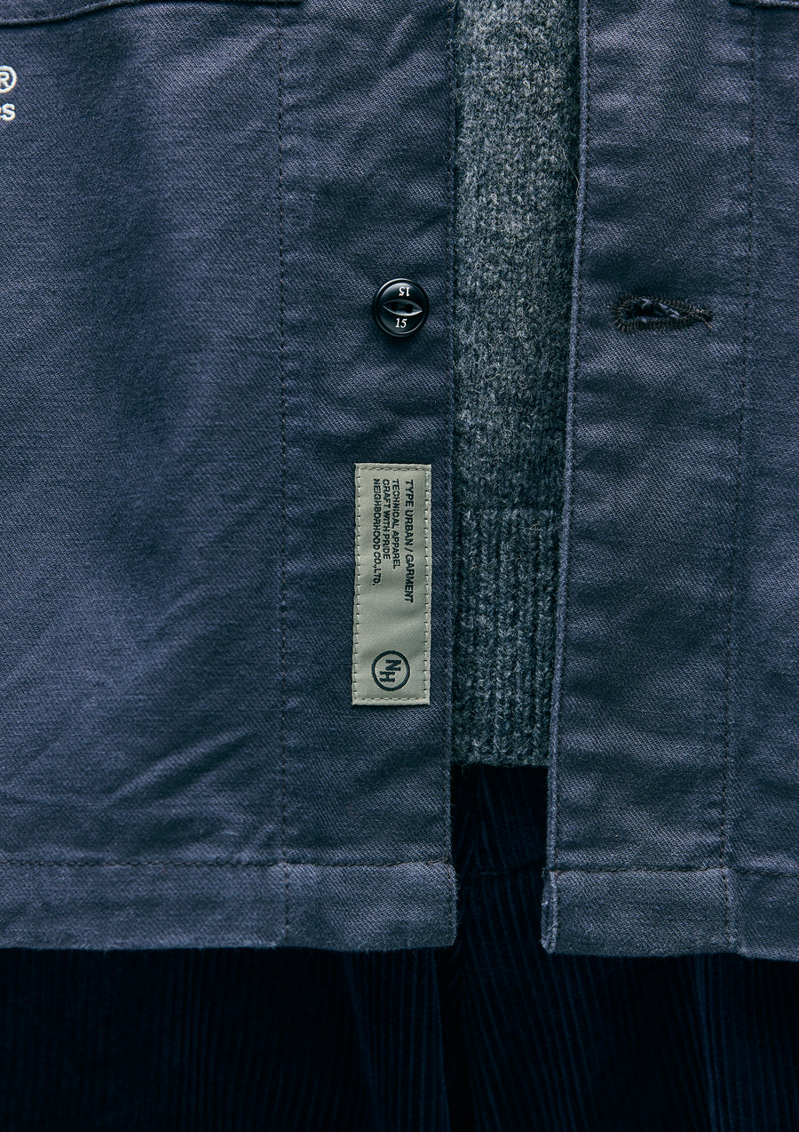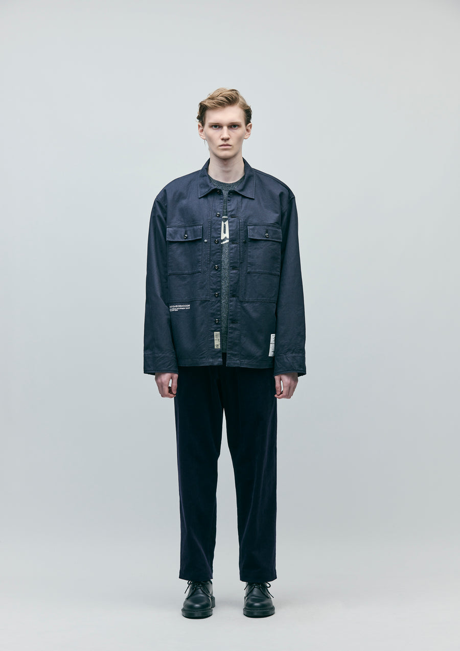 A BDU shirt made from a richly textured serge weave fabric dyed with sulfur-based dye. The sulfur dye gives it a unique appearance. Features flap chest pockets and side pockets integrated into the body. Adjustable tube sleeves. Embroidered logo on the right body. Equipped with original four-hole buttons, a brand tag on the left hem and side seam. One-wash finish.