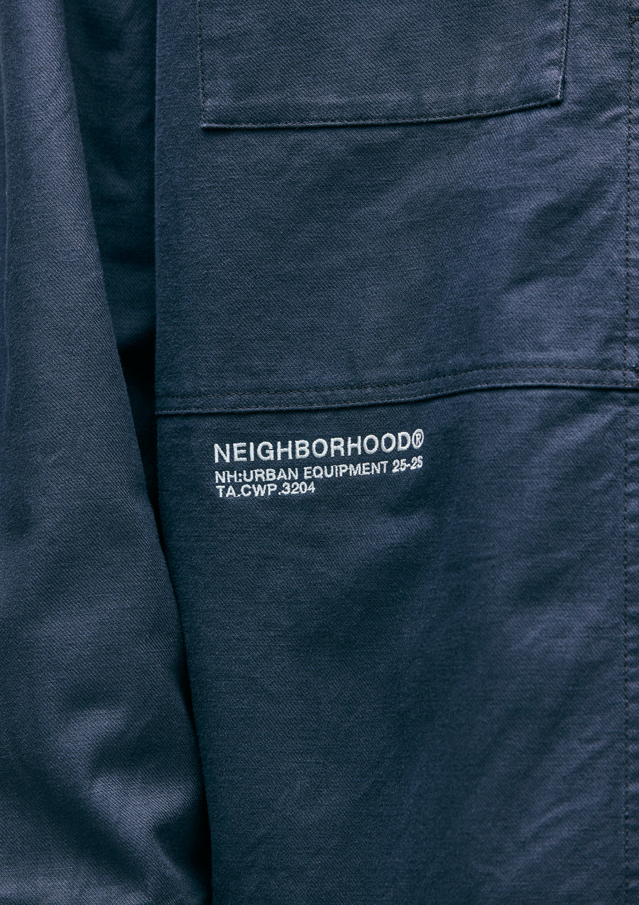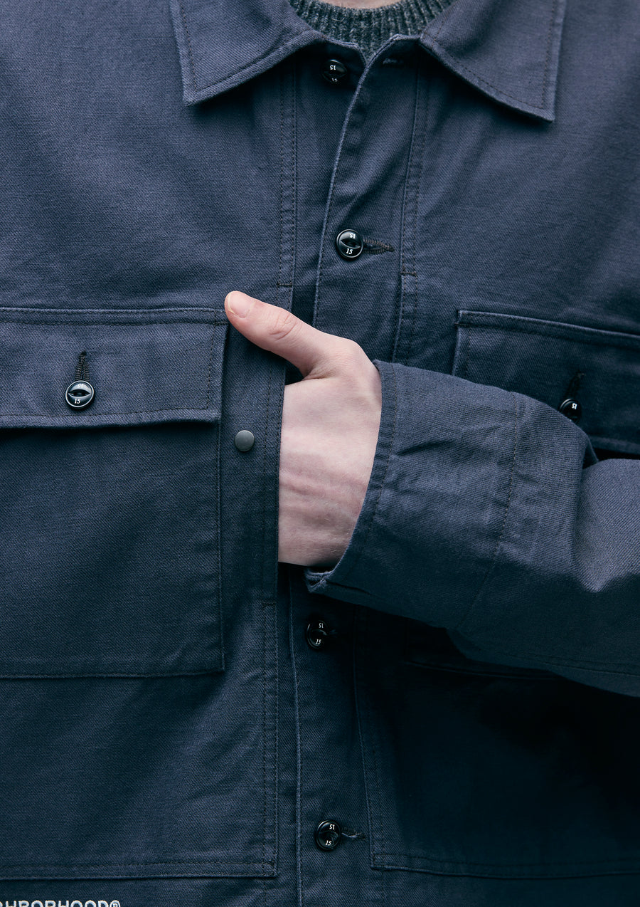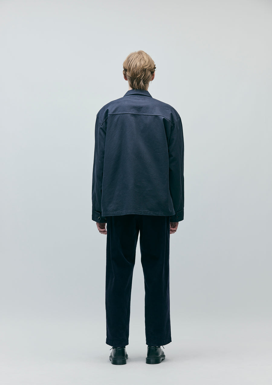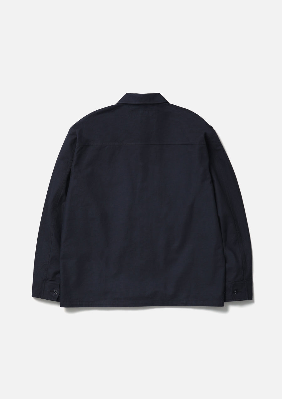 A BDU shirt made from a richly textured serge weave fabric dyed with sulfur-based dye. The sulfur dye gives it a unique appearance. Features flap chest pockets and side pockets integrated into the body. Adjustable tube sleeves. Embroidered logo on the right body. Equipped with original four-hole buttons, a brand tag on the left hem and side seam. One-wash finish.