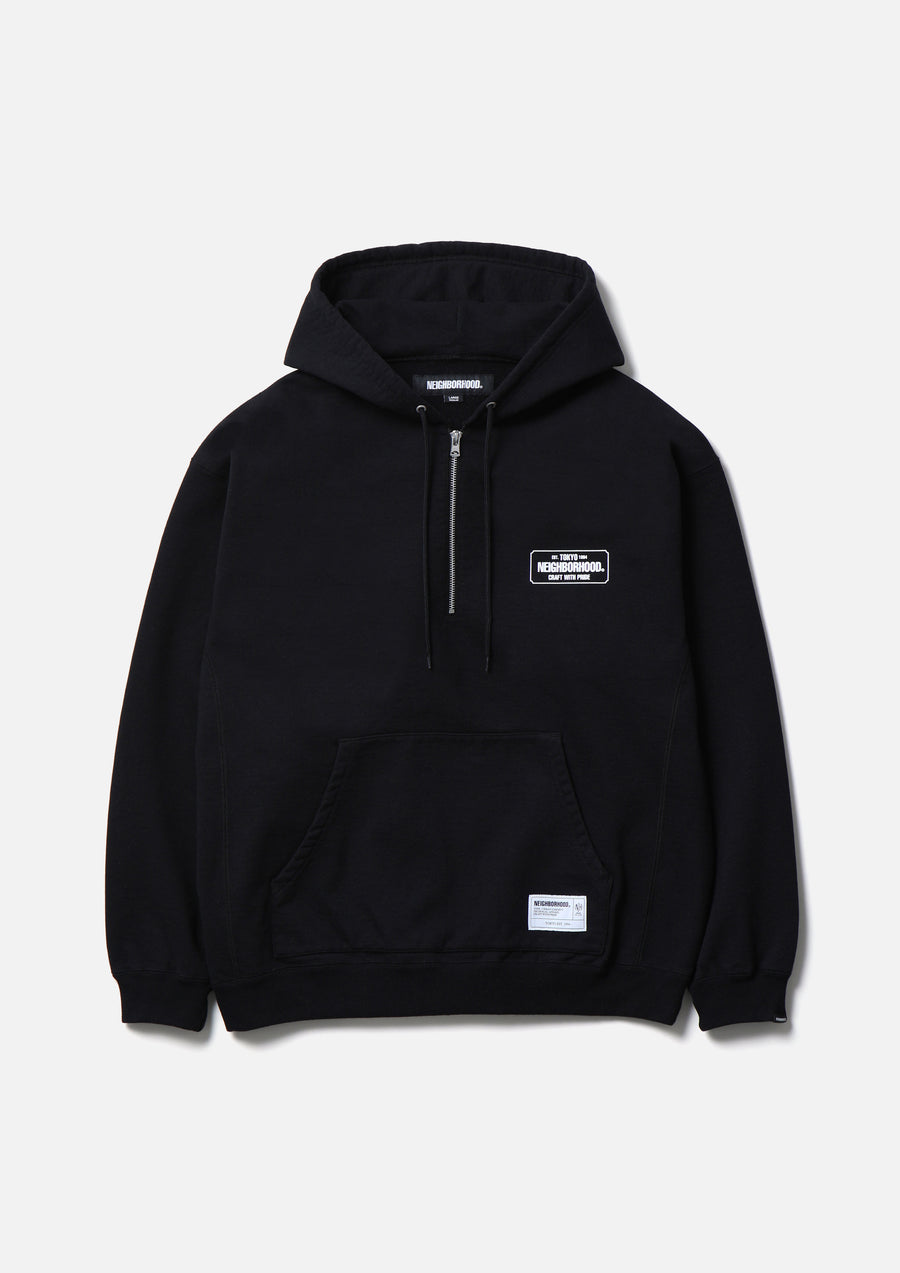 A half-zip hoodie made of tightly knit fleece-backed fabric. Features double-thread loops for both durability and softness. Printed logos on the left chest and back. Includes an original zipper pull and a brand tag on the cuff.