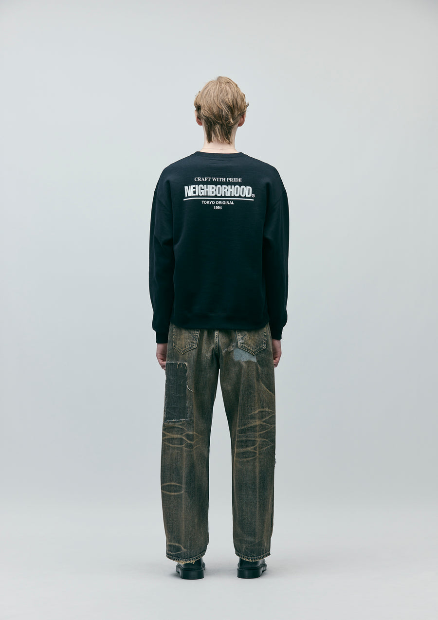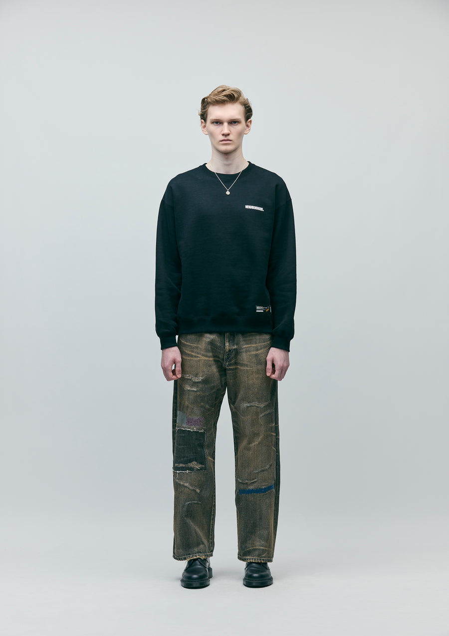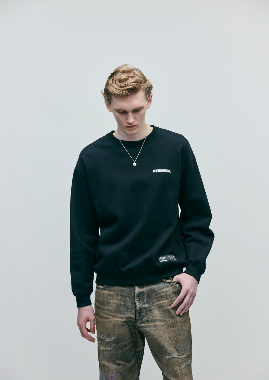 A crew neck pullover made of fleece-backed fabric, brushed before dyeing to minimize lint shedding. Printed logos on the left chest and back. Includes a brand tag on the side seam.