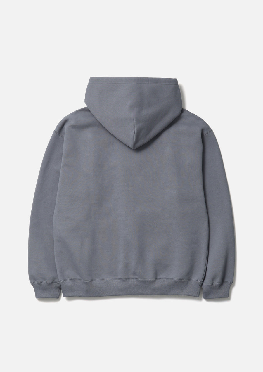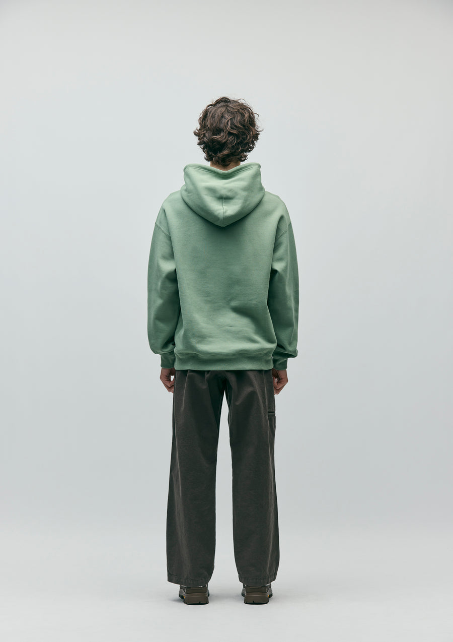 A pullover hoodie made of fleece-backed fabric, brushed before dyeing to minimize lint shedding. Graphic print on the front. Includes a brand tag on the side seam.