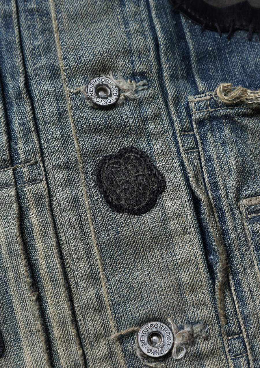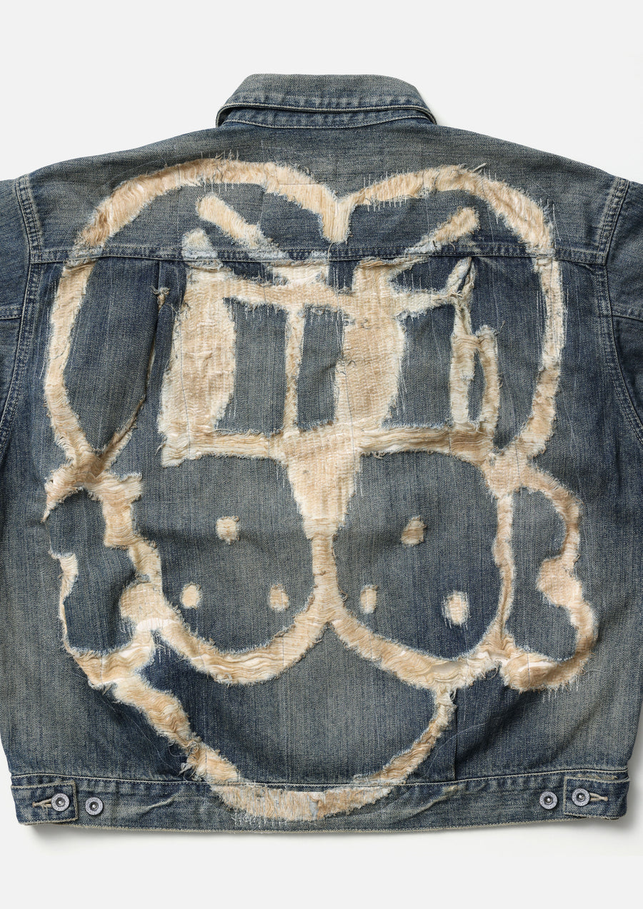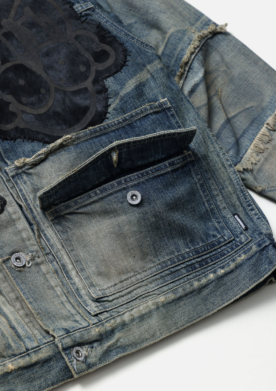 Savage denim jacket featuring Finesse Pup. Crafted from original 12oz selvedge denim. Finesse Pup are expressed through cowhide patches placed in multiple locations, and distressing with rework stitching across the entire back panel. Features diverse details including hand embroidery at the collar using reflector thread, paneled sleeves, and double-layered patch pockets. Distinguished by authentic aging achieved through distressing, rework processing, and heavy fading that expresses fabric deterioration. Incorporates original rivets and tack buttons. Includes clip tag at the side seam. Collaboration with CHITO.