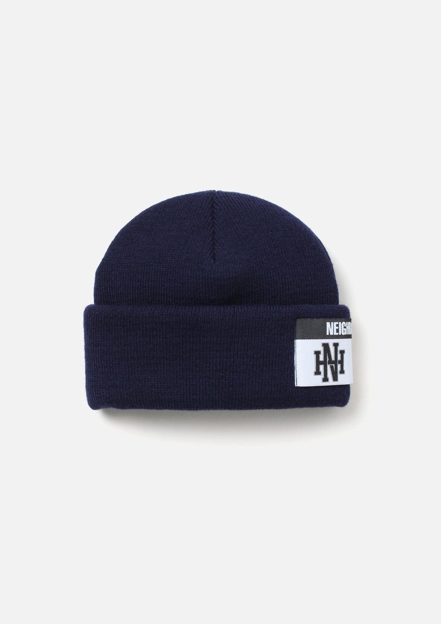 A beanie made from acrylic knit fabric. Features a sports-style brand tag on the front fold.