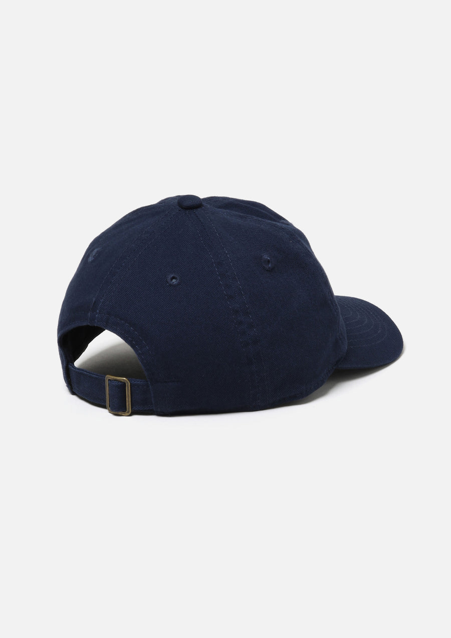 A dad cap made from cotton twill fabric. Features an embroidered logo on the front and a brand tag on the left side.