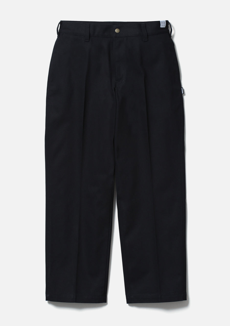 A pair of work pants made from katsuragi fabric woven with thick, strongly twisted yarn for enhanced durability. Features slash pockets on both sides. Equipped with original snap buttons and pocket lining fabric. Brand tags on the waist, above the hip pockets and on the side seam. Relaxed silhouette with center creases.