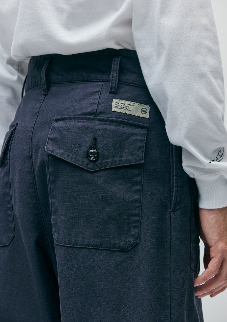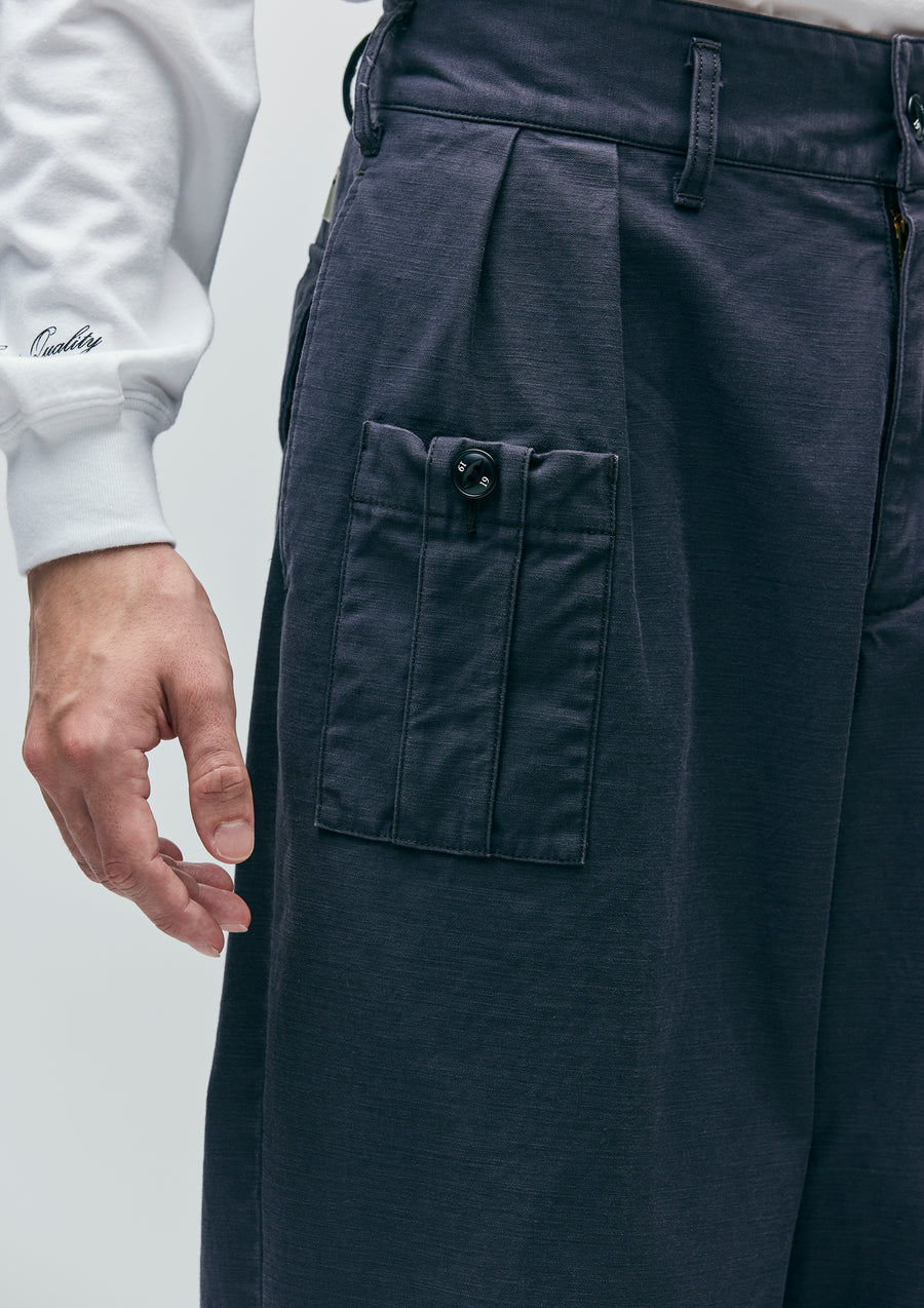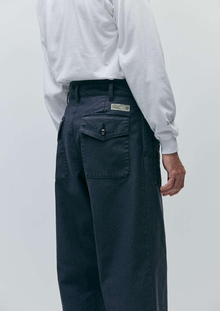 A pair of jungle trousers made from thick back satin fabric with a bio-wash finish. Features slash pockets on both sides and flap pockets on the front and back. Equipped with original cat-eye buttons and a front zipper. Relaxed silhouette.