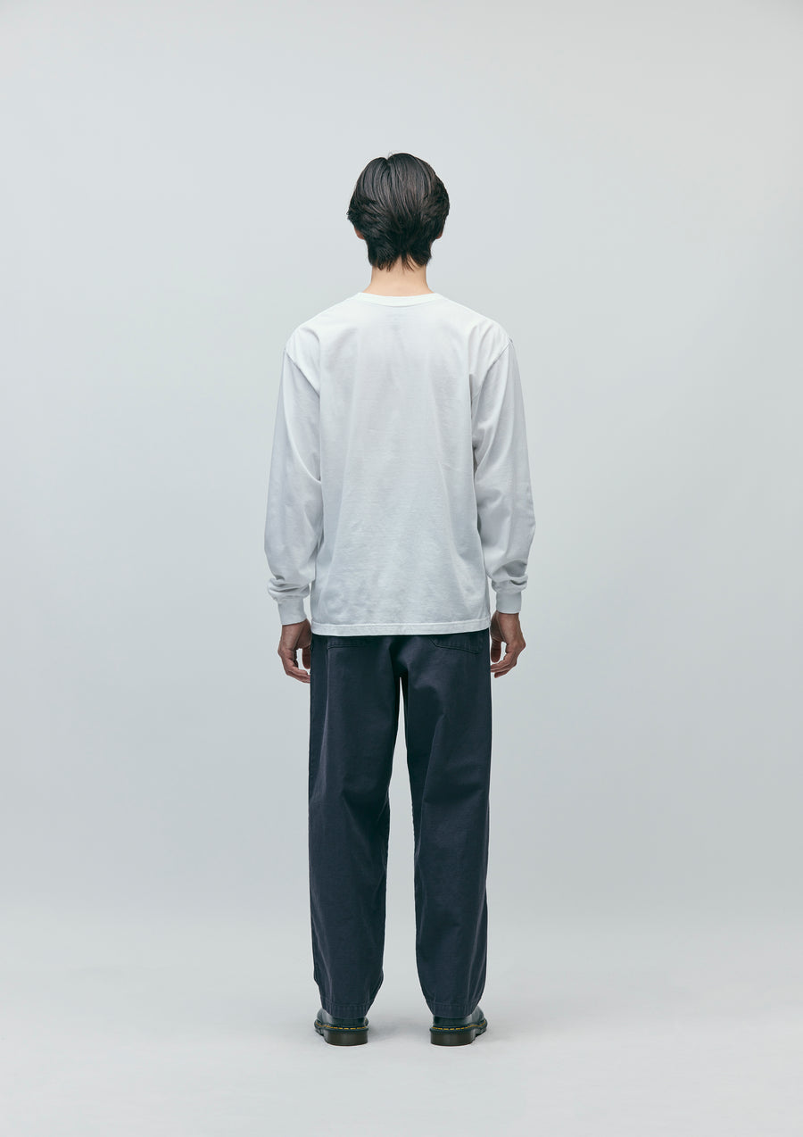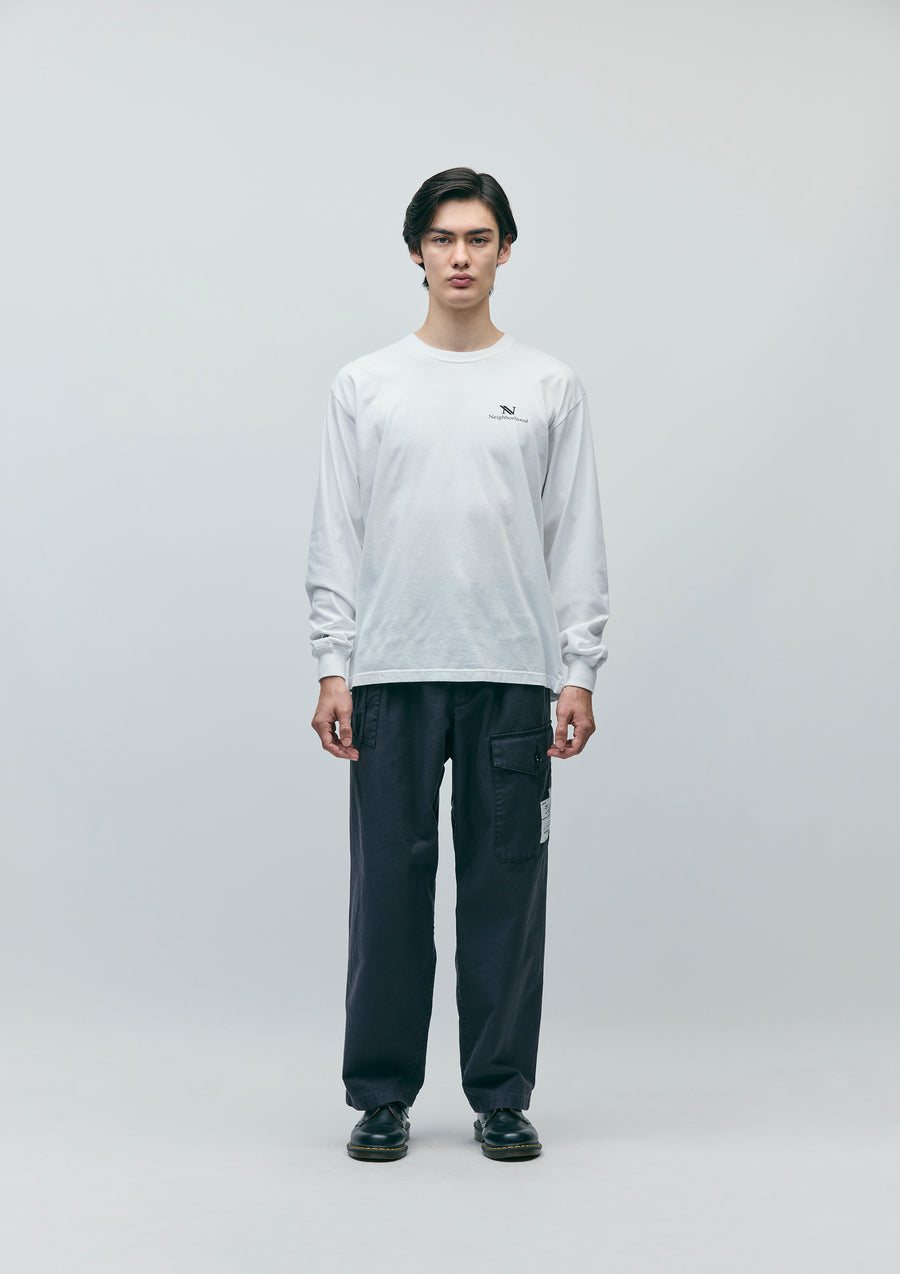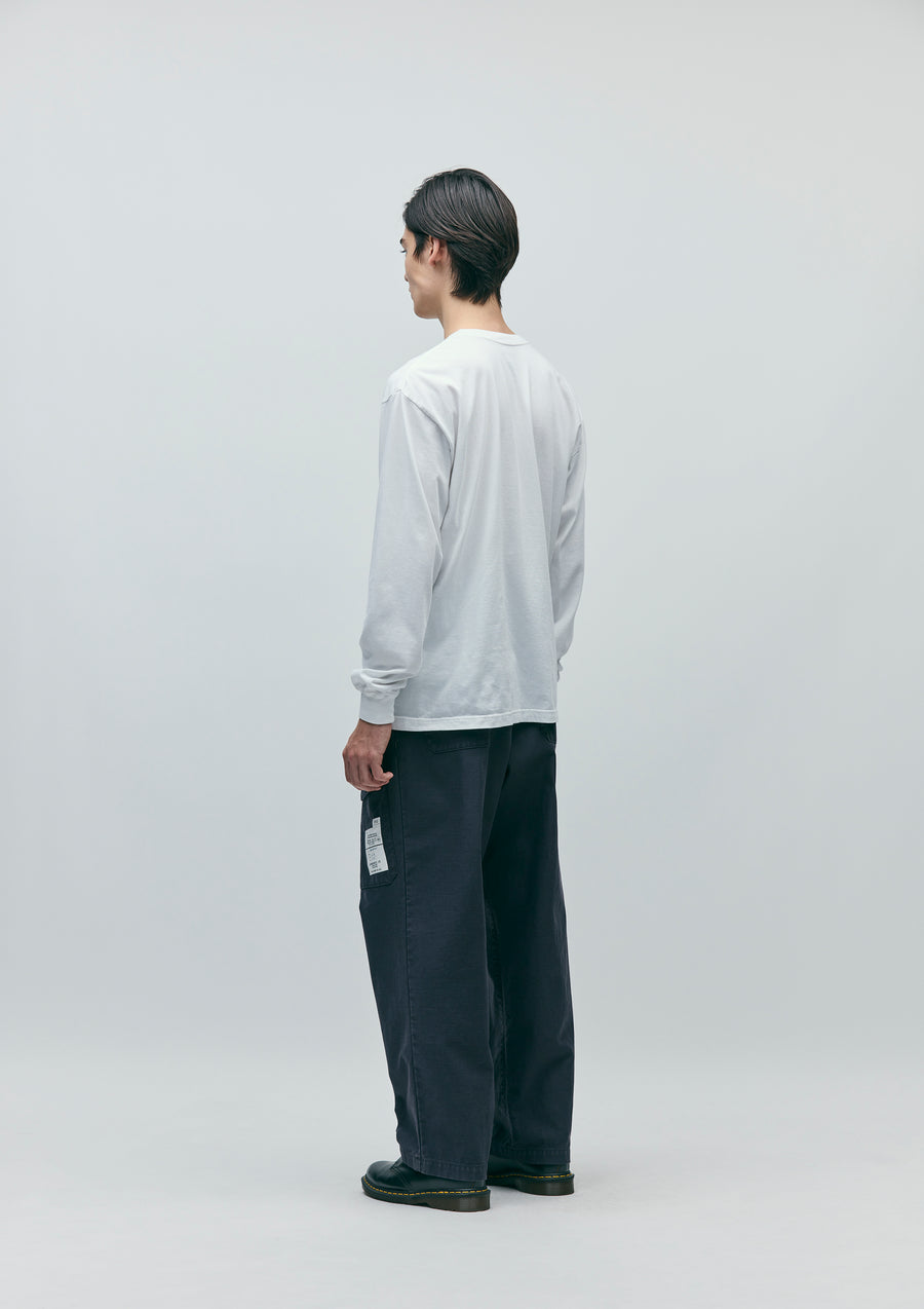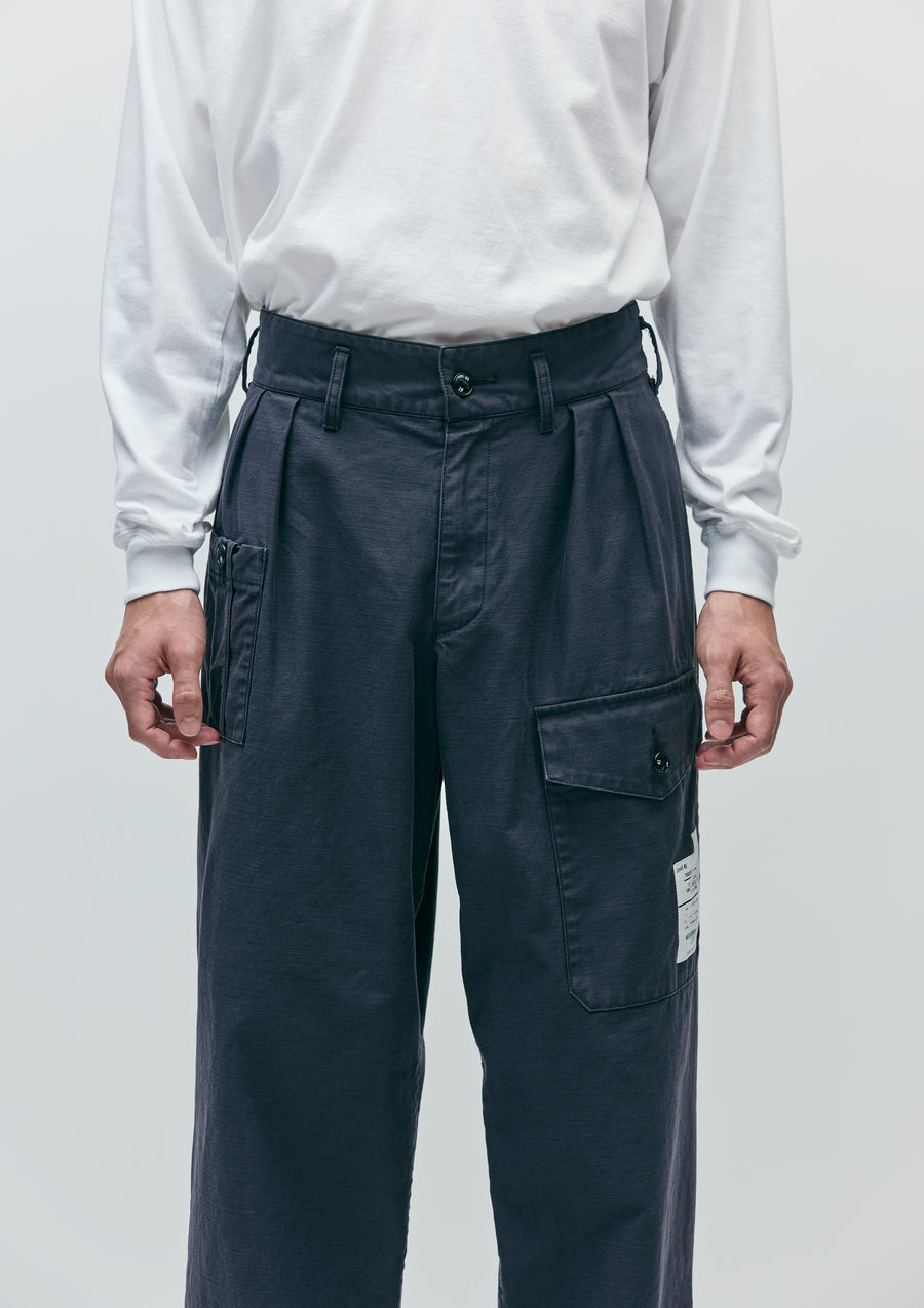 A pair of jungle trousers made from thick back satin fabric with a bio-wash finish. Features slash pockets on both sides and flap pockets on the front and back. Equipped with original cat-eye buttons and a front zipper. Relaxed silhouette.