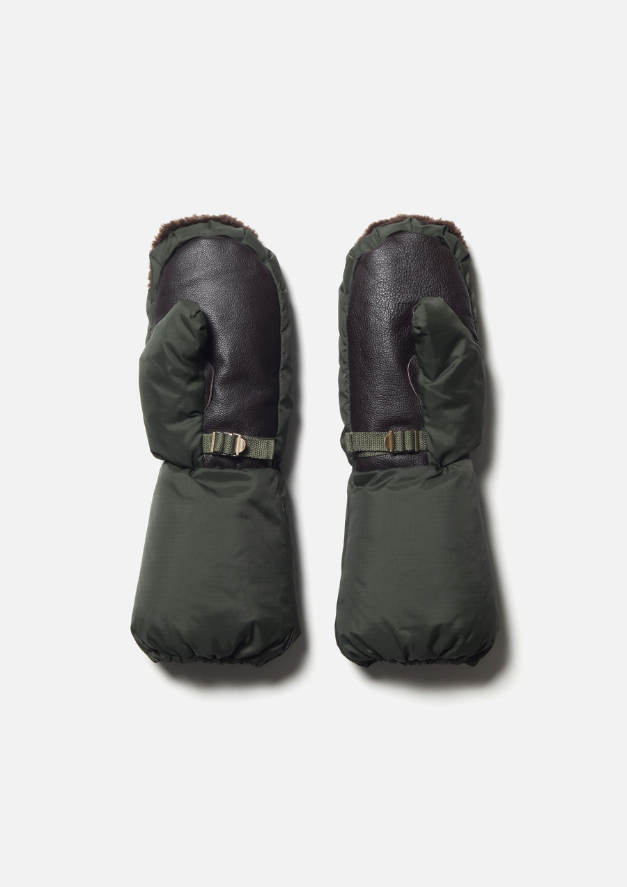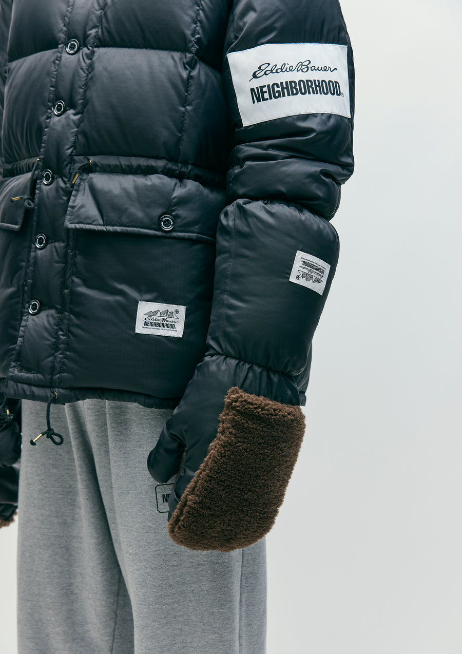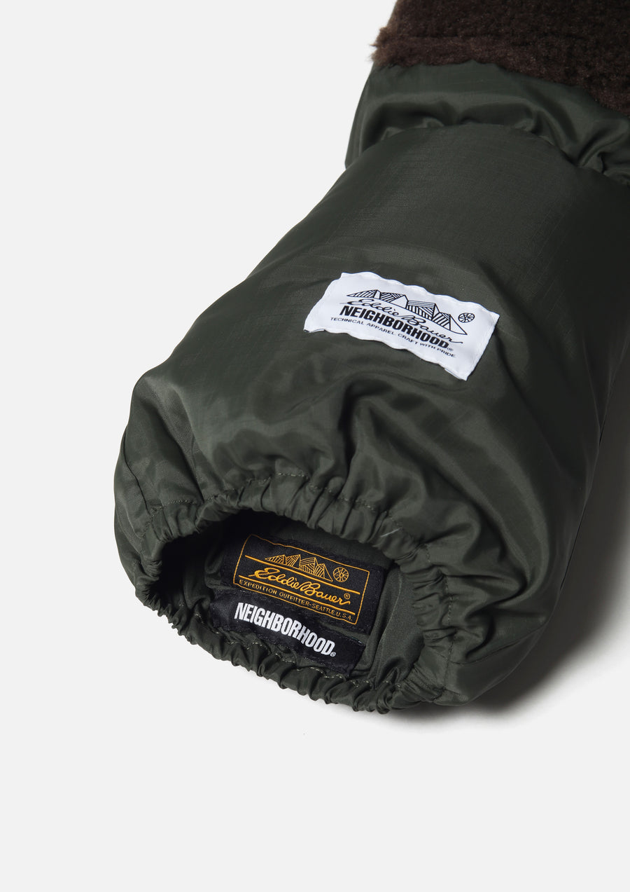 Down mittens crafted from nylon ripstop fabric with firmness, resilience, and a subtle sheen, combined with boa material. Equipped with an adjustable buckle at the wrist. The lining uses polyester material for excellent heat retention. Finished with a collaboration name tag and a brand tag. A joint work item with Eddie Bauer, the outdoor brand founded in Seattle, USA in 1920.