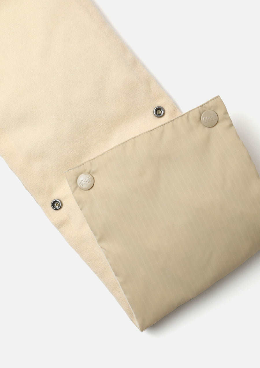A down scarf made from nylon ripstop fabric with firmness, resilience, and a subtle sheen. Designed in a 2-way style with snap buttons at the end, allowing one side to be passed through and secured. The lining is crafted from smooth micro tricot for a soft touch. Finished with a collaboration name tag and a brand tag. A joint work item with Eddie Bauer, the outdoor brand founded in Seattle, USA in 1920.
