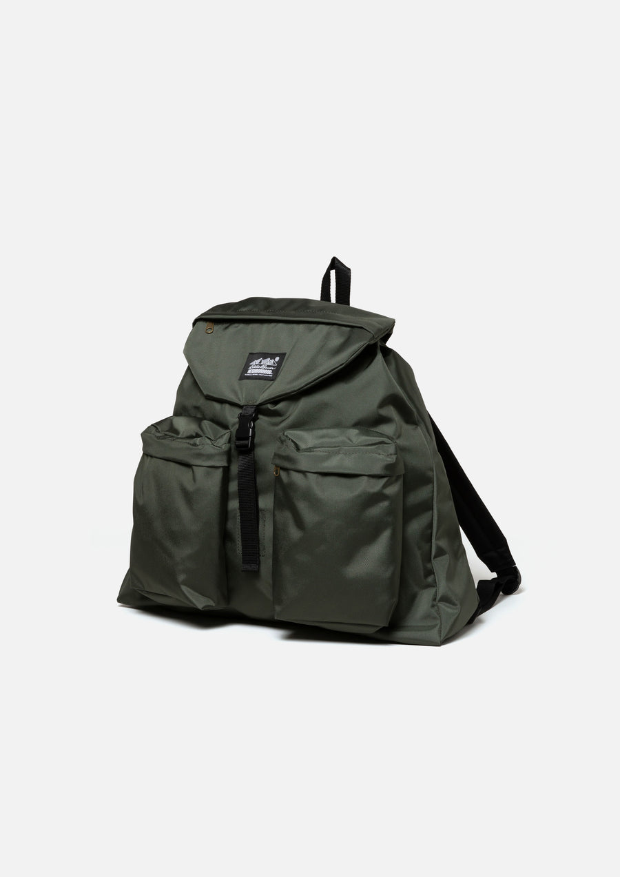A daypack made from heavyweight, durable nylon oxford fabric. Features a flap closure with an internal adjustable drawcord. In addition to the main compartment, a gusseted zip pocket is placed on the exterior. Finished with a collaboration name tag on the front. A joint work item with Eddie Bauer, the outdoor brand founded in Seattle, USA in 1920.