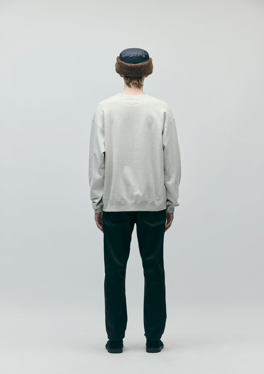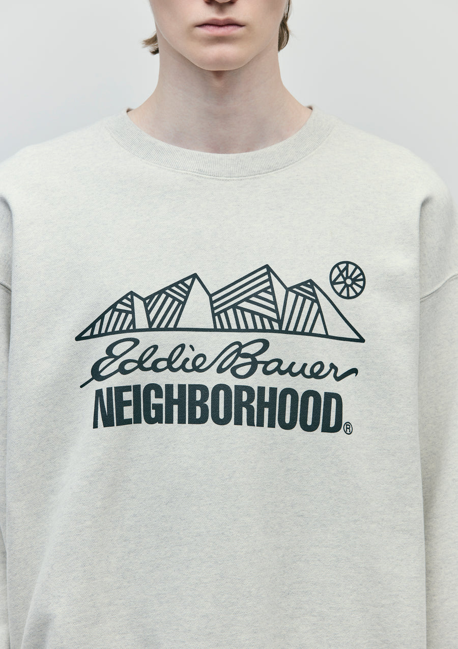 A crewneck pullover made from cotton fleece material. The front features printed logos of both brands. A collaboration name tag is placed at the left hem, with a brand tag on the side seam. A joint work item with Eddie Bauer, the outdoor brand founded in Seattle, USA in 1920.
