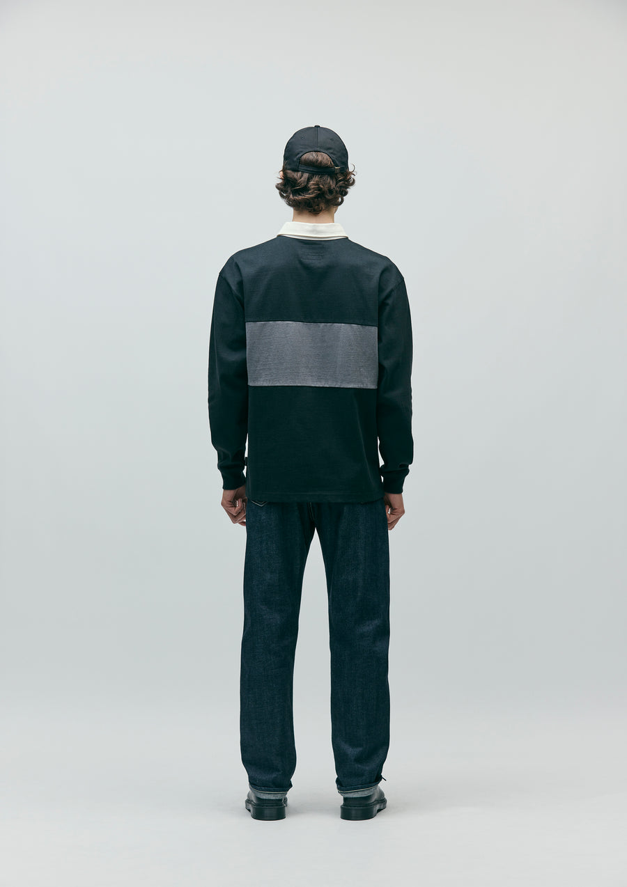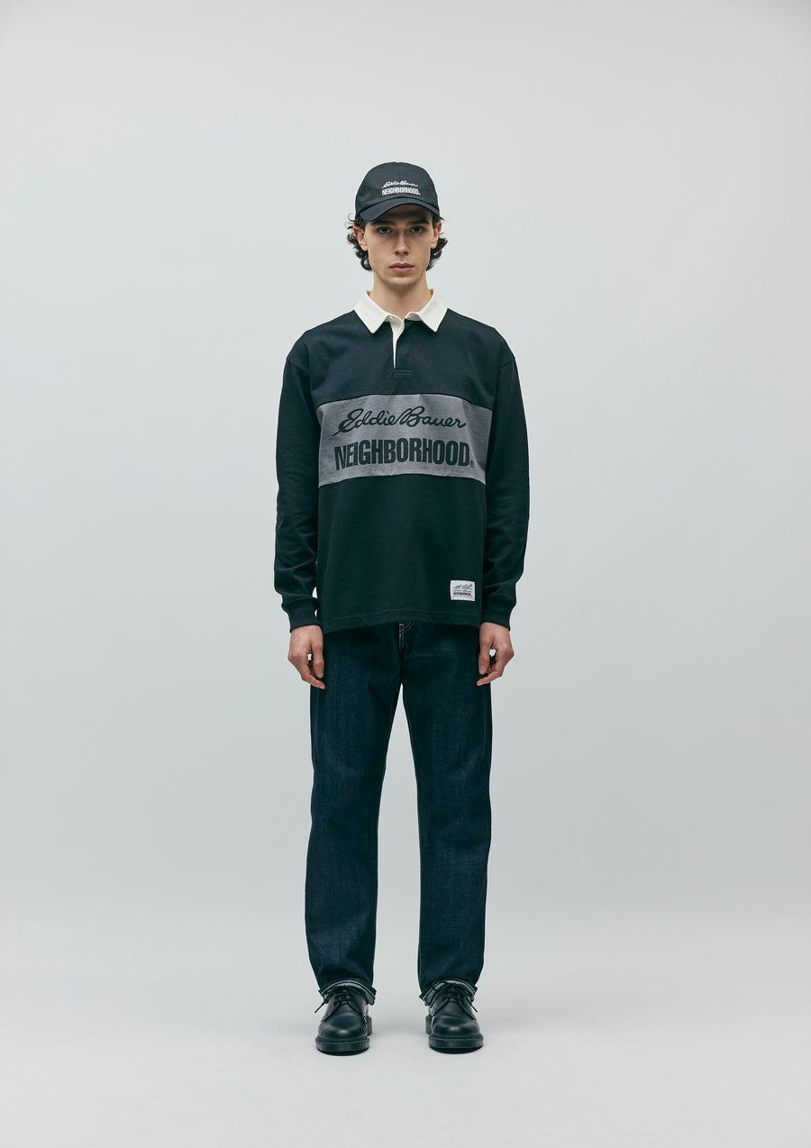 A collaborative item with Eddie Bauer, the renowned Seattle-based outdoor brand founded in 1920. A rugby shirt made from cotton jersey fabric. Features printed logos from both brands along the color-blocked sections. Includes a collaboration brand tag on the left hem and a brand tag on the side seam.