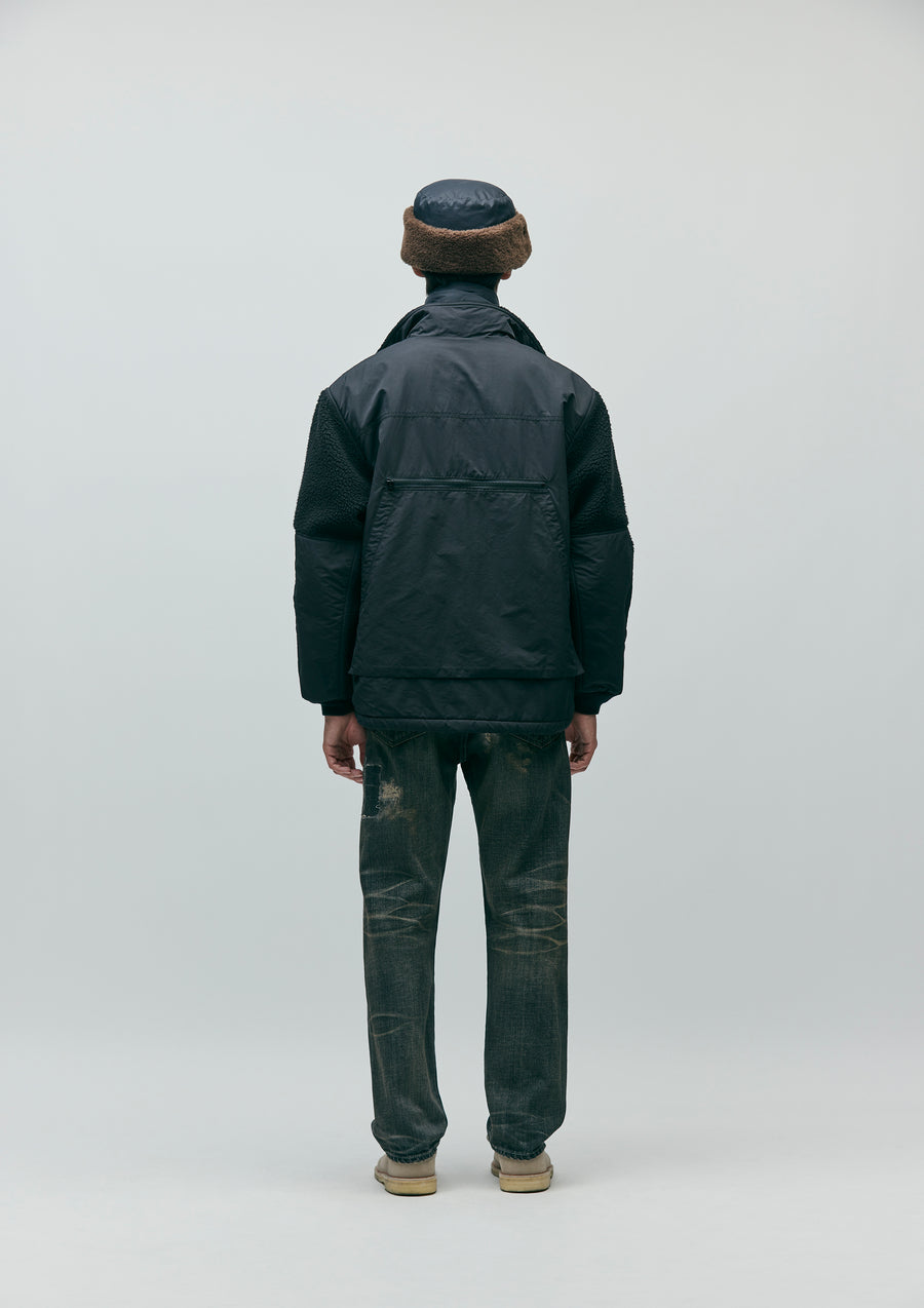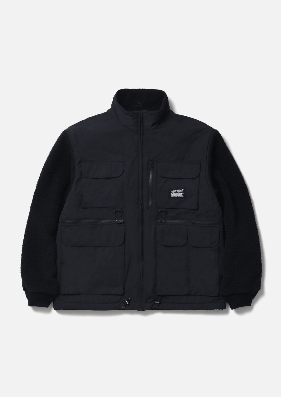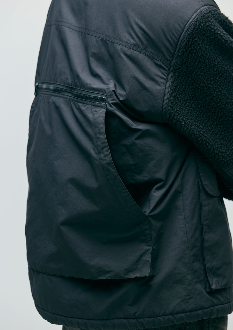 A fishing jacket crafted from cotton-nylon taffeta with a cotton-like texture, combined with moderately soft boa fleece material. Inherits authentic details of the era, including utility pockets on both sides, a chest pocket with D-ring, and a rear map pocket. Ribbed cuffs at the sleeves. Finished with a collaboration name tag on the left chest and a brand tag on the side seam. A joint work item with Eddie Bauer, the outdoor brand founded in Seattle, USA in 1920.