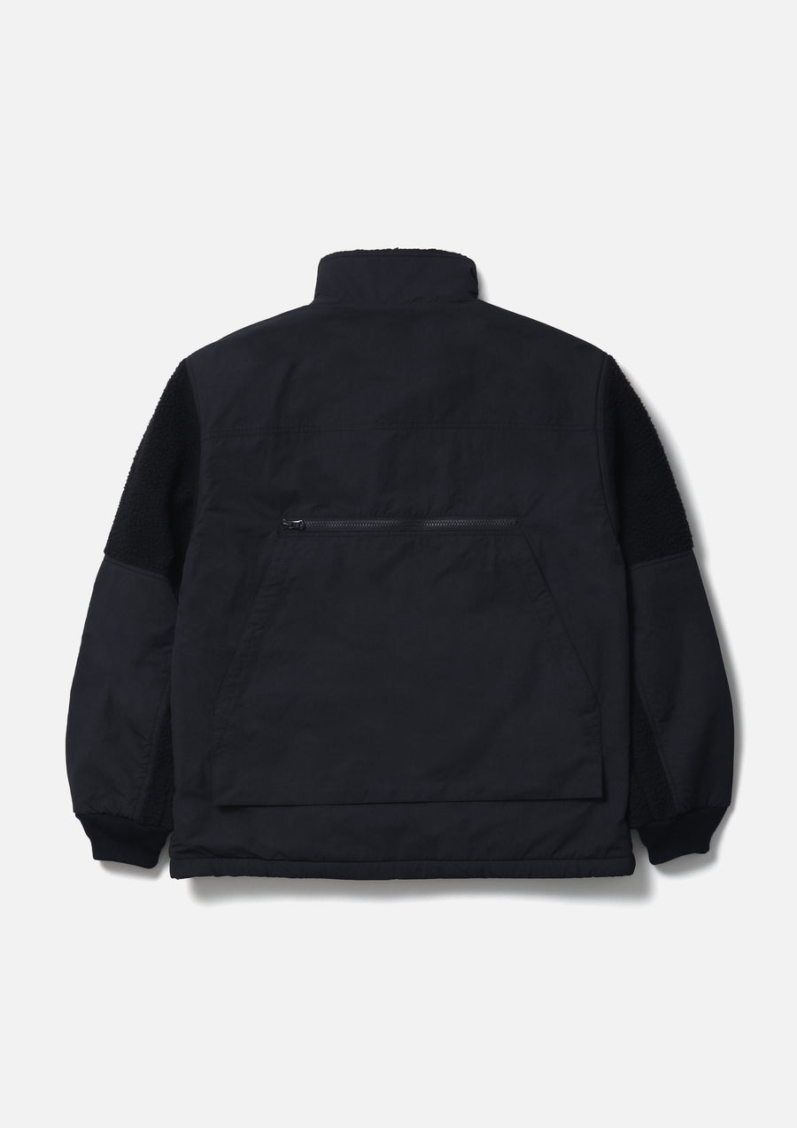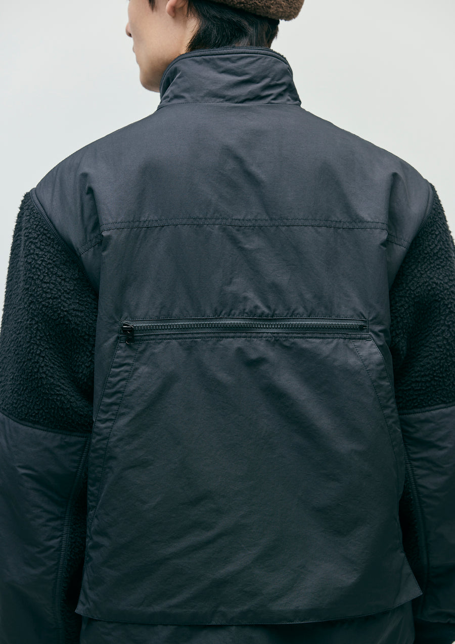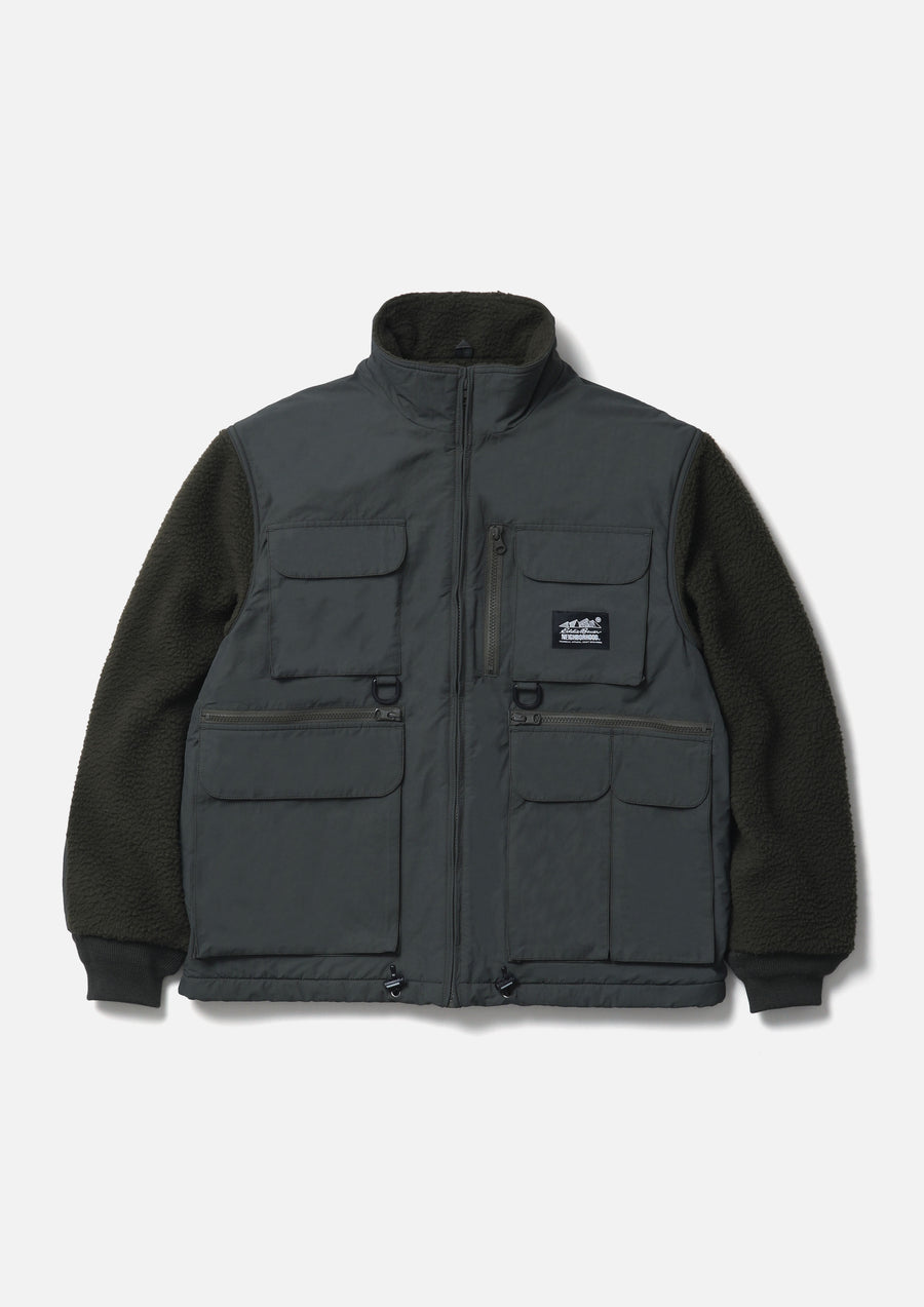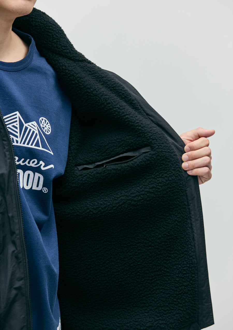 A fishing jacket crafted from cotton-nylon taffeta with a cotton-like texture, combined with moderately soft boa fleece material. Inherits authentic details of the era, including utility pockets on both sides, a chest pocket with D-ring, and a rear map pocket. Ribbed cuffs at the sleeves. Finished with a collaboration name tag on the left chest and a brand tag on the side seam. A joint work item with Eddie Bauer, the outdoor brand founded in Seattle, USA in 1920.