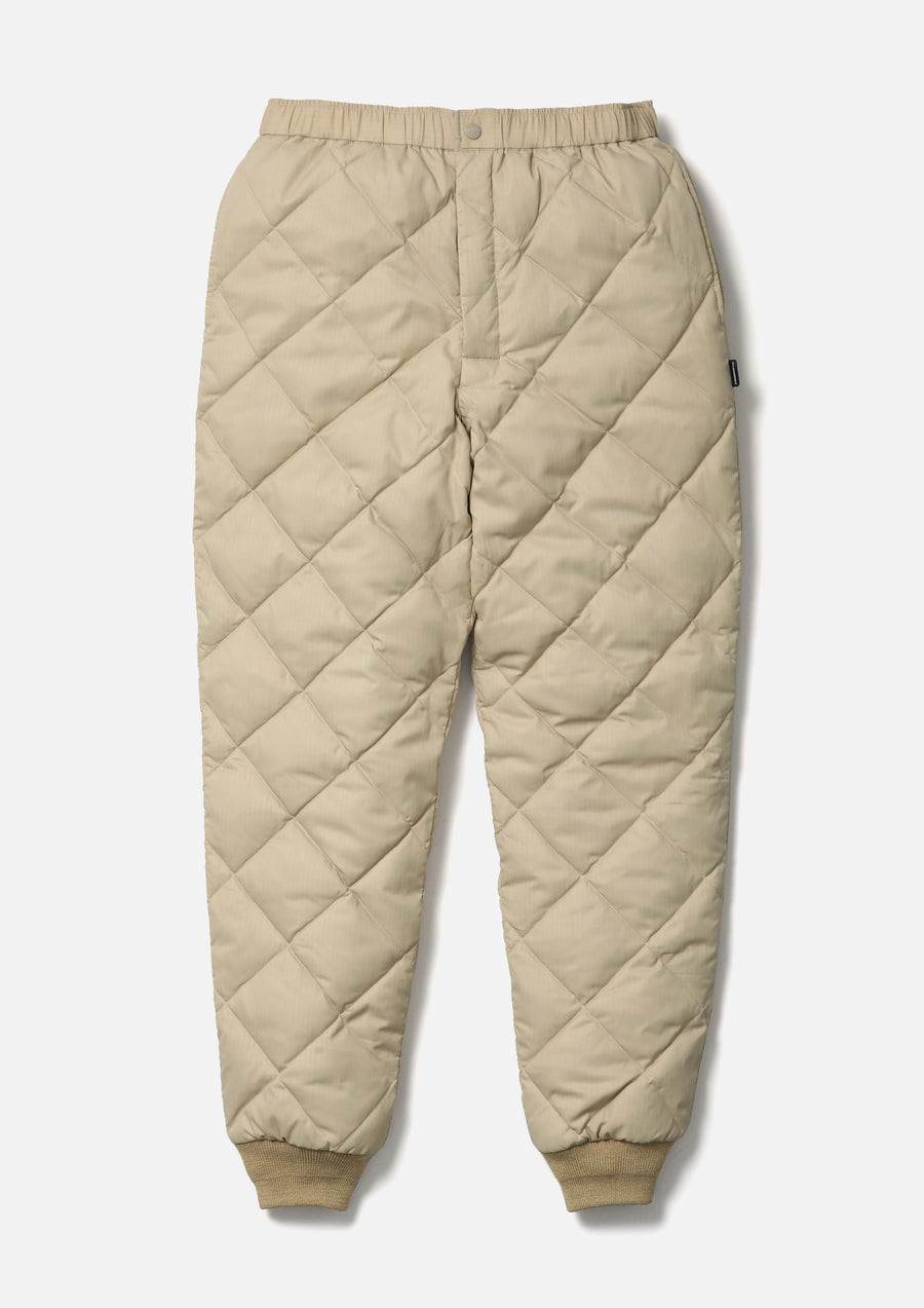 Down pants made from nylon ripstop fabric with firmness, resilience, and a subtle sheen. Slash pockets are set into the side seams, with button-flap pockets on the back. The elastic waistband features a snap-button closure and an internal adjustable drawcord. Ribbed cuffs at the hem. Finished with a collaboration name tag and a brand tag on the side seam. A joint work item with Eddie Bauer, the outdoor brand founded in Seattle, USA in 1920.