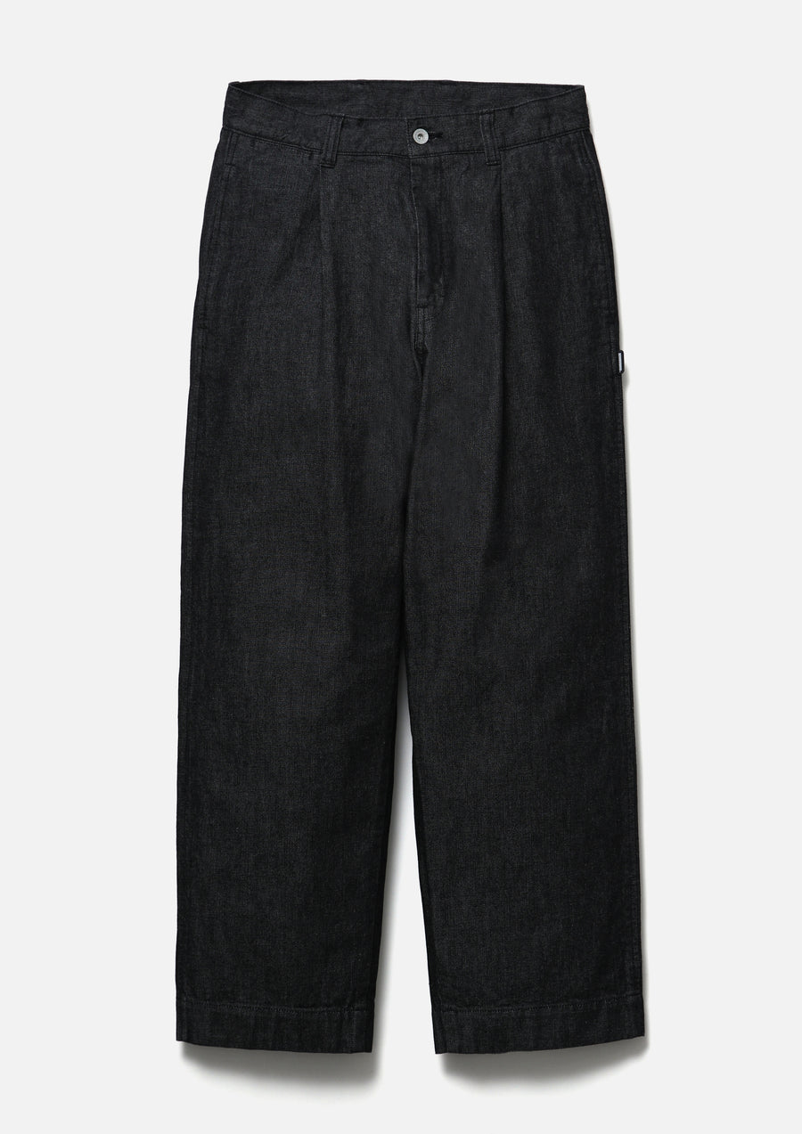 Tuck pants made from 11oz triple-weave denim, a fabric often used for work pants. Designed with a coin pocket and finished with original tack buttons and zipper pulls. A brand tag is placed above the back pocket, and a woven side label is attached at the side seam. Cut in a relaxed silhouette and completed with a one-wash finish.