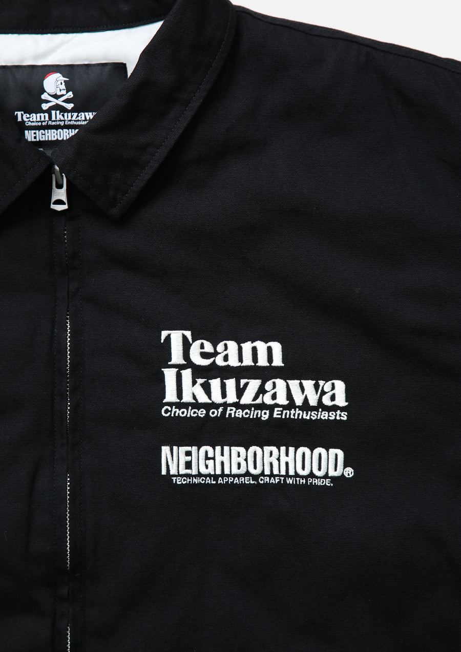 Racing jacket made from oxford fabric. Lined with diamond quilting for heat retention. Logos and graphics are expressed through embroidery. Finished with original buttons and zipper pulls. A woven side label is attached at the side seam. Completed with a one-wash finish. Collaborative model with Team Ikuzawa.