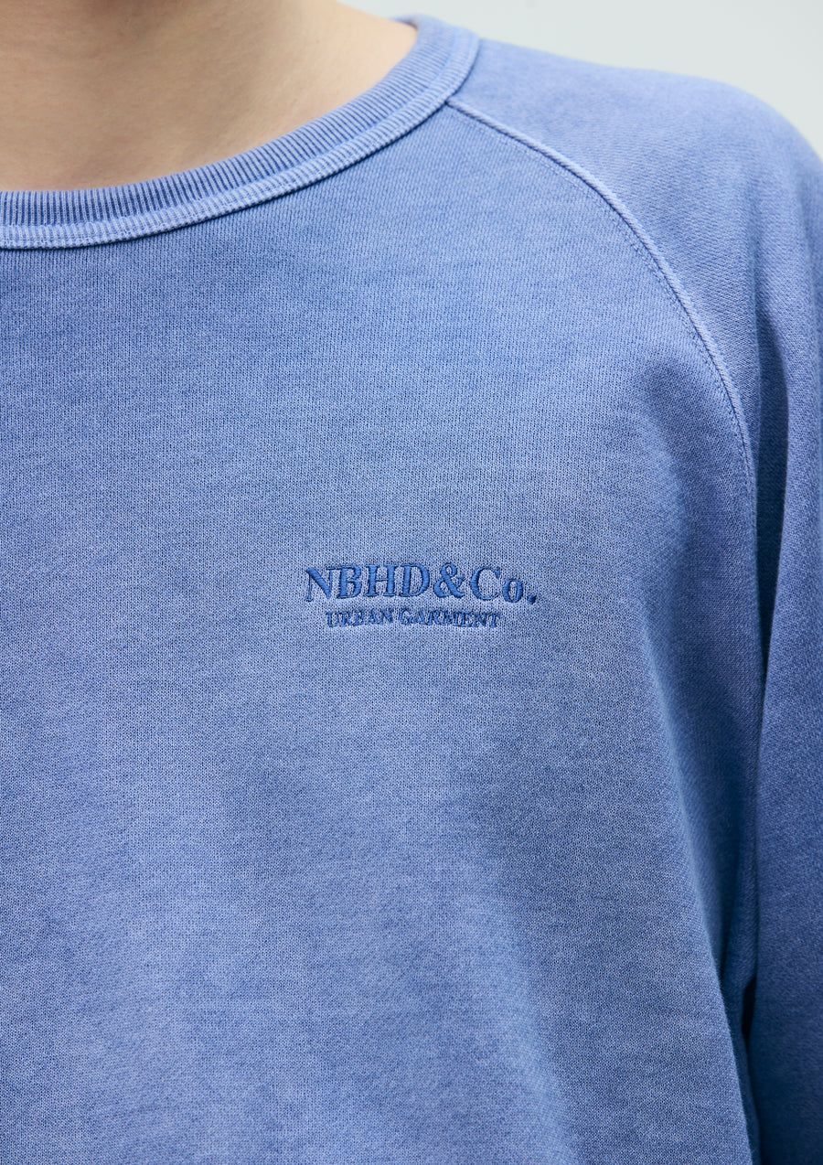 Crewneck pullover made from cotton fleece fabric, garment-dyed with a pigment finish. Designed with raglan sleeves and an embroidered logo on the left chest. A brand tag is placed at the left hem, and a woven side label is attached at the side seam.