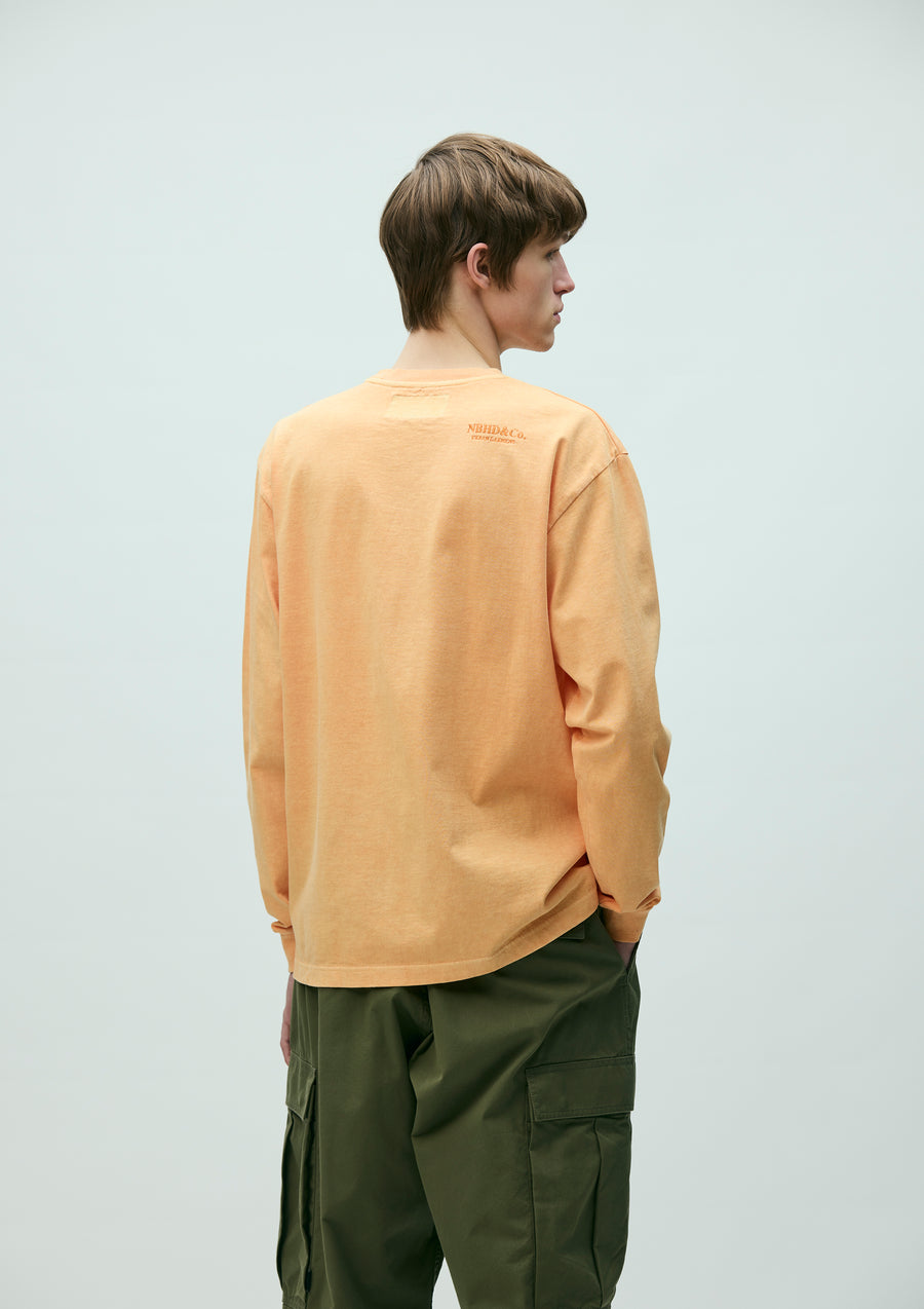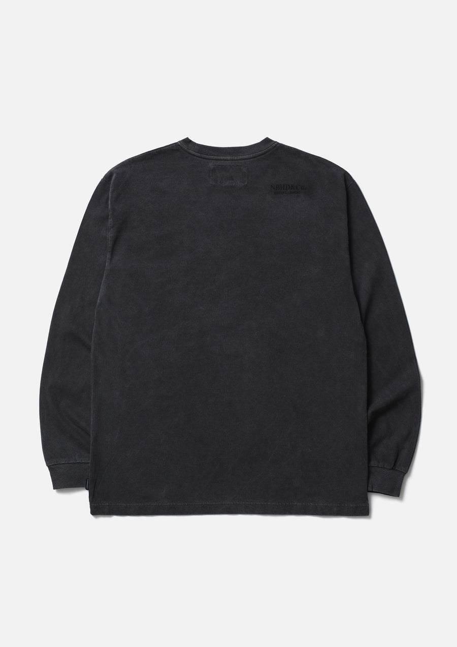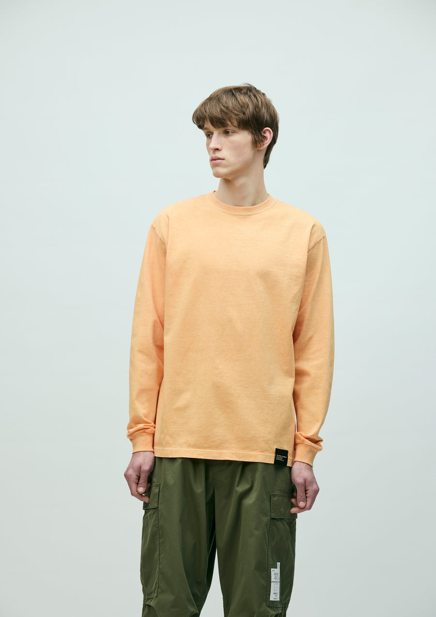 Long-sleeve crewneck cut-and-sew top made from jersey fabric, garment-dyed with a pigment finish. Features an embroidered logo on the right back shoulder. A brand tag is placed at the left hem, and a woven side label is attached at the side seam.