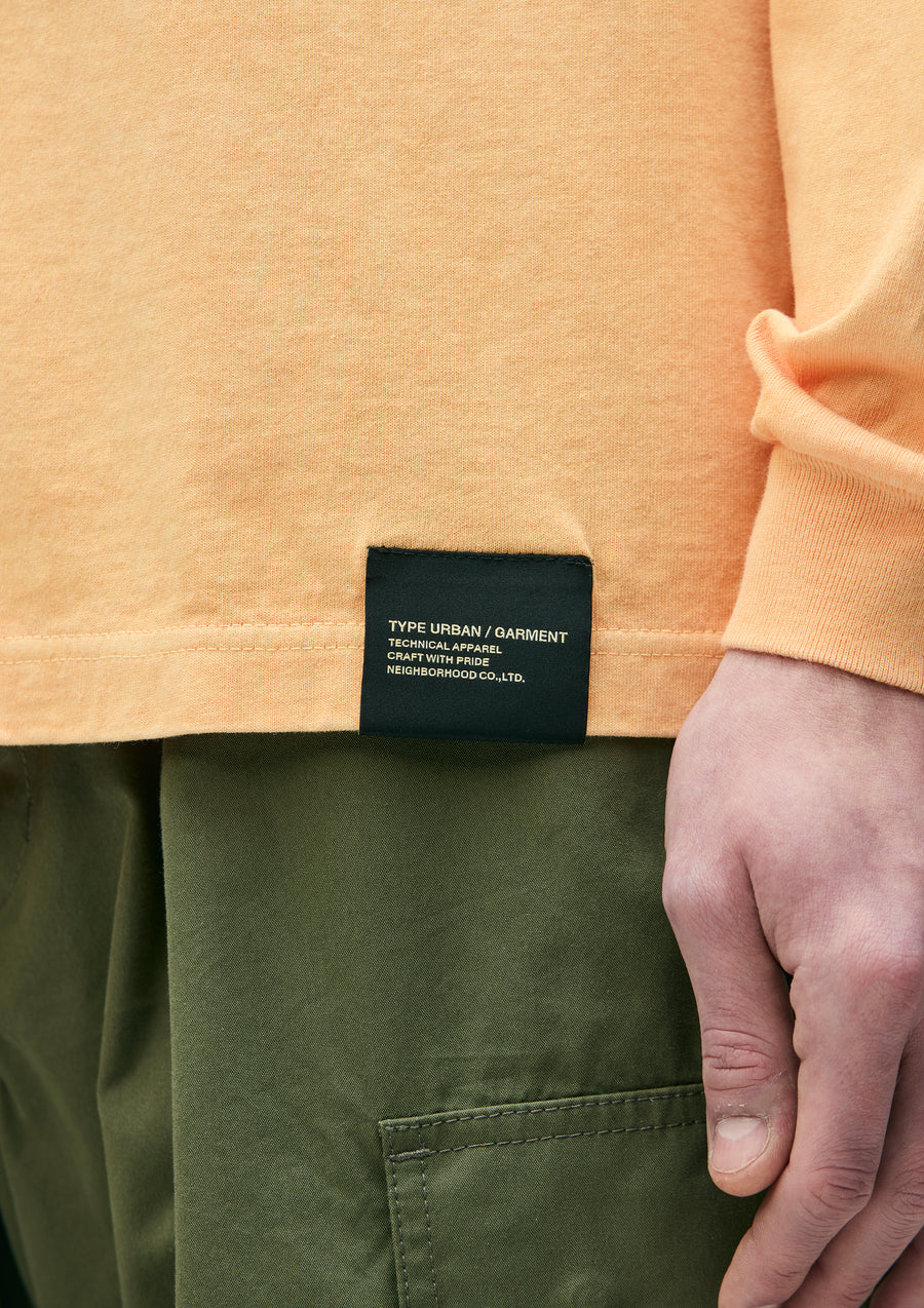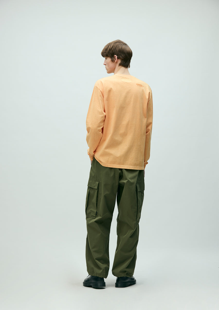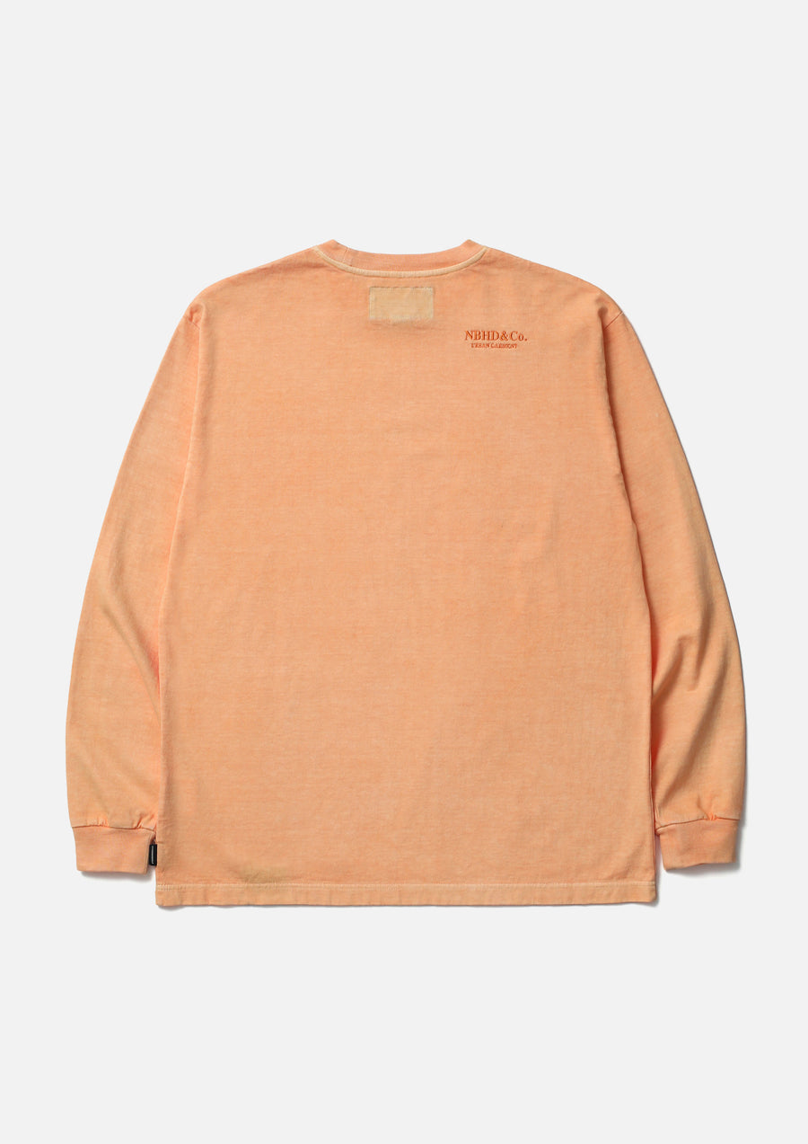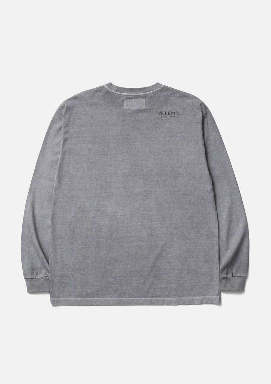 Long-sleeve crewneck cut-and-sew top made from jersey fabric, garment-dyed with a pigment finish. Features an embroidered logo on the right back shoulder. A brand tag is placed at the left hem, and a woven side label is attached at the side seam.