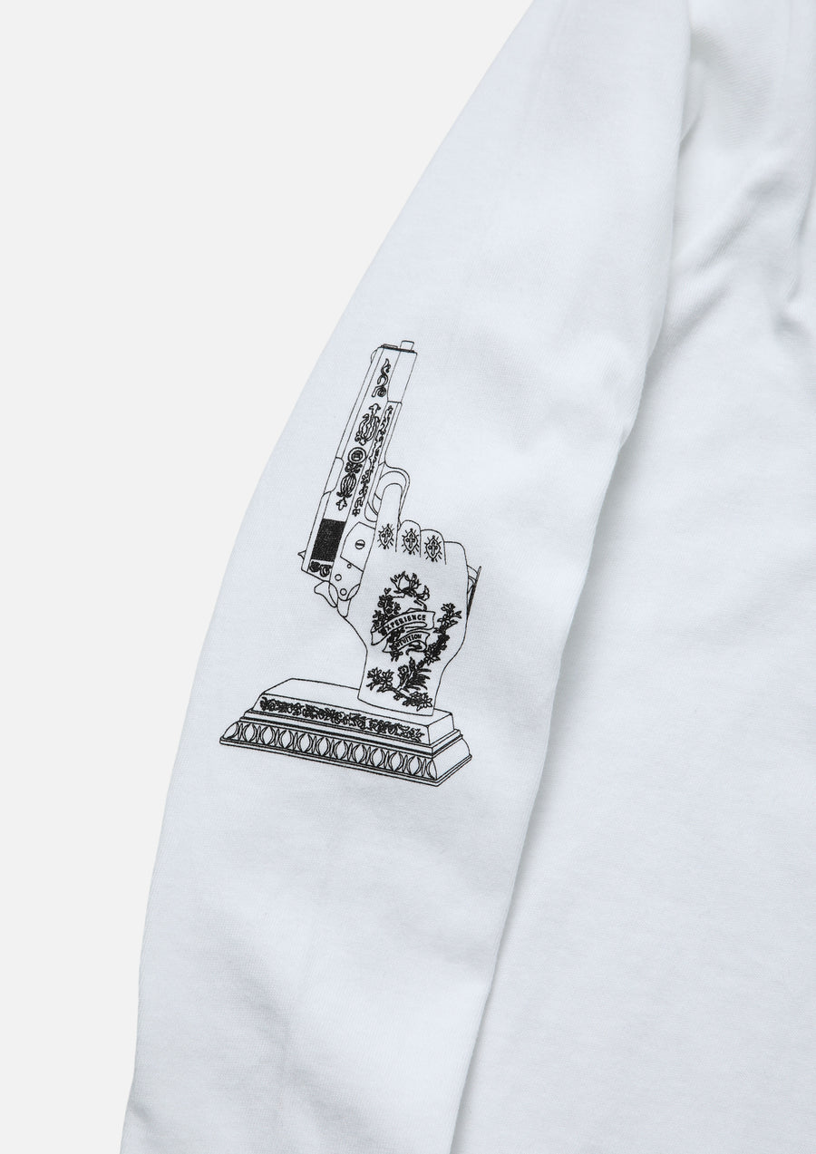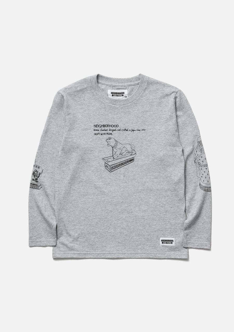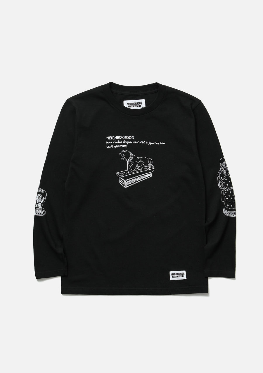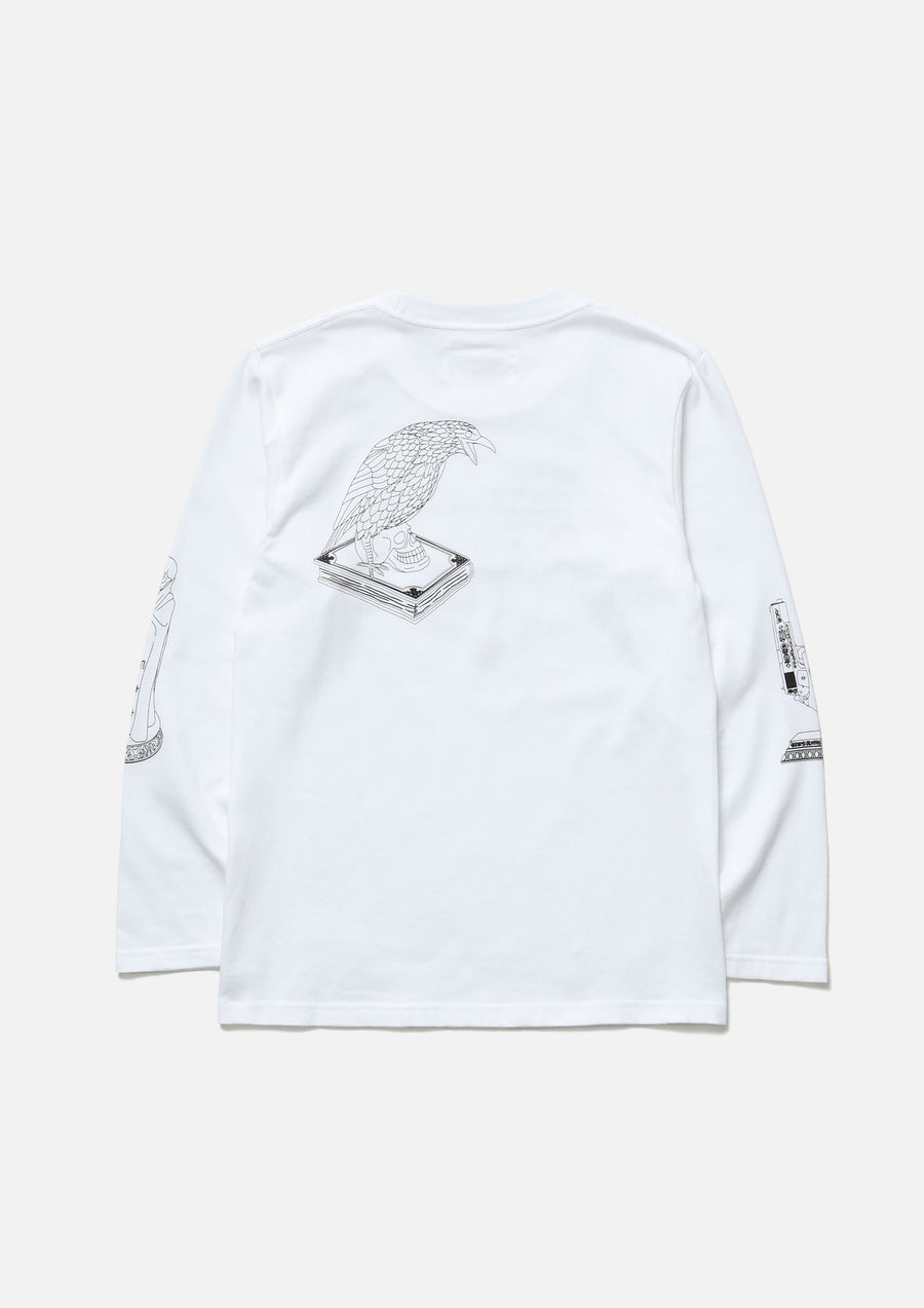 Long sleeve T-shirt made of 5.6oz heavyweight body. Incense chamber motif graphic printed. Brand tag at the left hem.