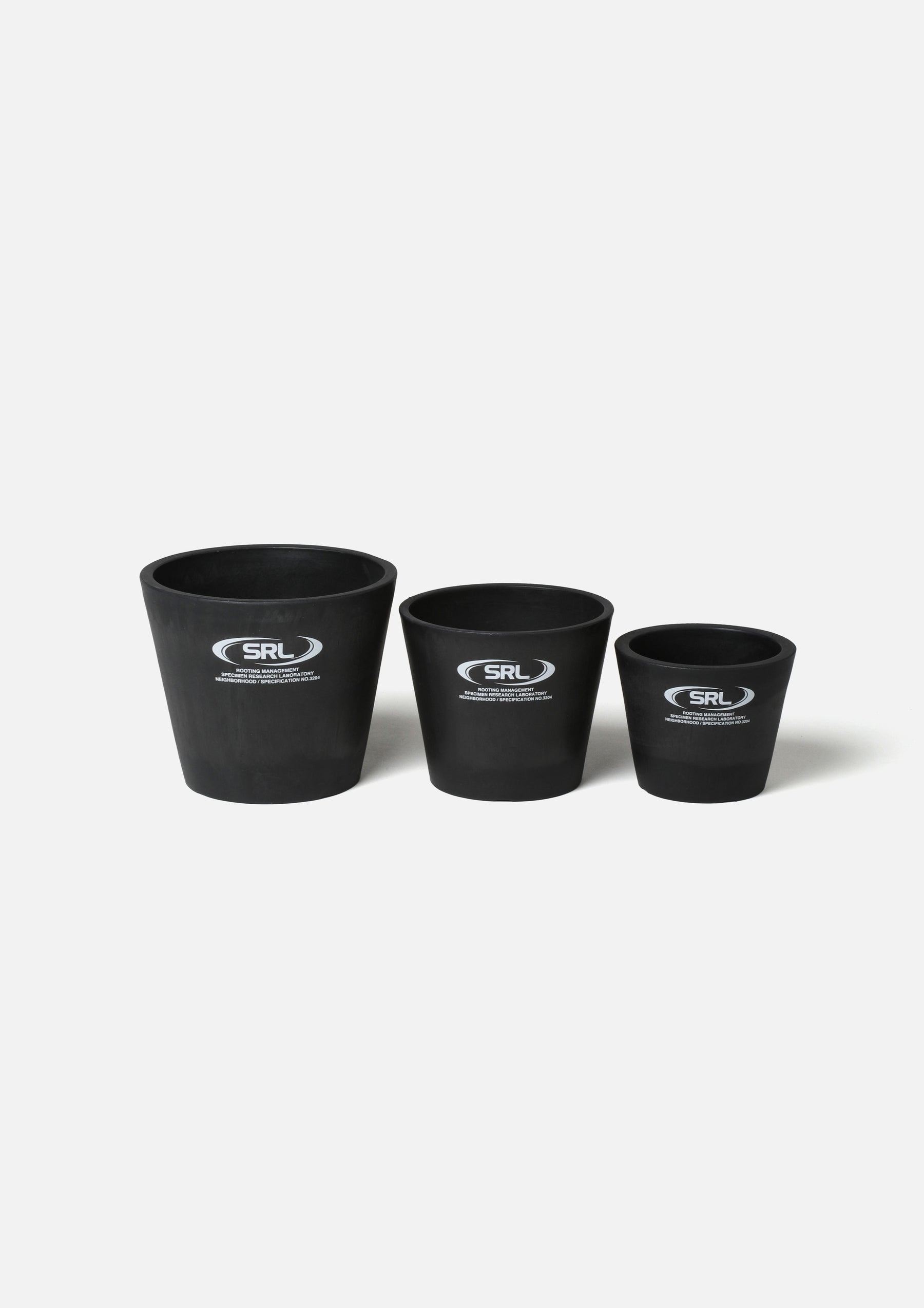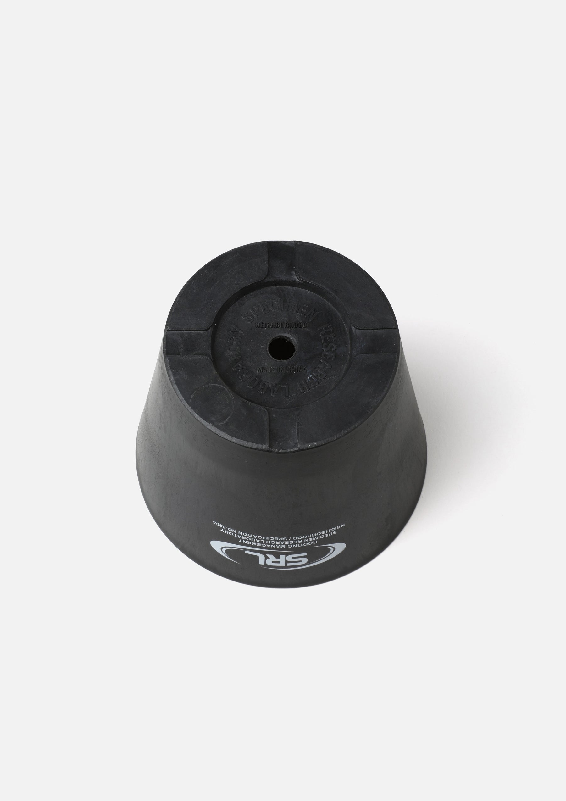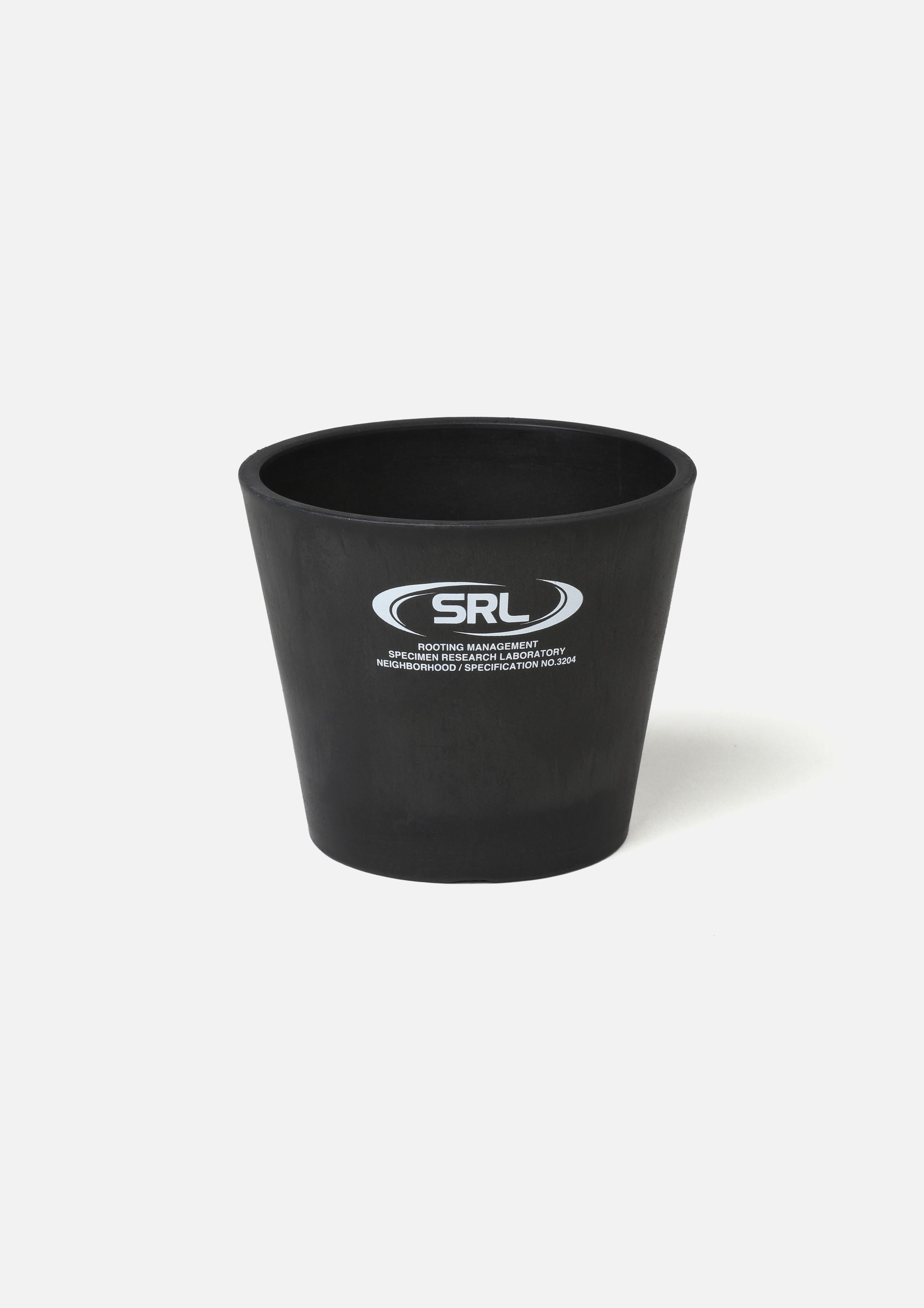 Plastic plant pot with an SRL logo print. Medium tapered design. The original molded base features a three-dimensional logo and drainage holes.
