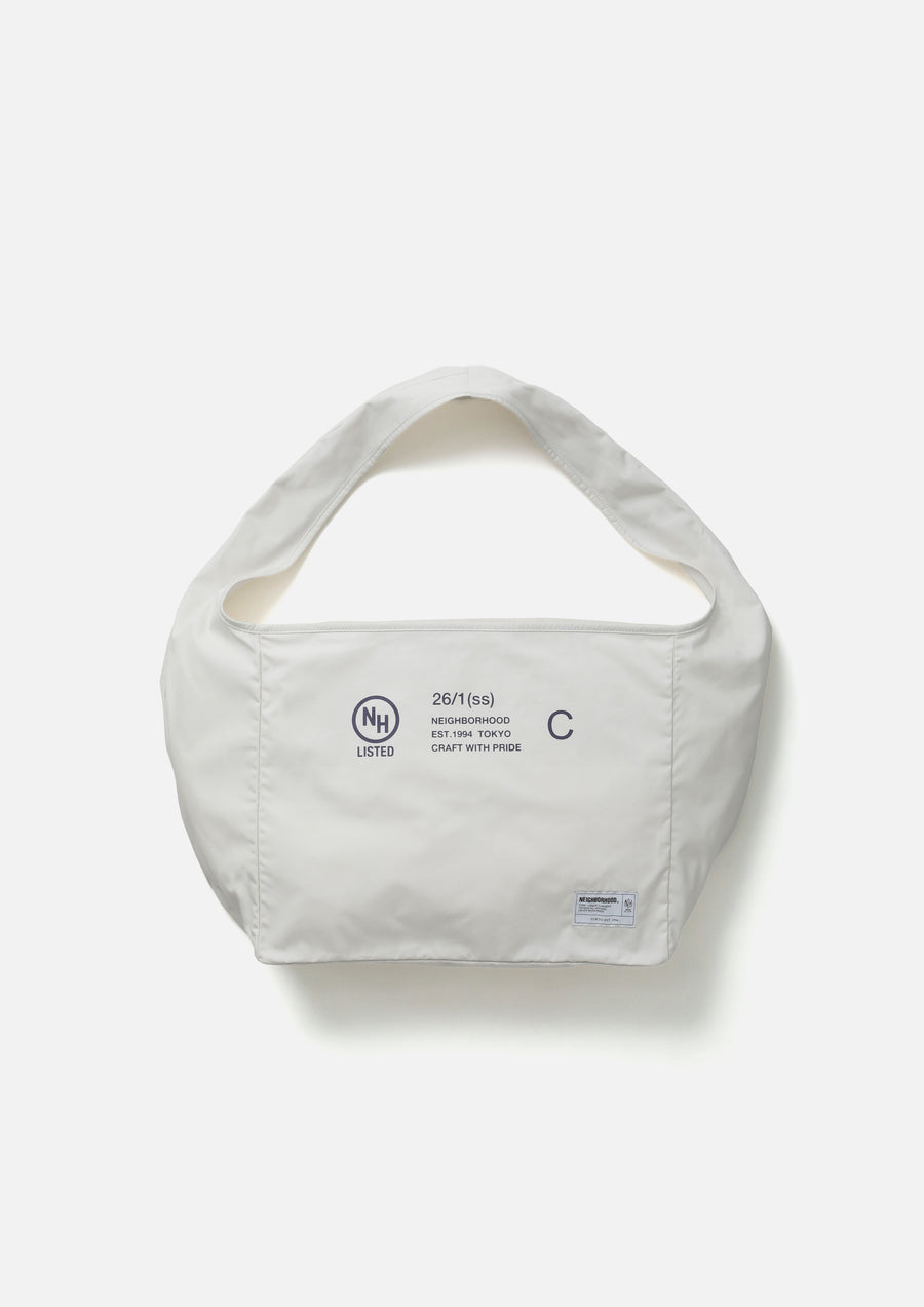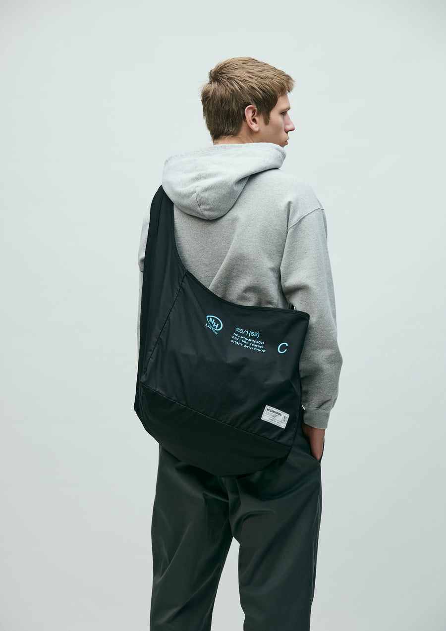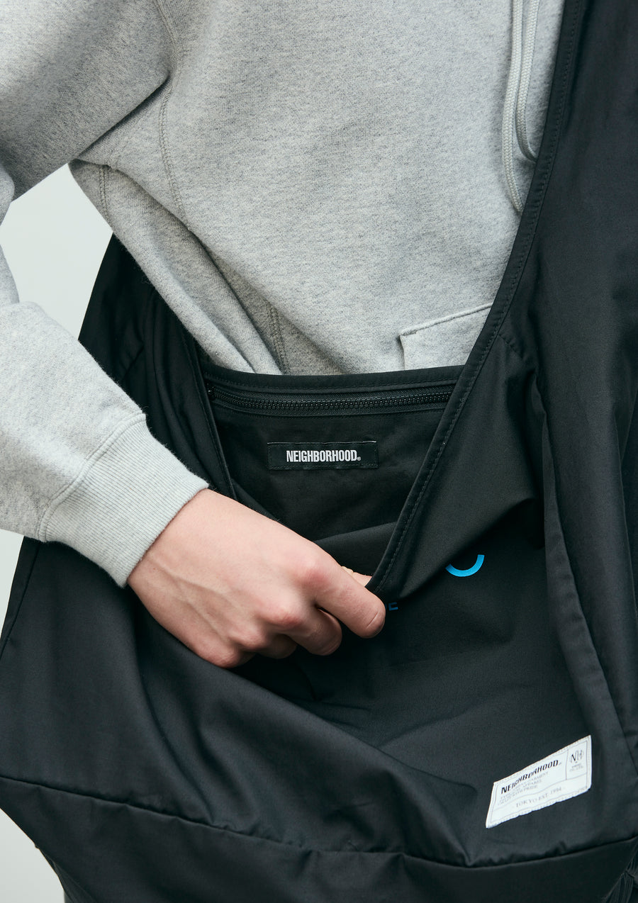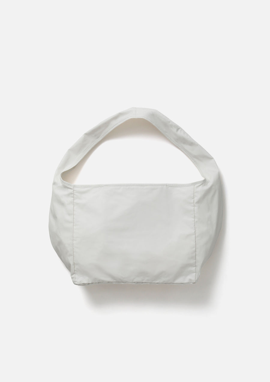 Newspaper bag made from medium-weight weather fabric with a balanced structure, offering both firmness and a soft texture while remaining lightweight. Features an interior zip pocket for convenient small-item storage. Designed with a wide gusseted silhouette, making it practical for everyday use as well as travel. Finished with a brand tag on the front.