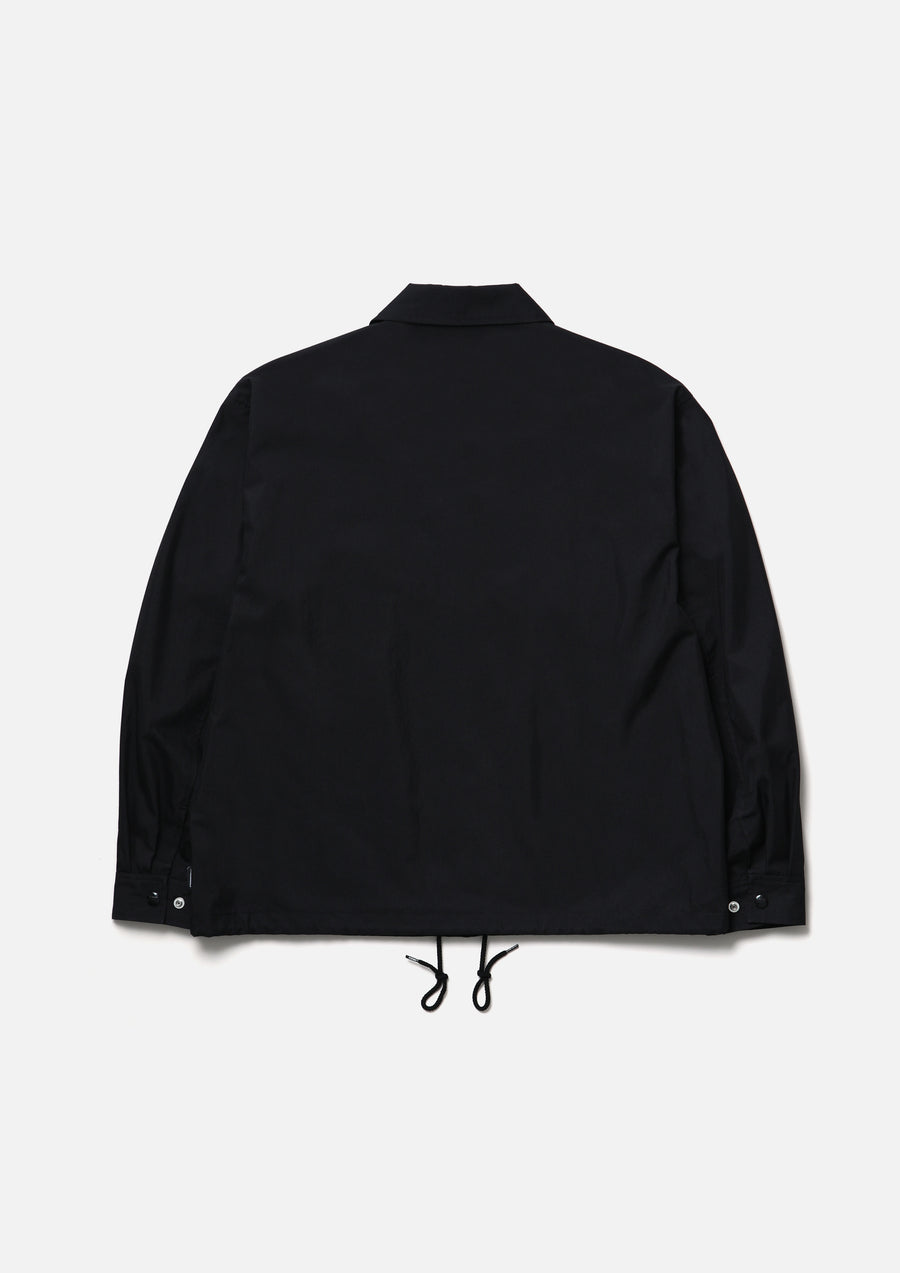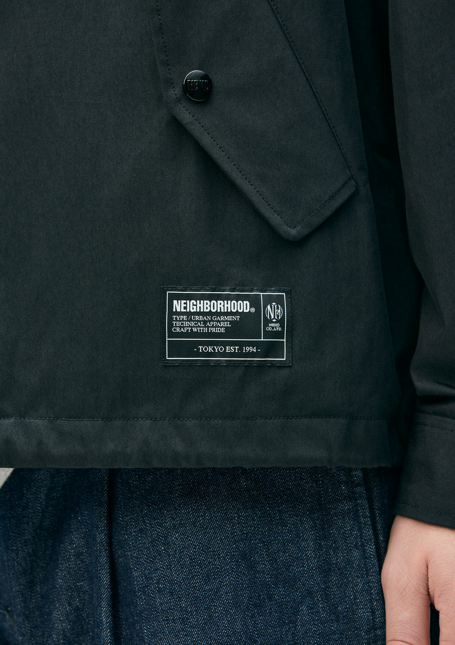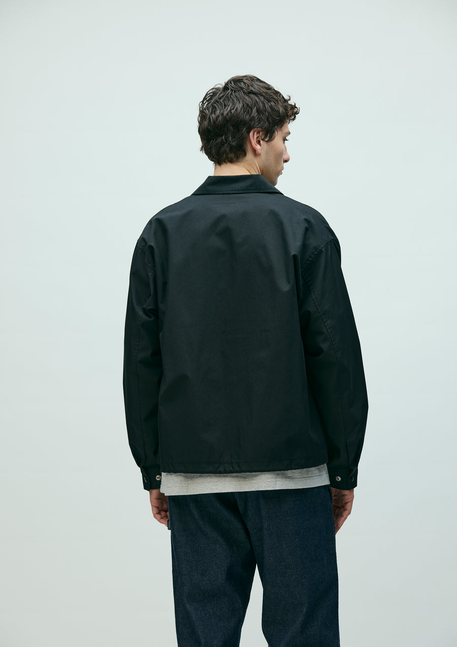 Windbreaker jacket made from a cotton/nylon blended gabardine fabric with a special treatment that gives it a dry, matte texture. Features buttoned flap pockets on both sides and an adjustable drawcord built into the hem. A logo is embroidered on the left chest. Finished with original snap buttons and a jacquard lining. A brand tag is attached at the left hem, and a woven side label is placed at the side seam.