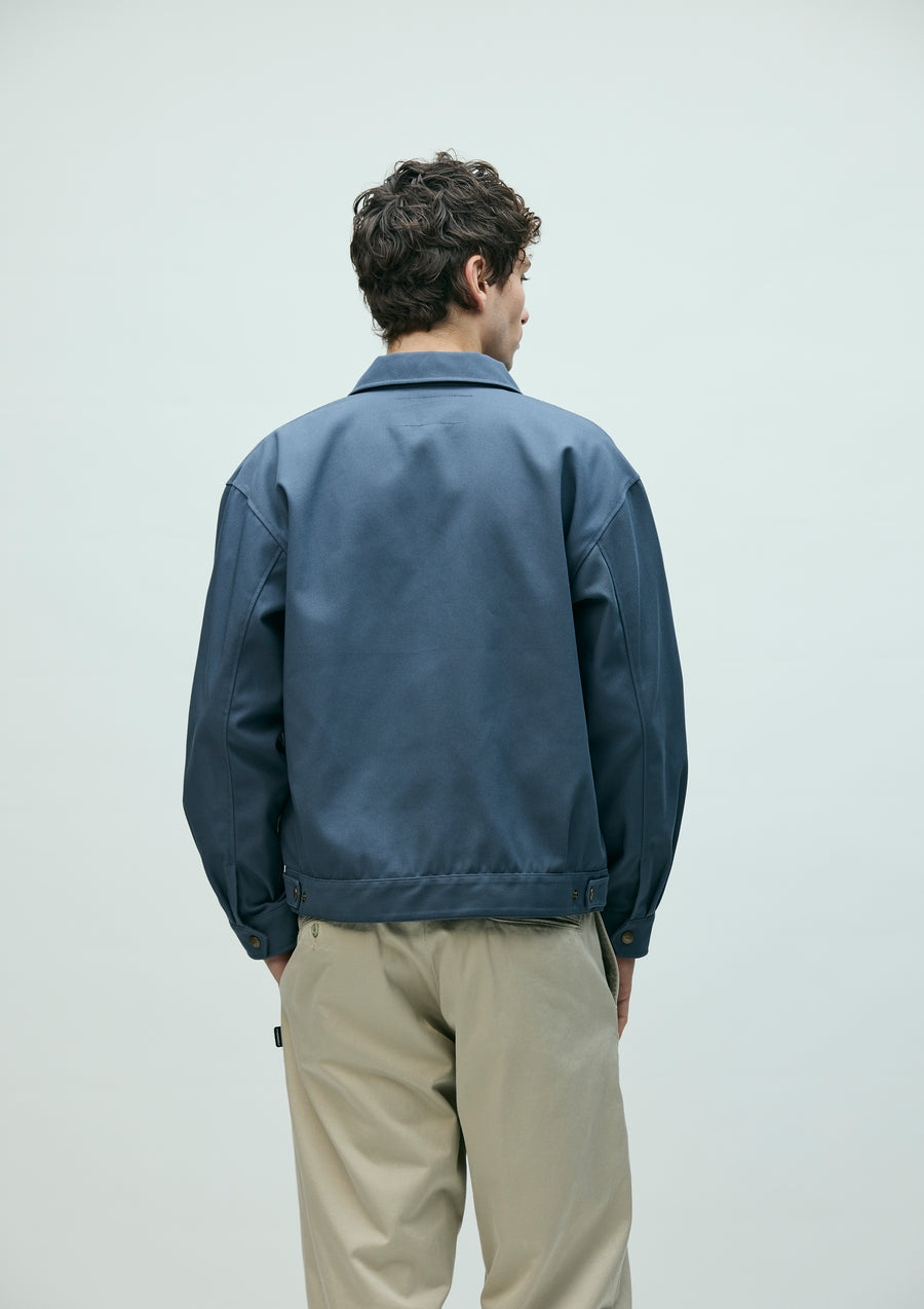 Zip work jacket made from a medium-weight T/C Katsuragi twill fabric with a dry touch and crisp texture. Features buttoned flap pockets on the front and distinctive adjustable tabs on the waistband. Detailed with chain embroidery on the right chest and a printed patch on the left chest. Finished with original snap buttons and zipper pulls. A brand tag is placed at the left hem, and a woven side label is attached at the side seam.