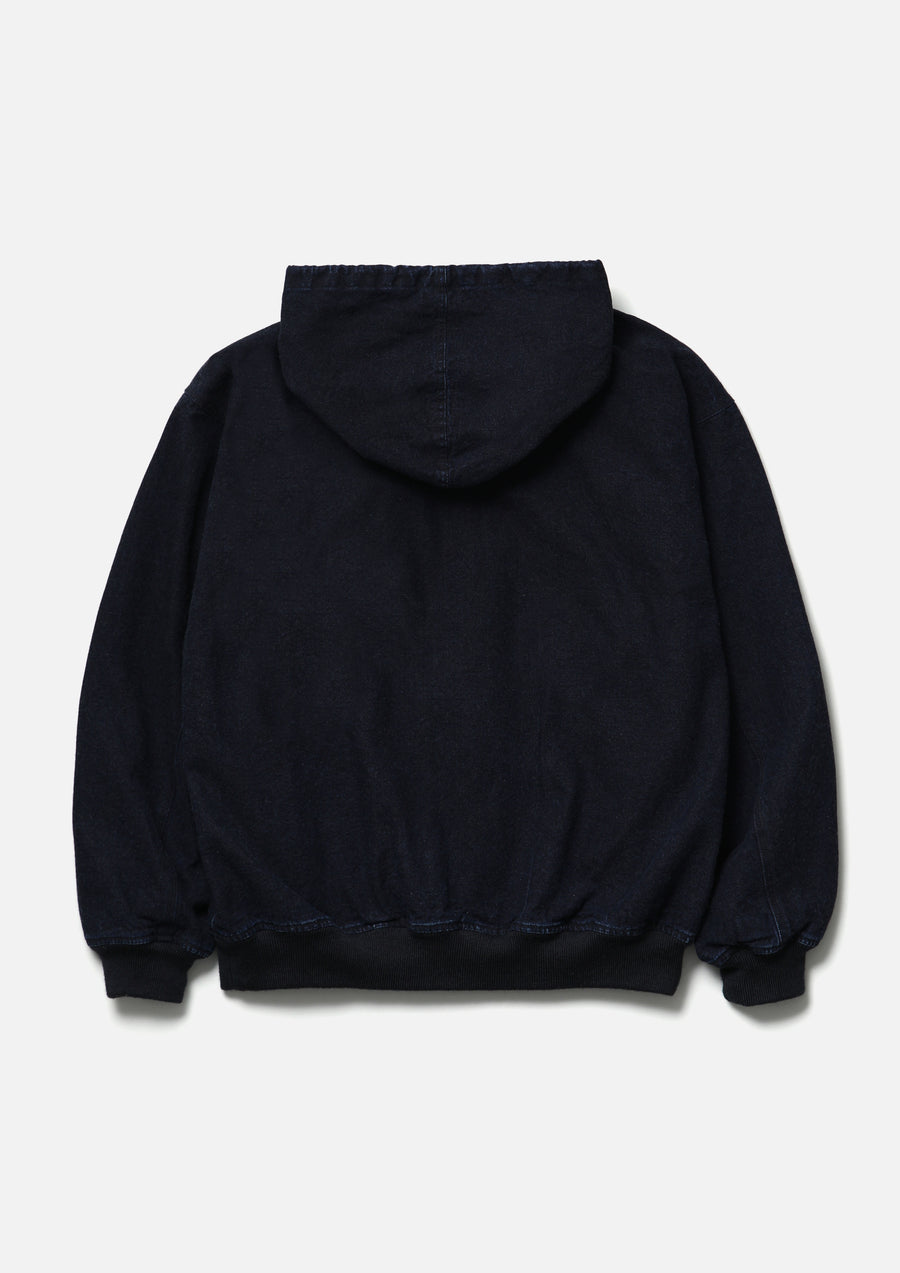 Zip Hooded Jacket made from oxford fabric, treated with a bio-stone wash for a naturally faded look. Features embroidered logo detailing on the left chest and original zipper pulls. A woven side label is attached at the side seam. Lined with a polyester/cotton blended weather cloth for smooth wearability.