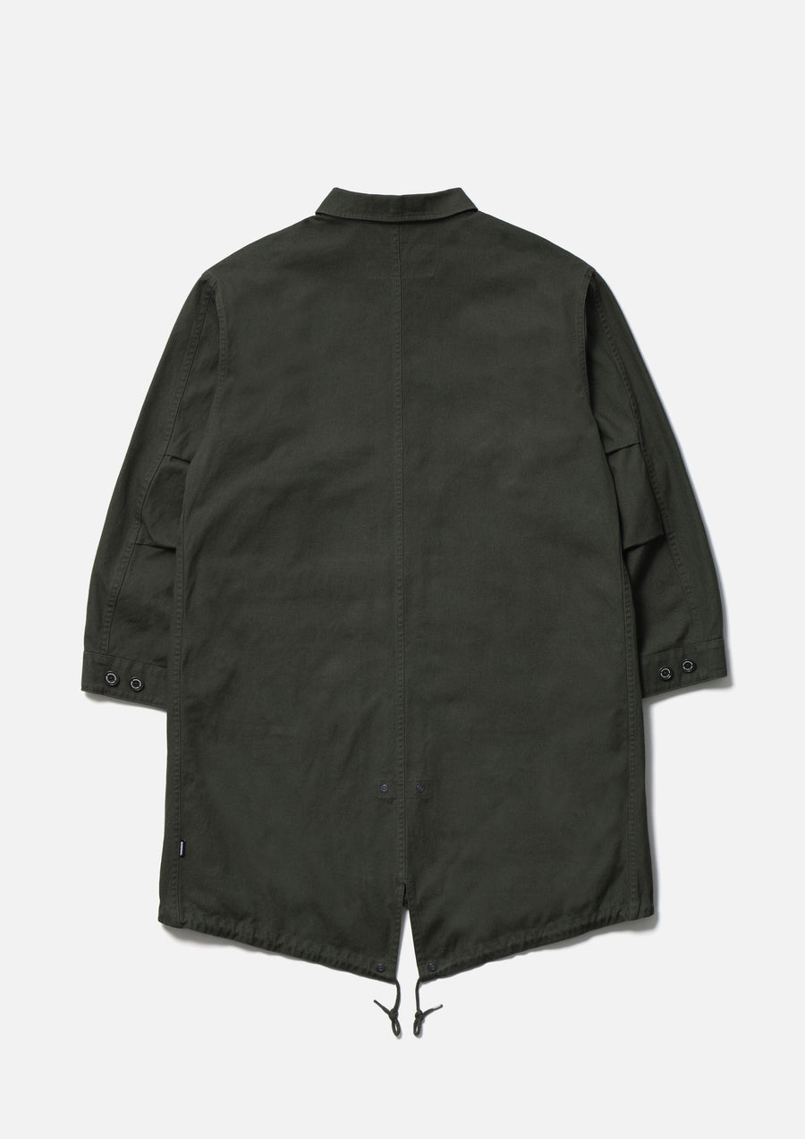 Modified field coat combining elements of a bal-collar coat and a hunting jacket. Made from durable yet easy to wear No.11 heavyweight canvas fabric. Features distinctive 3D dual pockets on the front and a fishtail hem. Finished with original buttons. A brand tag is attached to the pocket, and a woven side label is placed at the side seam. Completed with a one-wash finish.